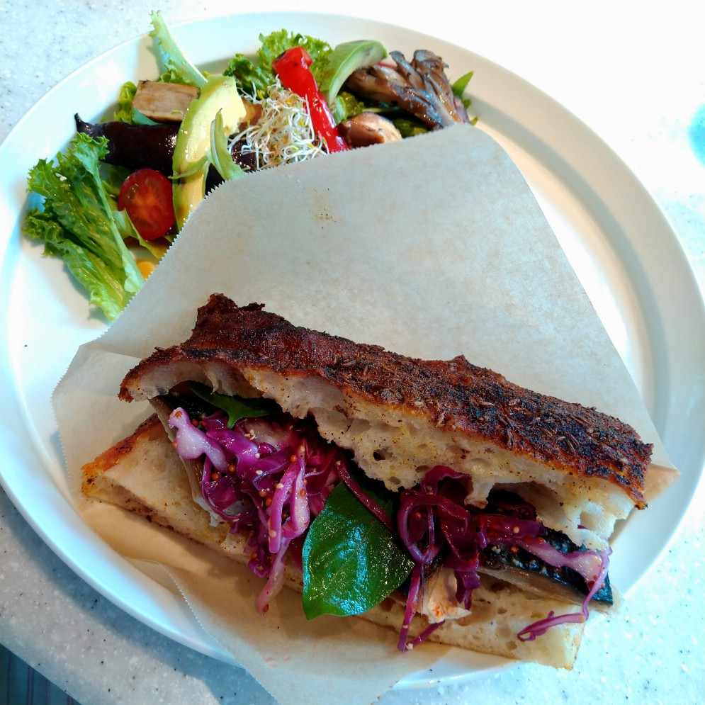 サバサンドにサラダが添えられ、国産の良質な食材にこだわっていることもあり