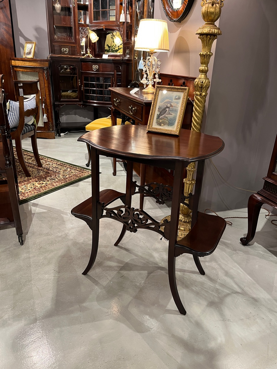 すらりとした脚と、棚板を繋ぐ中央の繊細な透かし彫りが、空間に軽やかな雰囲気をもたらします。