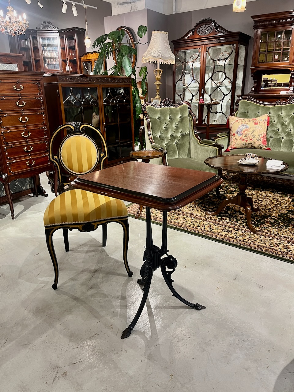特に脚部は、マットブラックのアイアン素材が優美な曲線を描いており、中央の支柱や三つに分かれた脚元に施された繊細な装飾が、