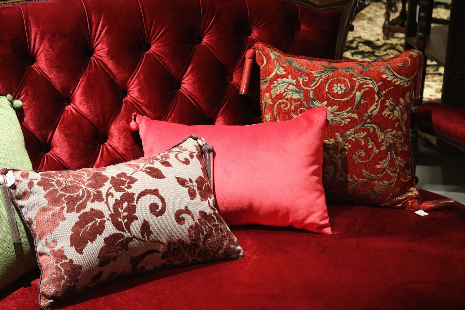 こだわりのファブリックで製作されたタッセル付きの色とりどりのクッション。