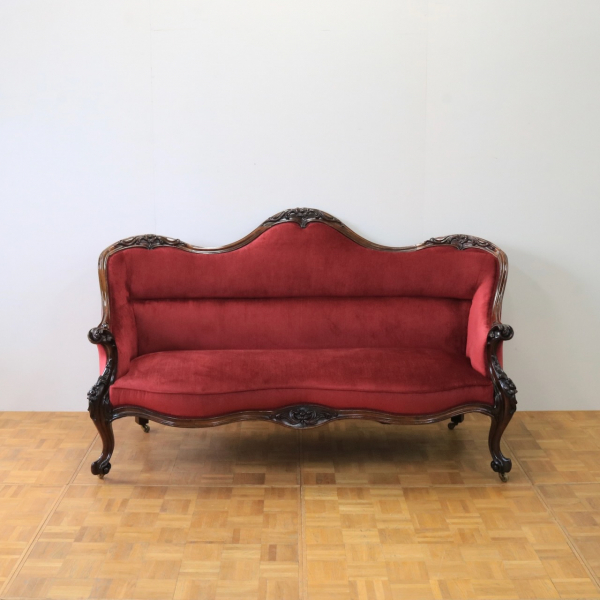 内部には深紅のベルベットの生地で、その縁には装飾的なブレードが丁寧にあしらわれており、当時の上流階級の美意識と品格を感じさせます。