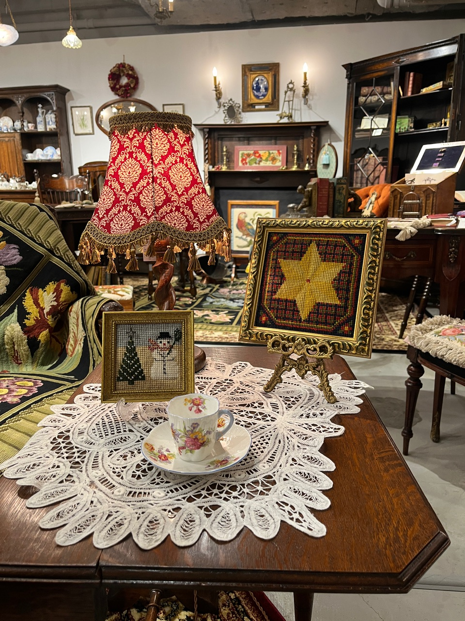 テーブルの上を飾るのは、繊細なドイリーと可憐なティーカップ、そして目を奪われるニードルワークのアート。