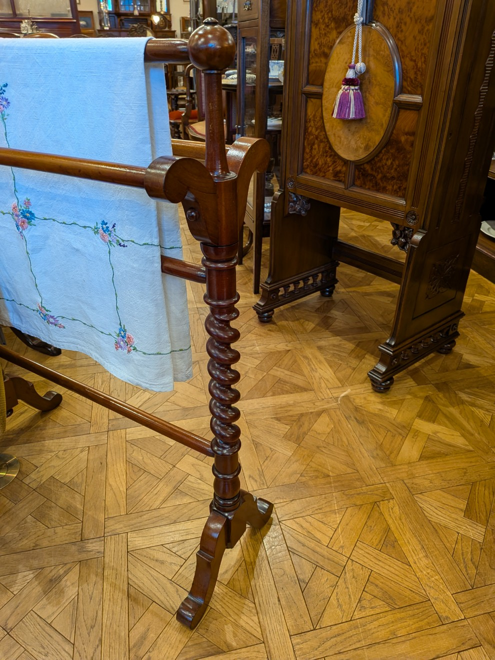 お店にあるのはタオルホースですが、バーリーシュガーツイストはテーブルやチェアーなどイギリスのアンティーク家具に多く取り入れられています。