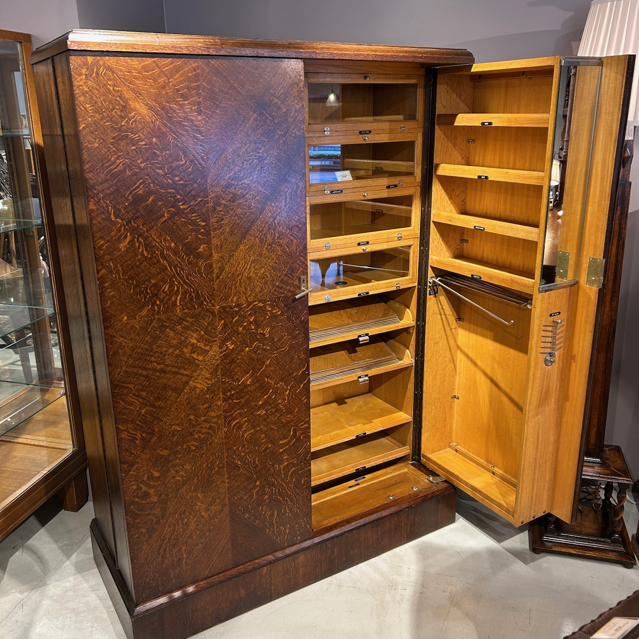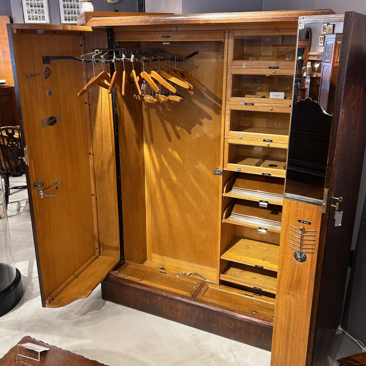 内部には「SHIRTS」「PYJAMAS」「SPORTSWEAR」など用途ごとに分けられた収納が設けられており、ネクタイ用のラックなども備えられています。