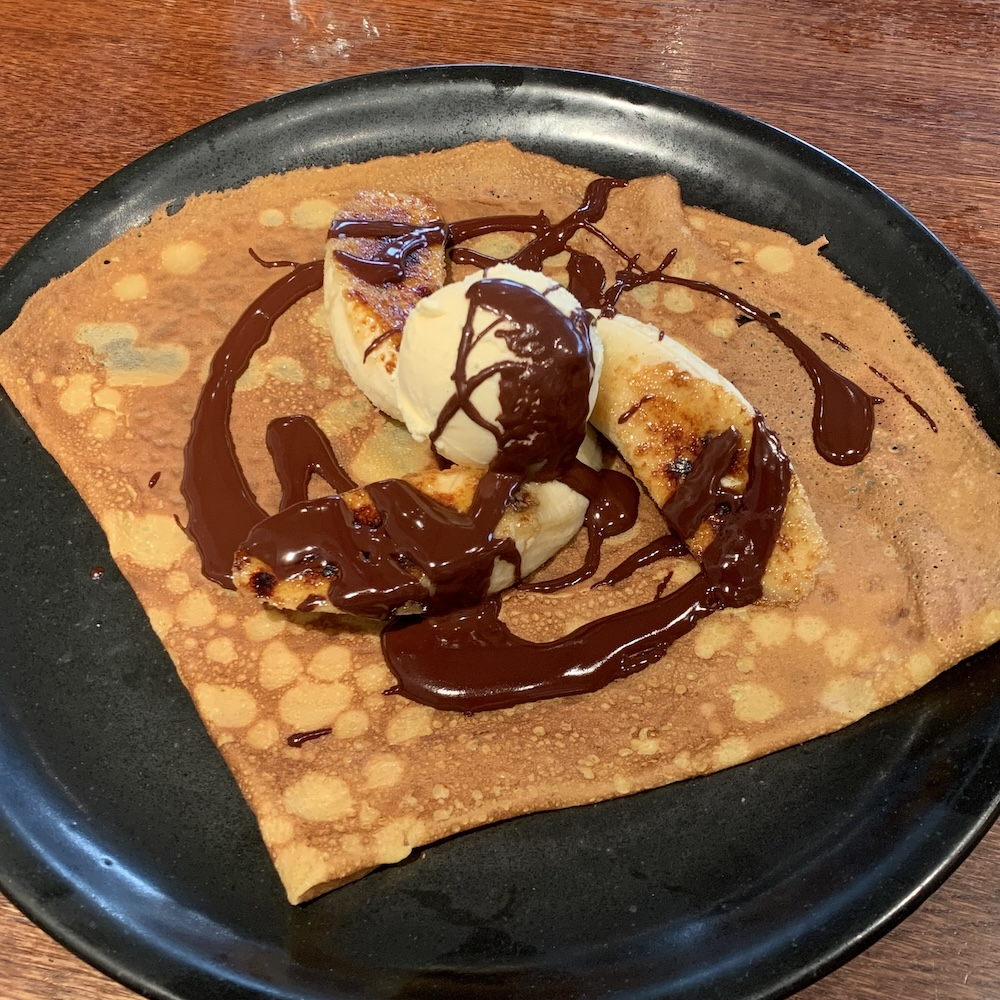 メニューが豊富で色々と迷ってしまいますが、カフェ時だったので定番のチョコバナナクレープをいただきました。