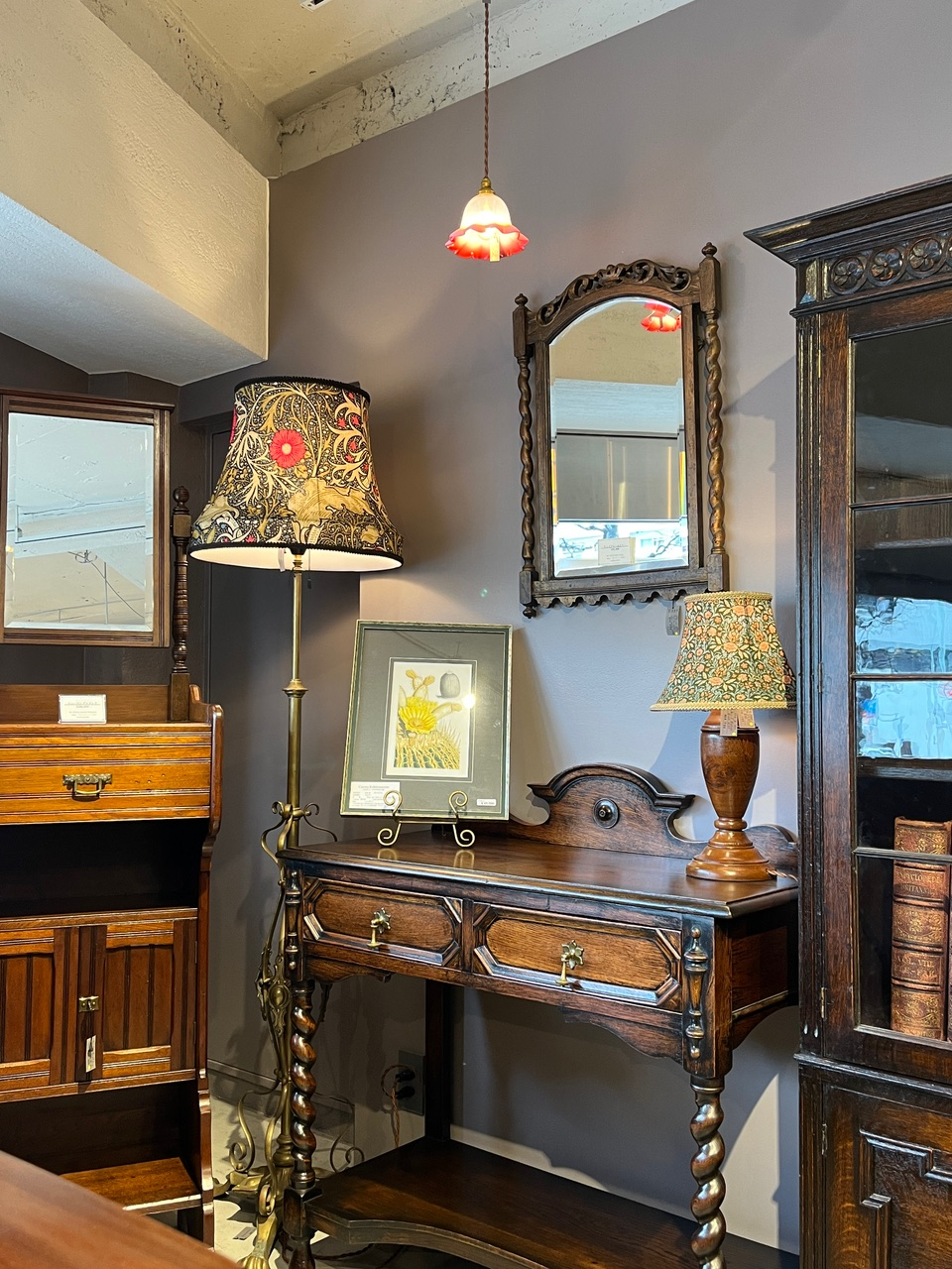 重厚感あふれるオーク材を使用し、バーリーシュガーツイスト(ねじり脚)が目を引く一台。