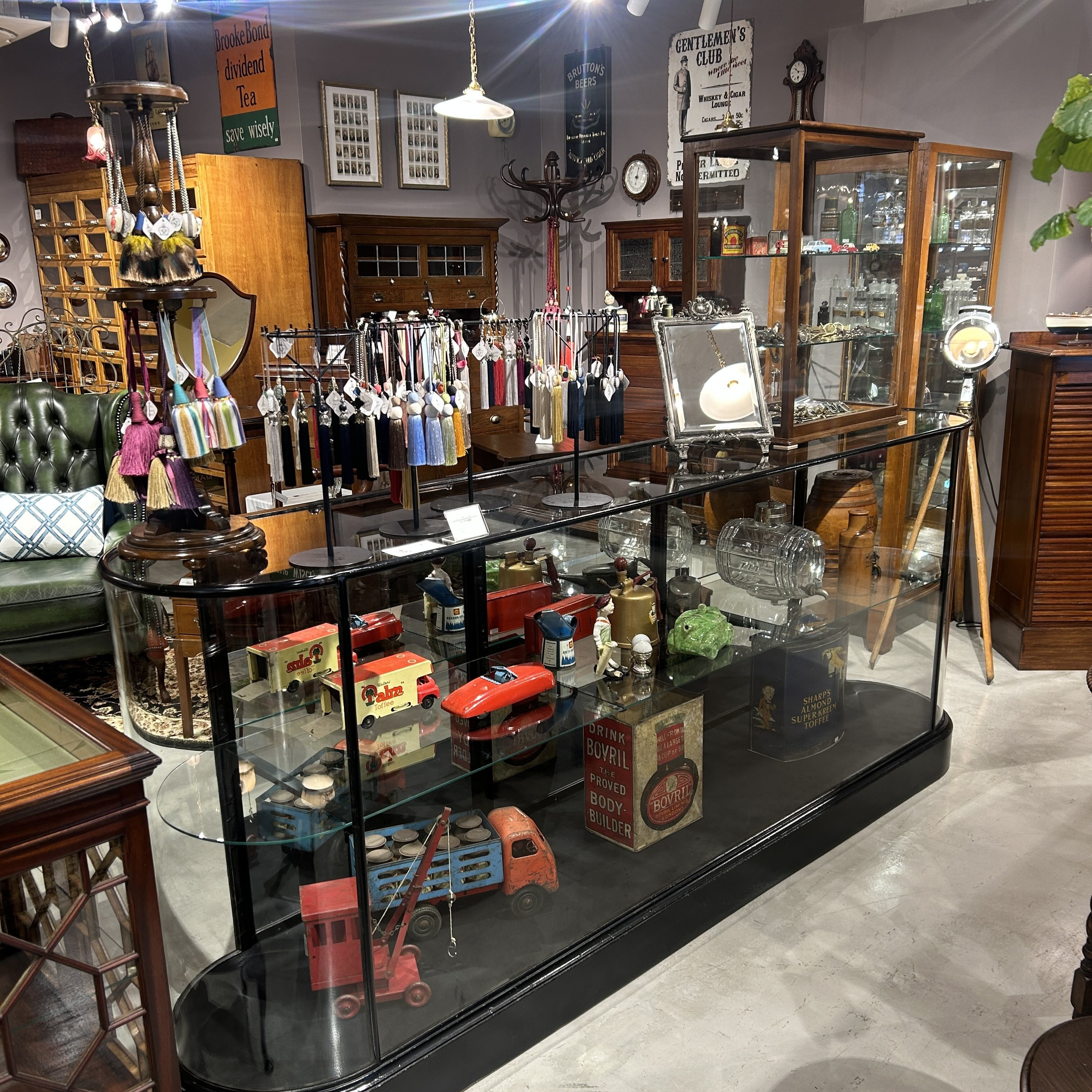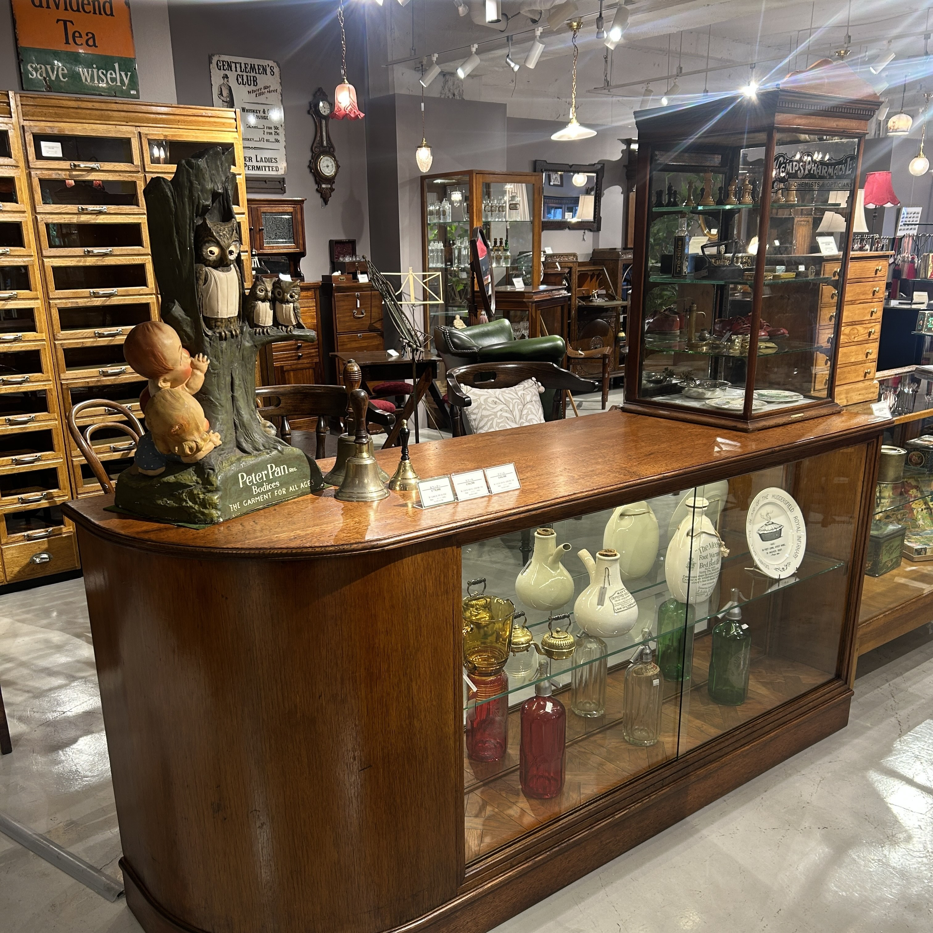 倉庫スタッフが加工をしてくれたカウンターをはじめ、大きなシャツキャビネットや、4面ガラス張りのグラスキャビネットなど雰囲気のある家具が並んでいます。