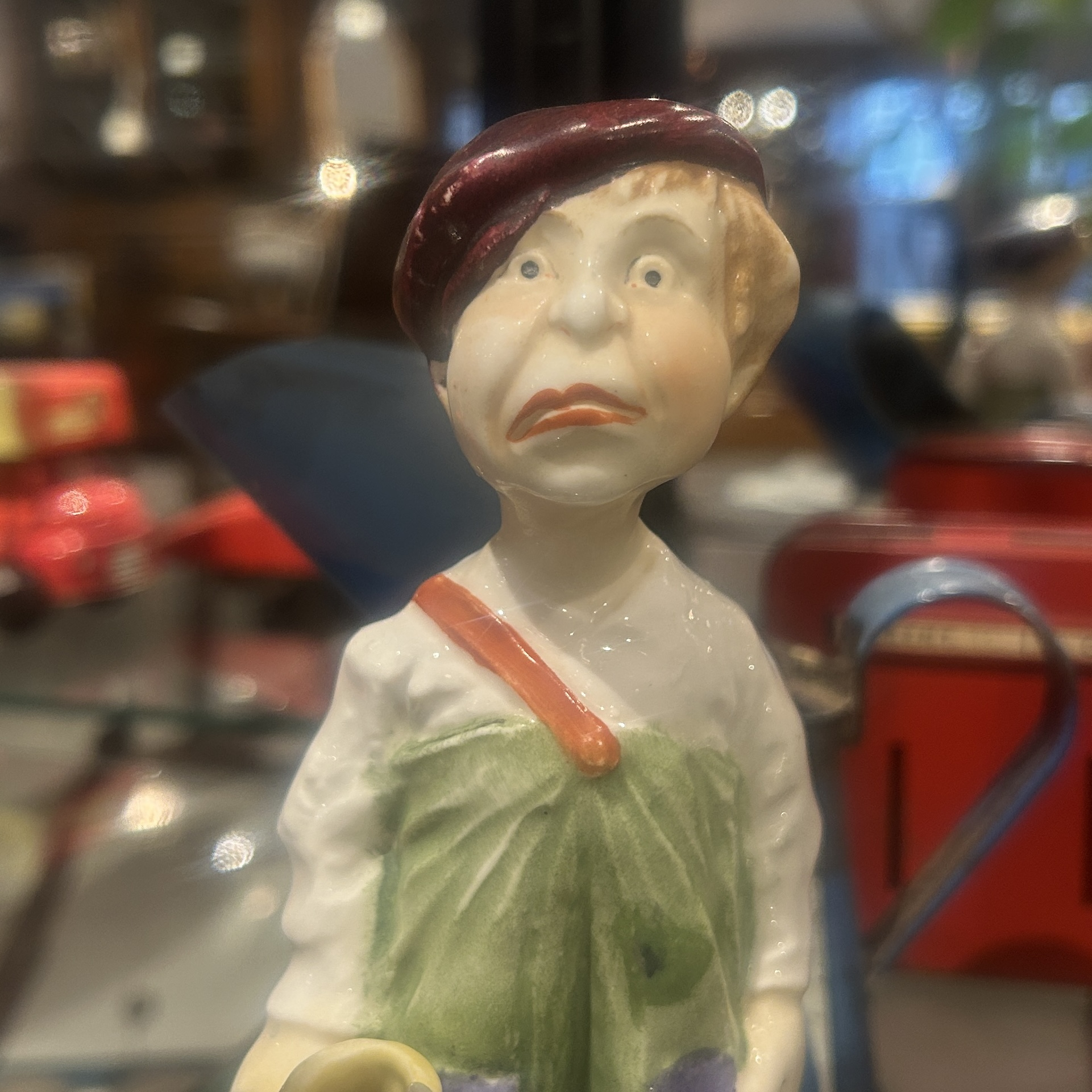 赤いベレー帽、白シャツの上に緑のオーバーオールというファッションセンス。