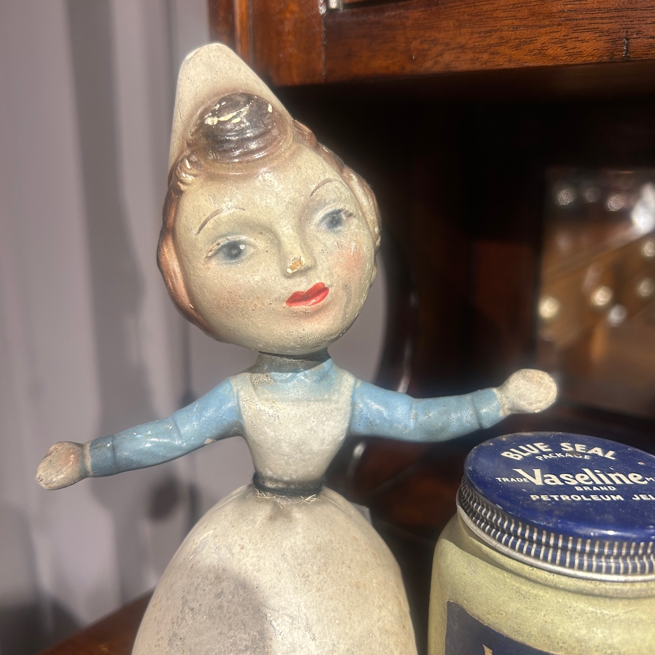 両手を広げ、商品を紹介している女性の人形はクラシックスタイルのカールヘアに清潔感のあるドレス姿。