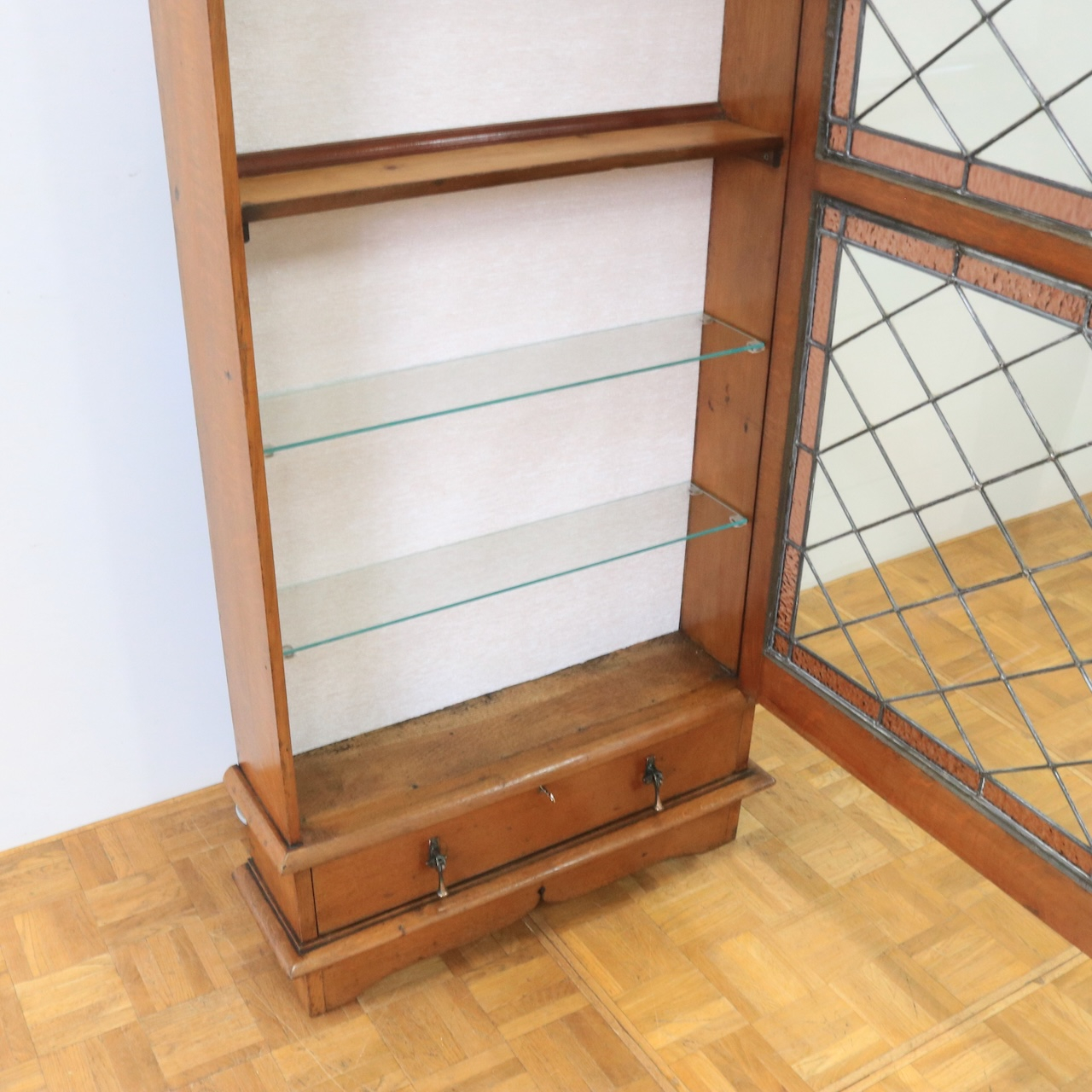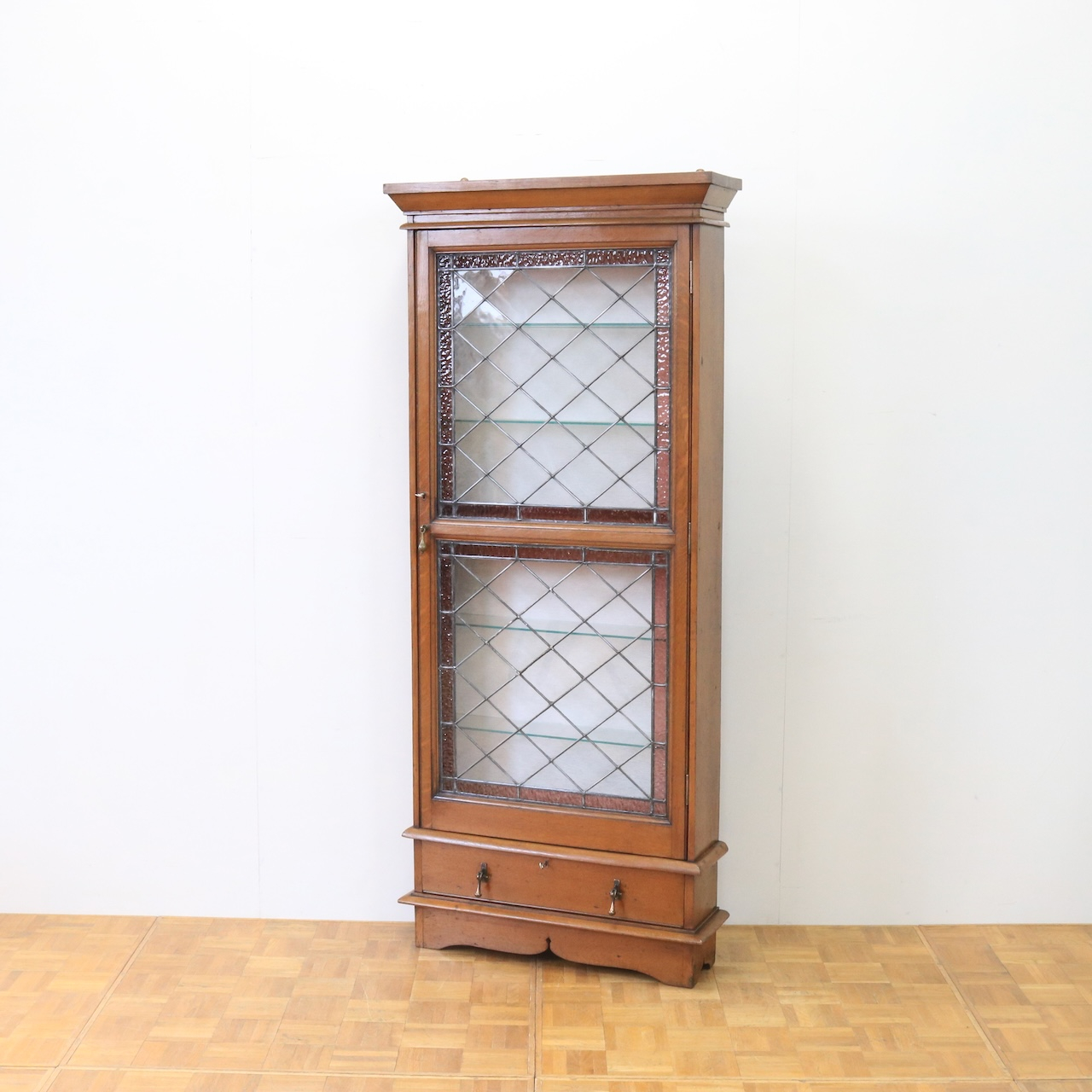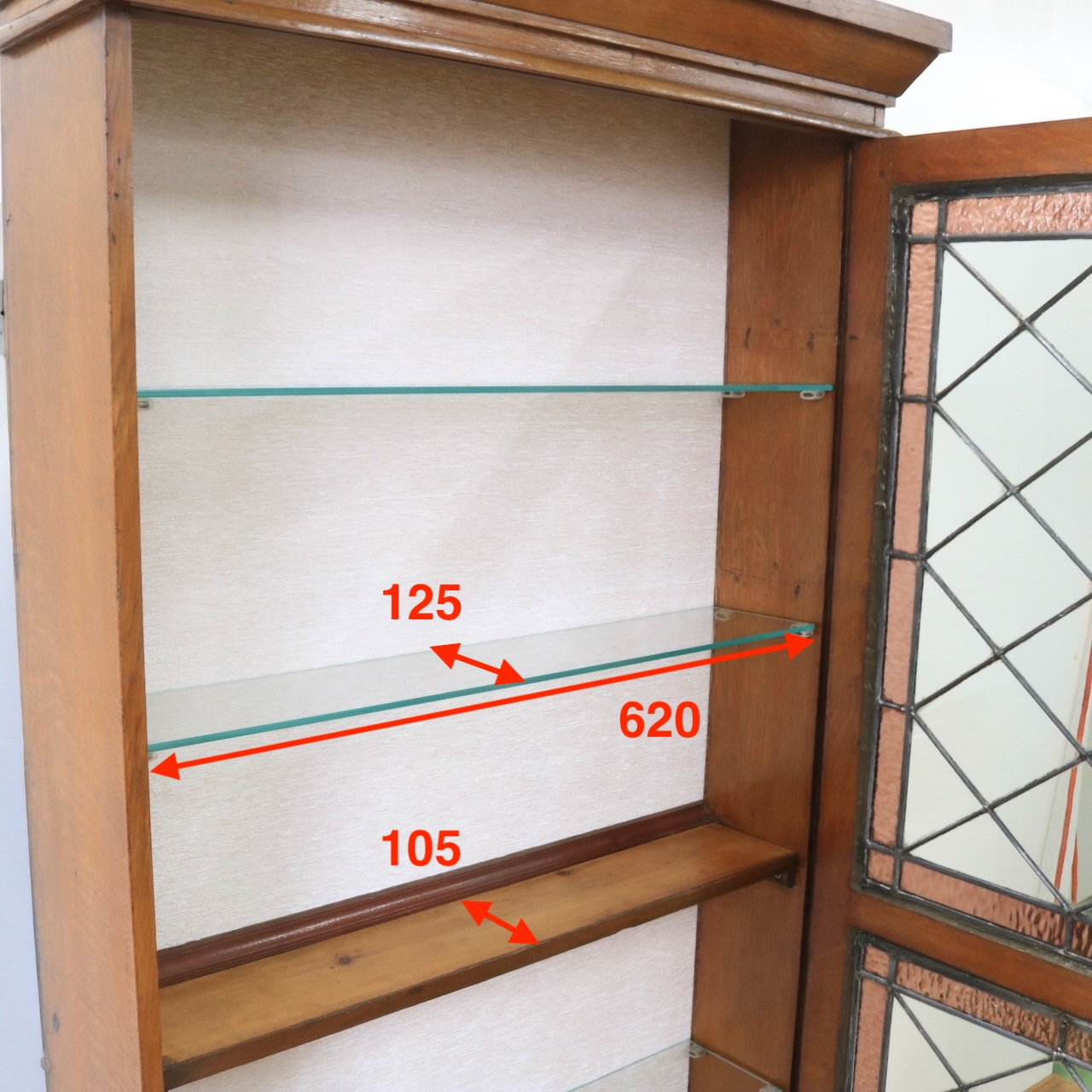 オーク材のグラスキャビネット。ステンドグラスの扉が一際美しく、リーディットに囲まれた透明と紫色が光により表情豊かに見えます。奥行き浅めで圧迫感がないのも嬉しいポイント。