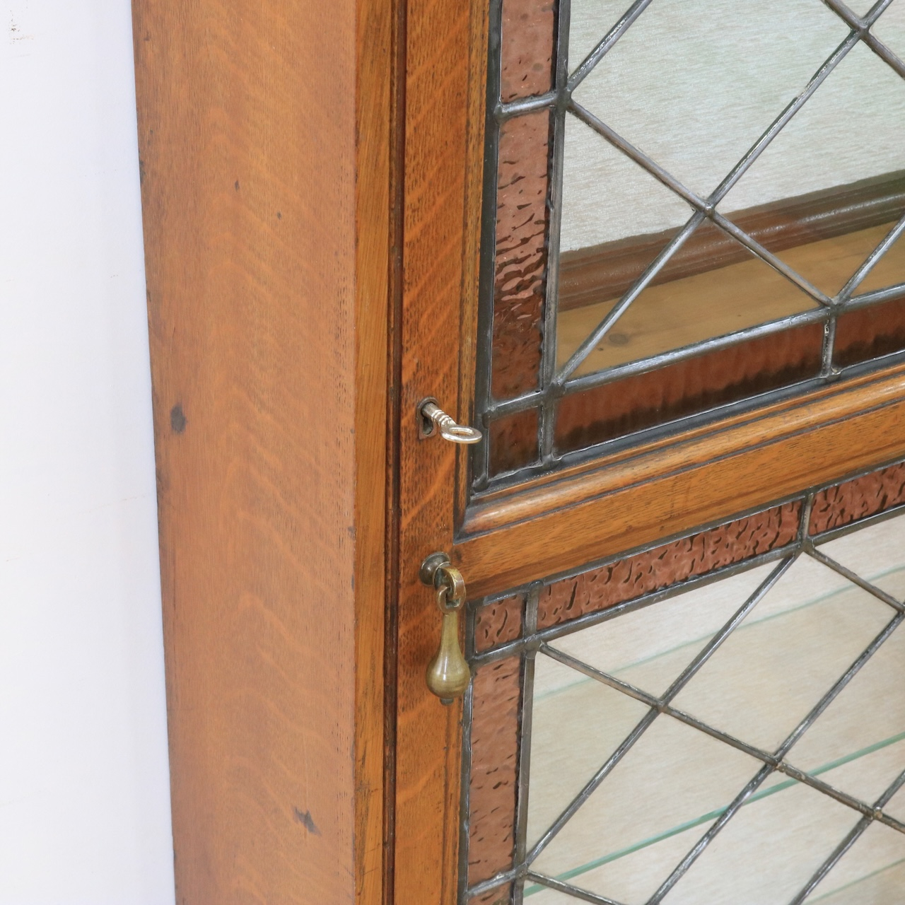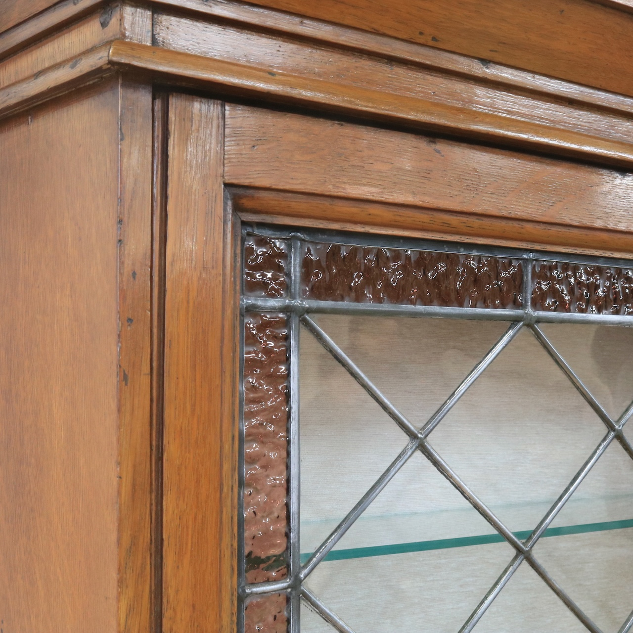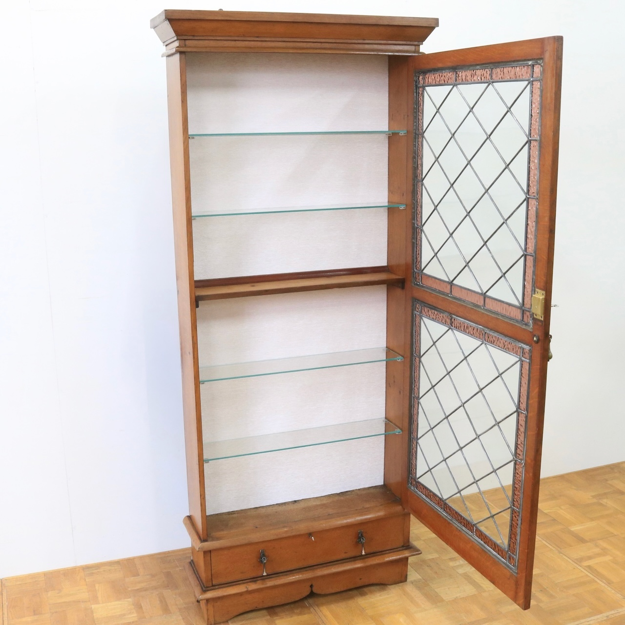 オーク材のグラスキャビネット。ステンドグラスの扉が一際美しく、リーディットに囲まれた透明と紫色が光により表情豊かに見えます。奥行き浅めで圧迫感がないのも嬉しいポイント。