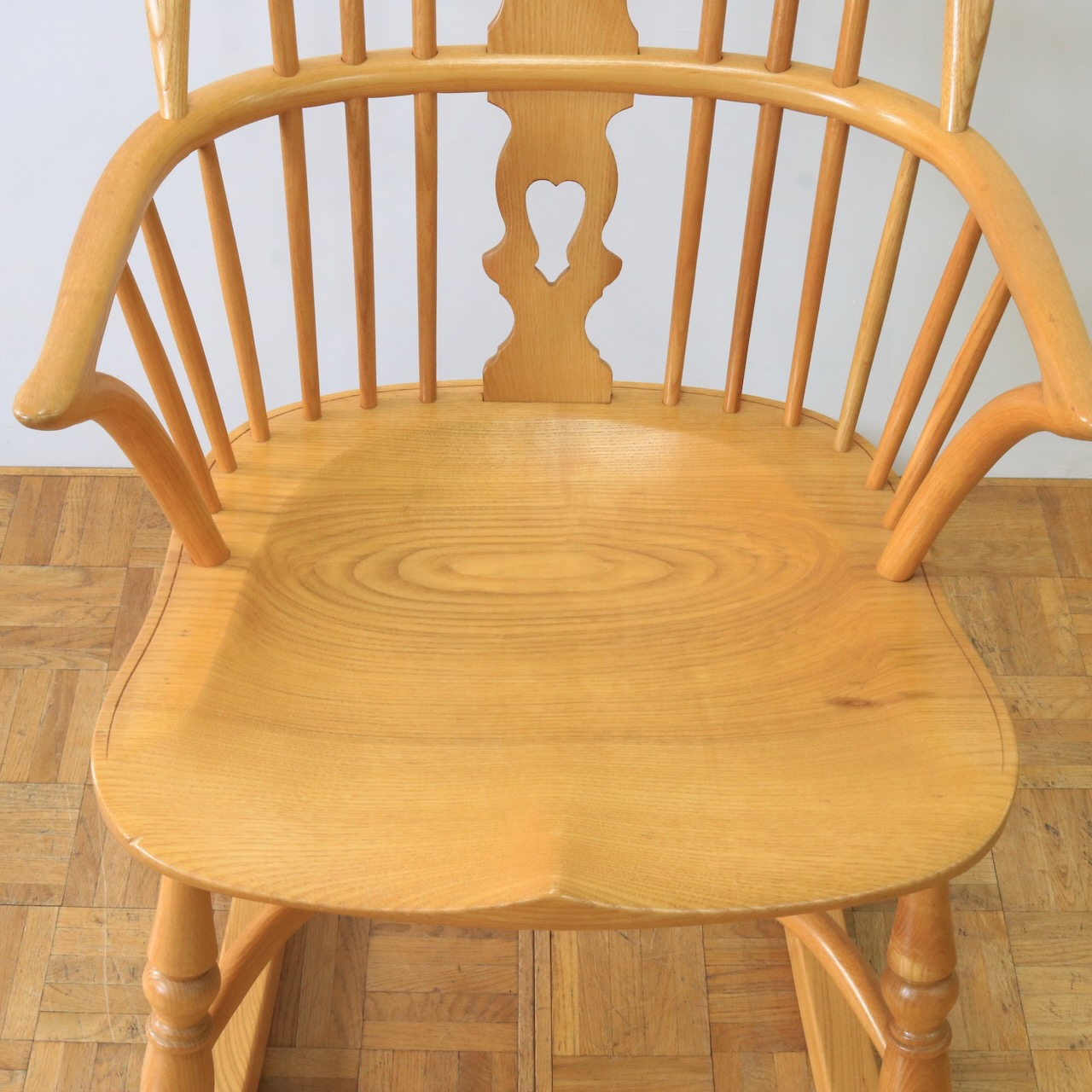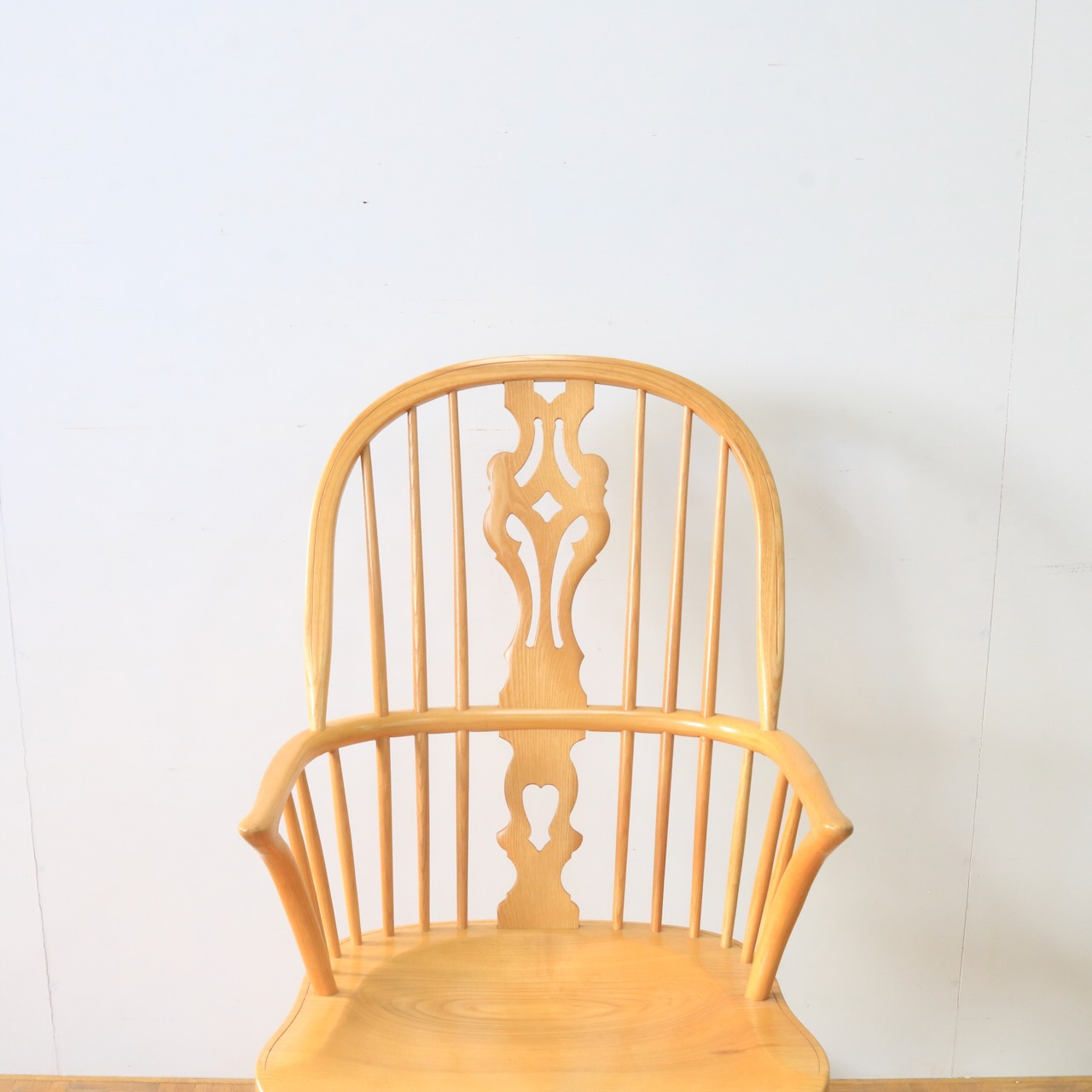 明るい色味で温もりあるアームチェアー。背やアーム、脚を繋ぐストレッチャーなど飽きのこないデザインです。