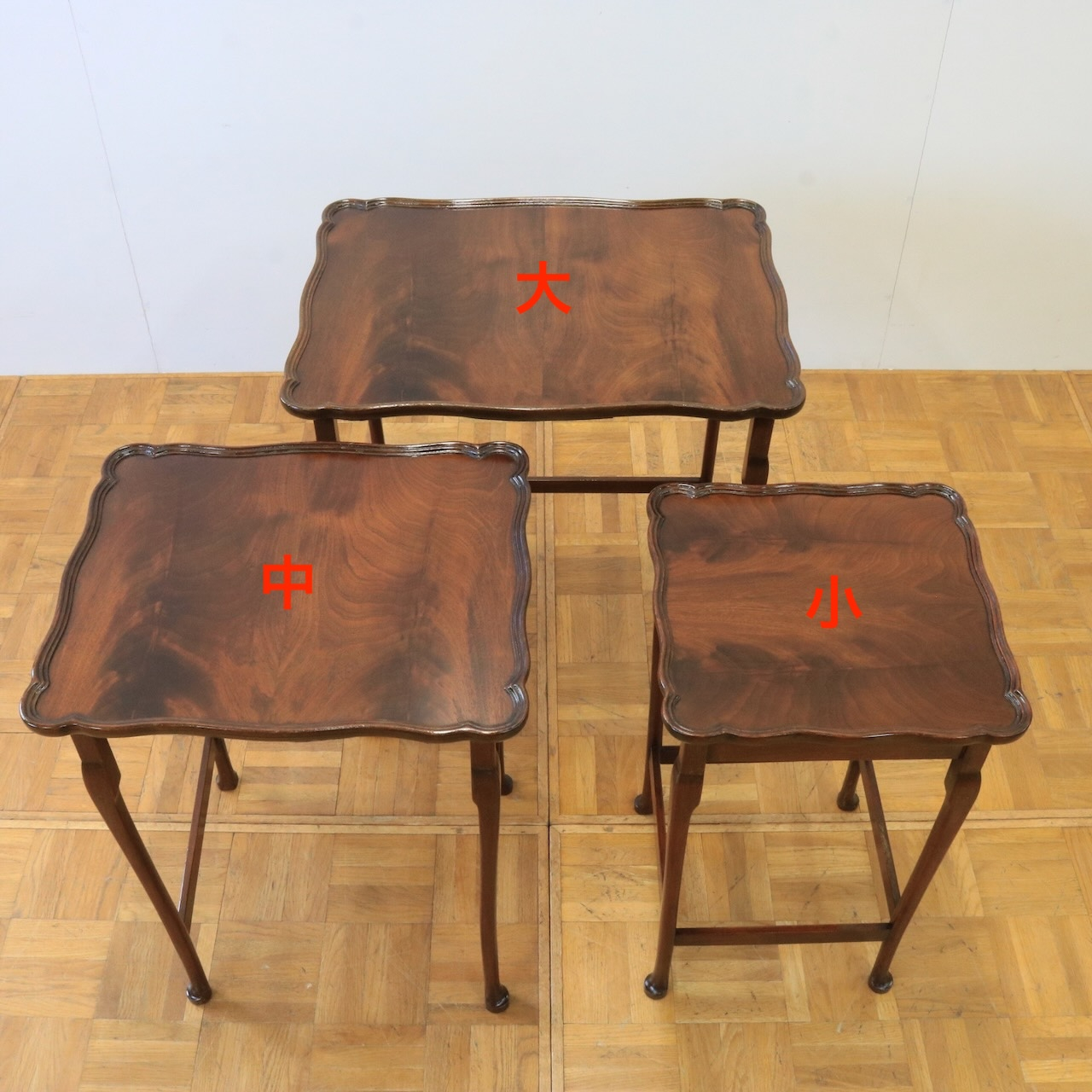配送料の目安 ▶︎1930年代、マホガニー材のネストテーブル。サイズ違いの3つのテーブルがワンセットになった、使い勝手の良いスモールテーブルセットです。来客時にも活躍する人気のアイテム。
