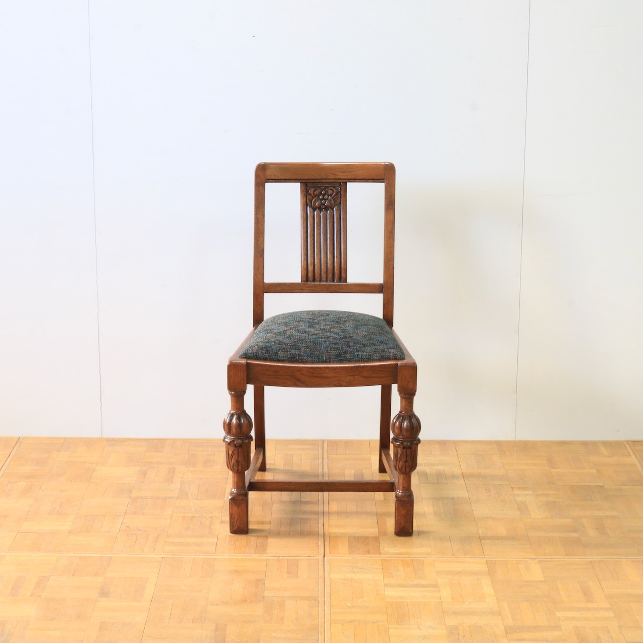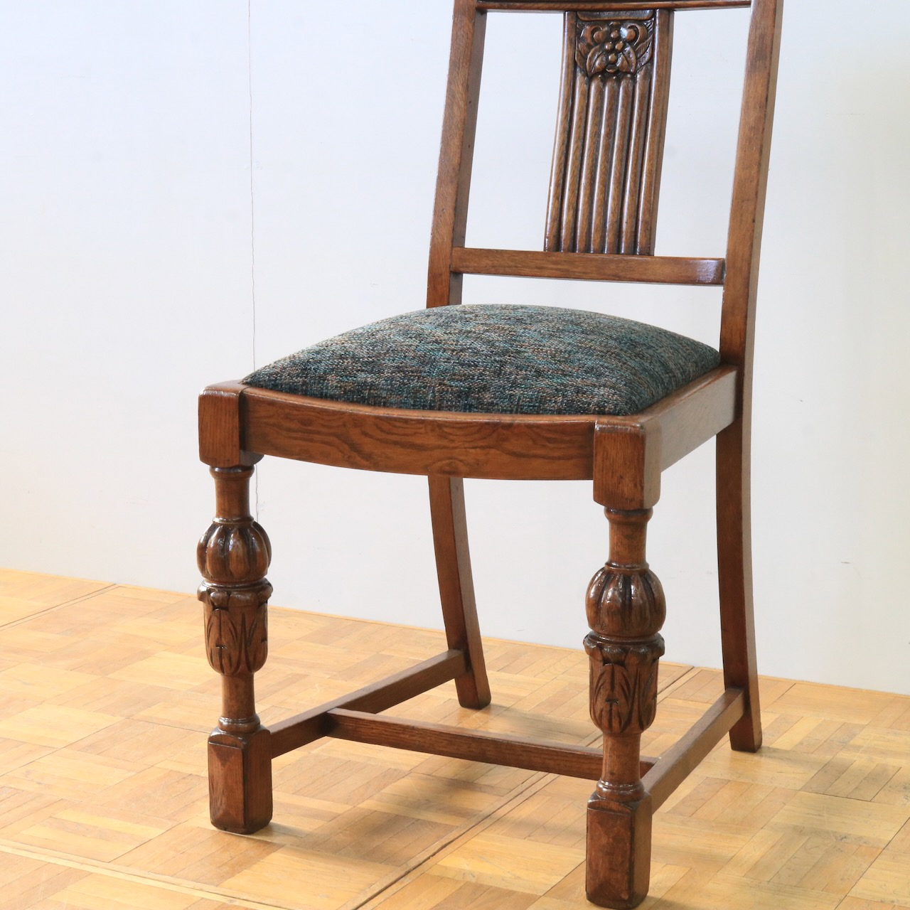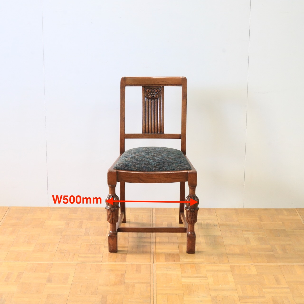 配送料の目安 ▶︎1930年代のオークチェアー。背もたれに入った植物と果実のモチーフや脚元の控えめなブルボースがアンティークならではの雰囲気を演出しています。食卓用にお使いいただける頑丈なつくりです。