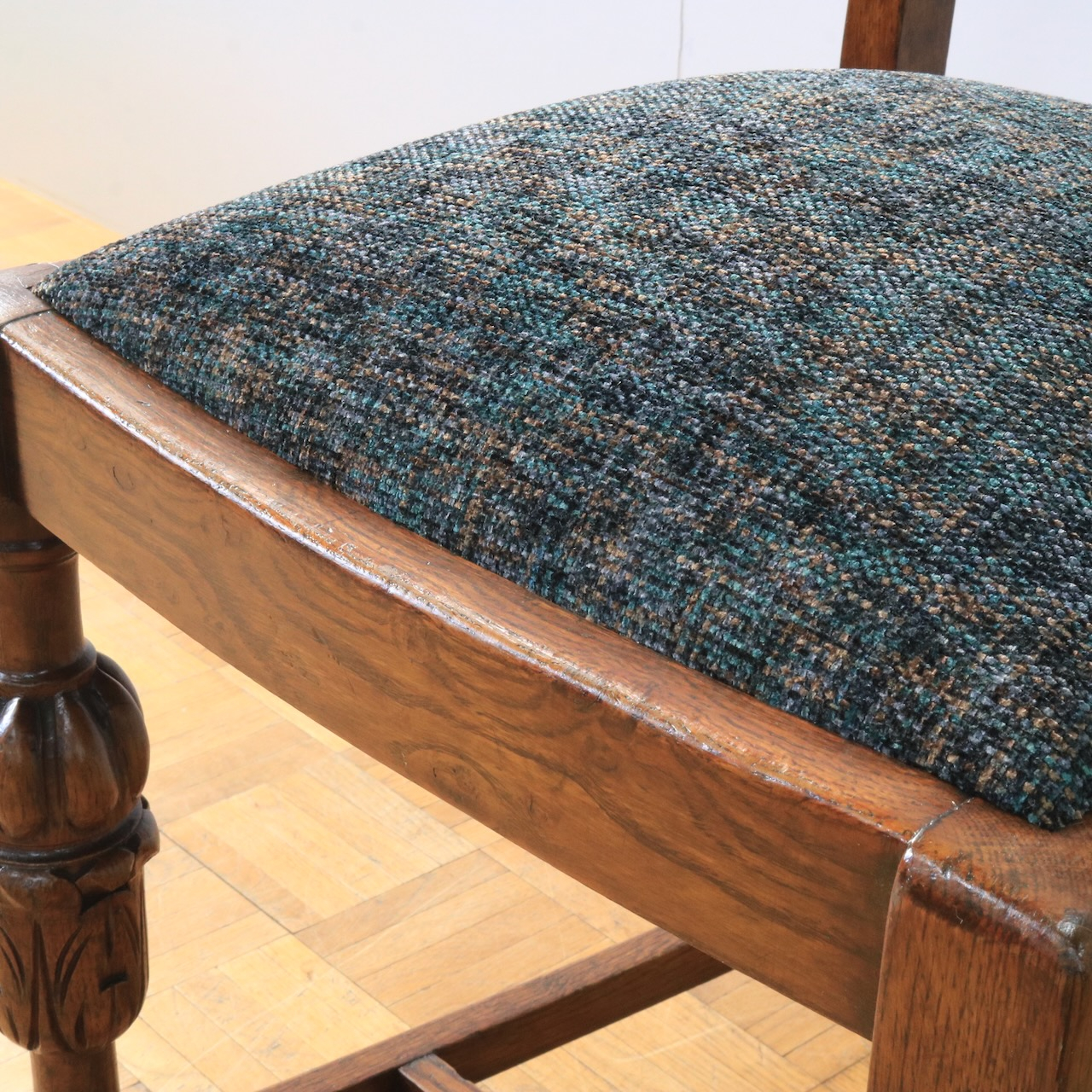 座面はざっくりとした質感の生地で張り替えました。汚れが目立ちにくく、毎日の生活の中で気兼ねなくお使いいただけます。
