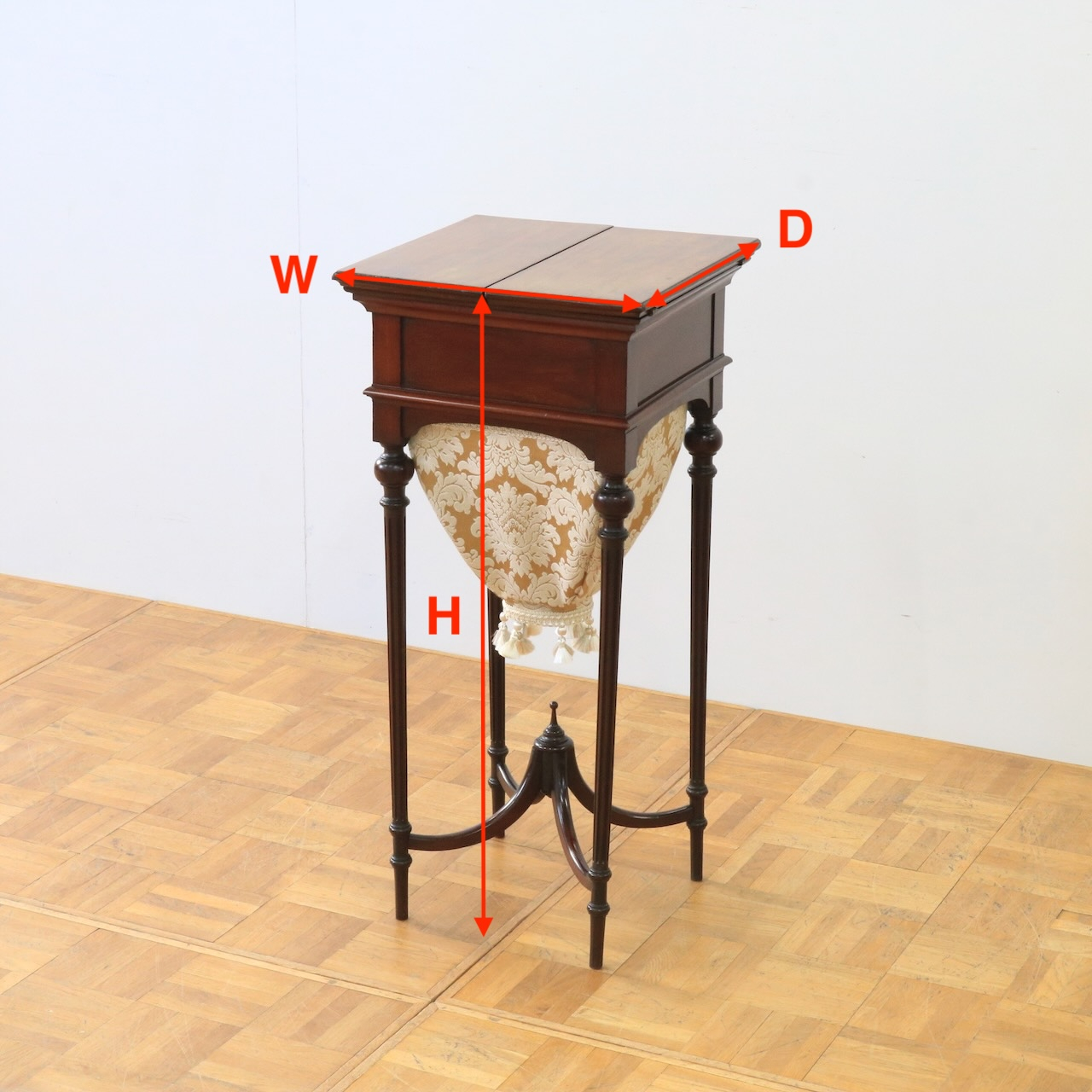 配送料の目安 ▶︎1900年代、マホガニーのソーイングボックス。繊細な装飾が美しく上品な佇まい。袋状の収納スペースがあるのが珍しい造りです。お裁縫箱としてはもちろんのこと、小物やアクセサリー収納としてもお使いください。