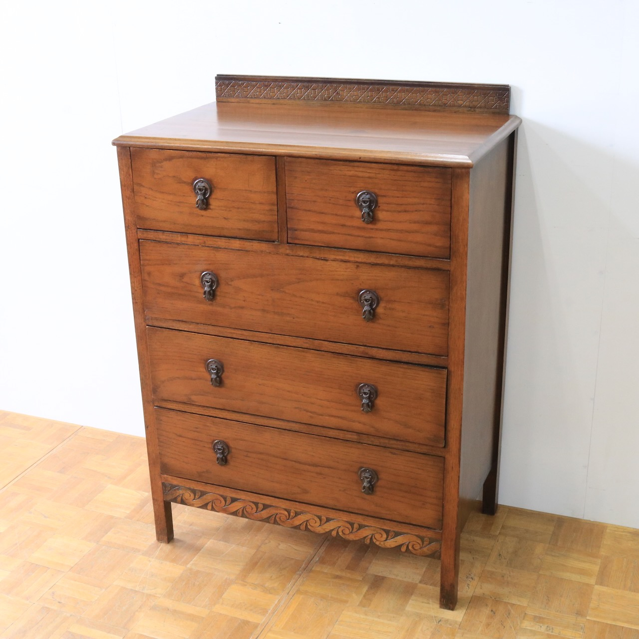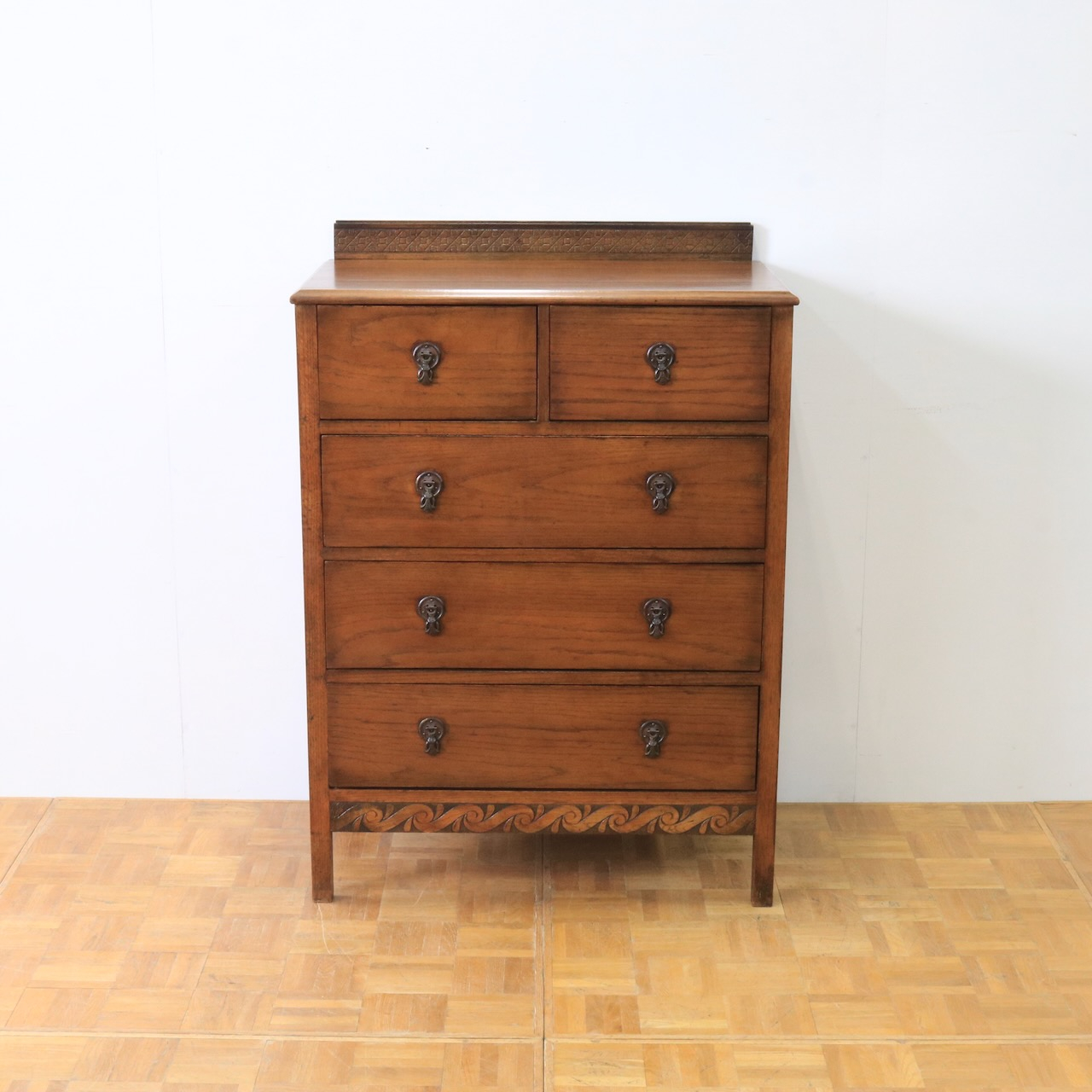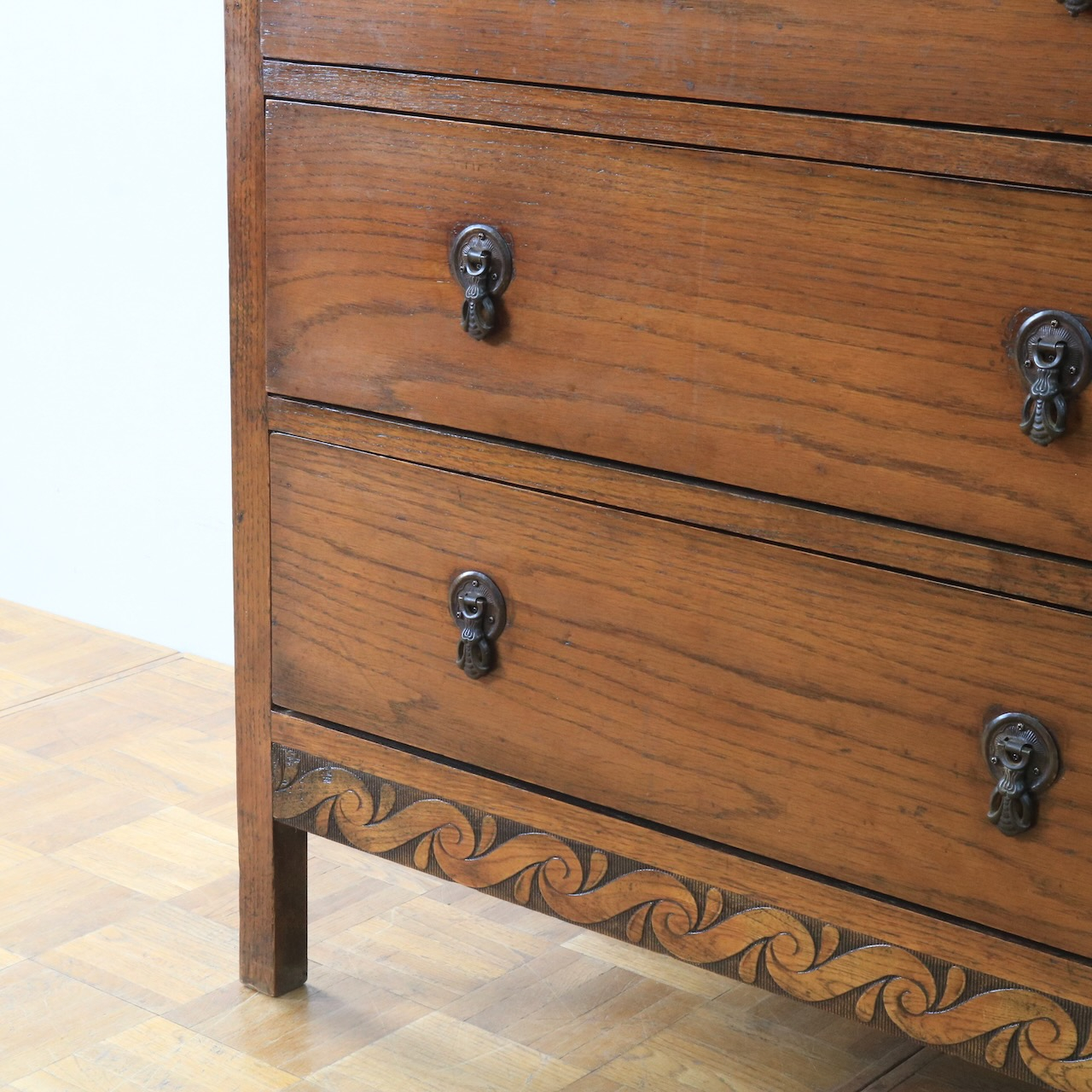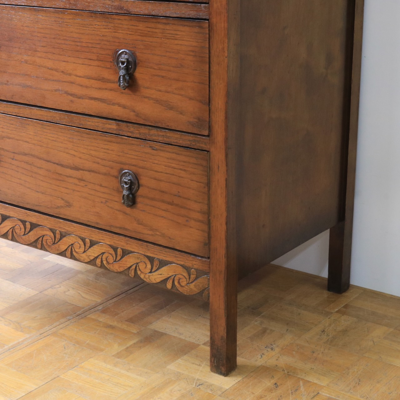 クラシカルな金具や笠木、脚元の装飾が素敵なアクセントになっているチェスト。色味も明るめで、現代家具とも馴染みやすいデザインです。