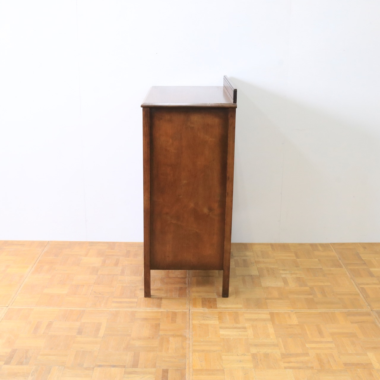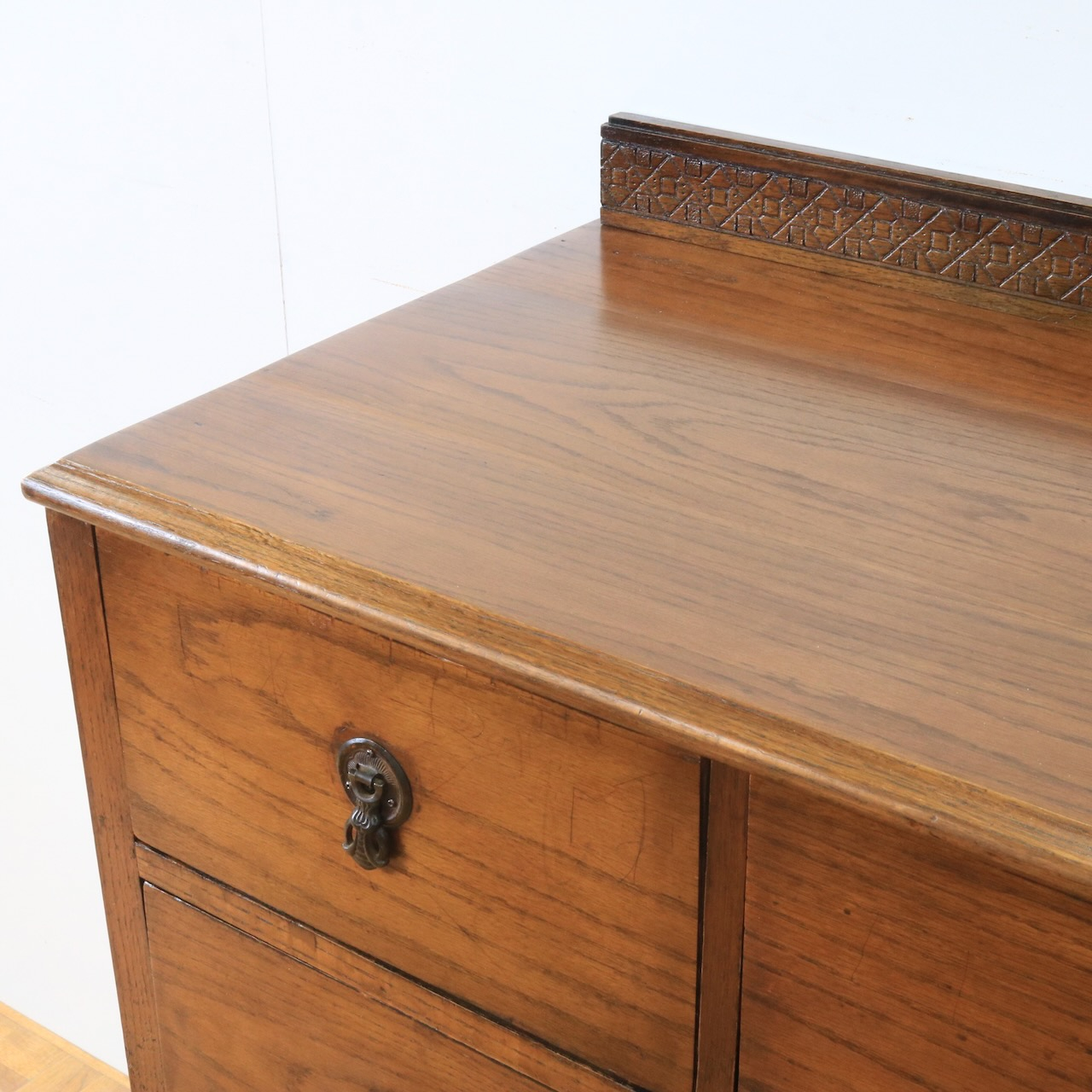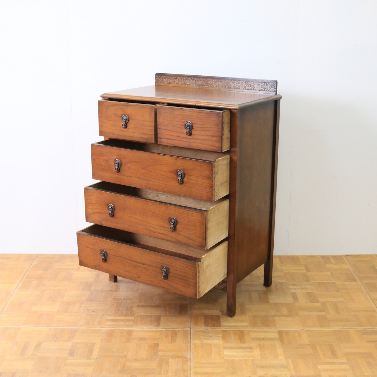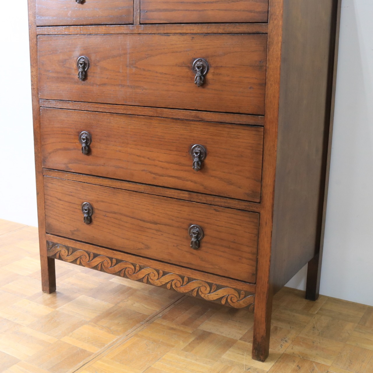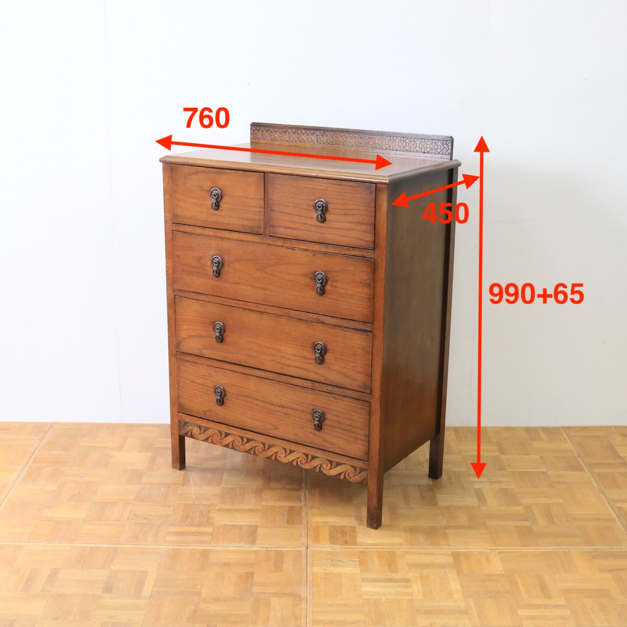 クラシカルな金具や笠木、脚元の装飾が素敵なアクセントになっているチェスト。色味も明るめで、現代家具とも馴染みやすいデザインです。