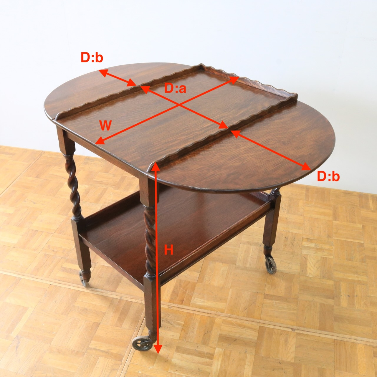 1940年代、オーク材のトローリー。波型の天板縁とツイストの支柱がアクセントになった素朴ながらも温かみのあるデザイン。天板を広げてサブテーブルのようにもお使いいただける、便利な仕様です。