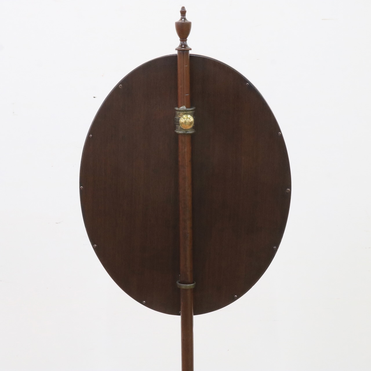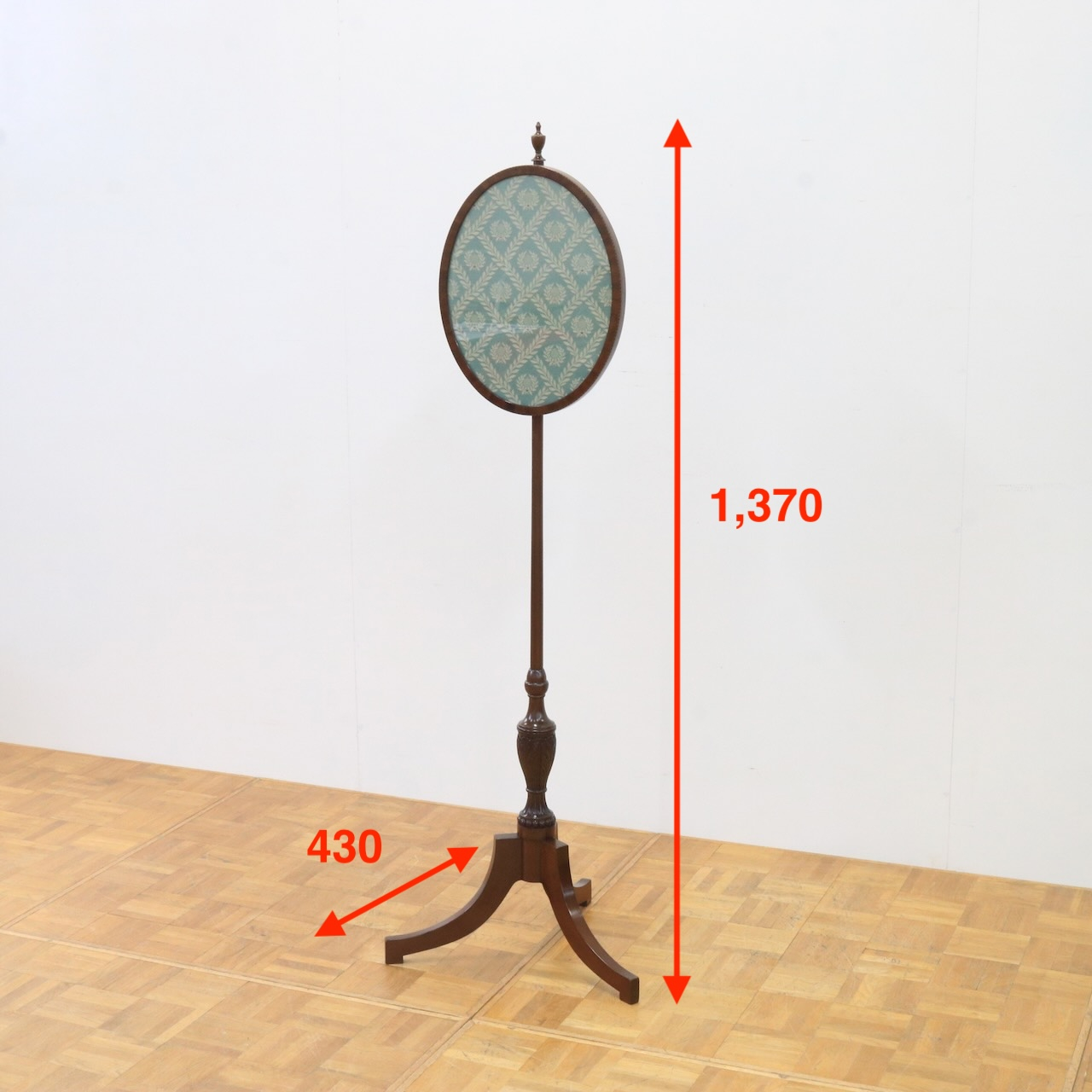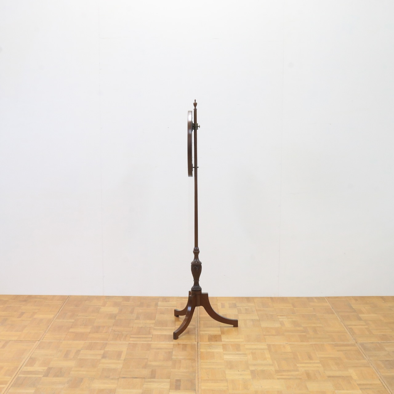 オーバル型のフレーム部は上下に可動します。トップには擬宝珠のアクセント、脚元にはアカンサスレリーフが施され、控えめながらも上品な佇まい。