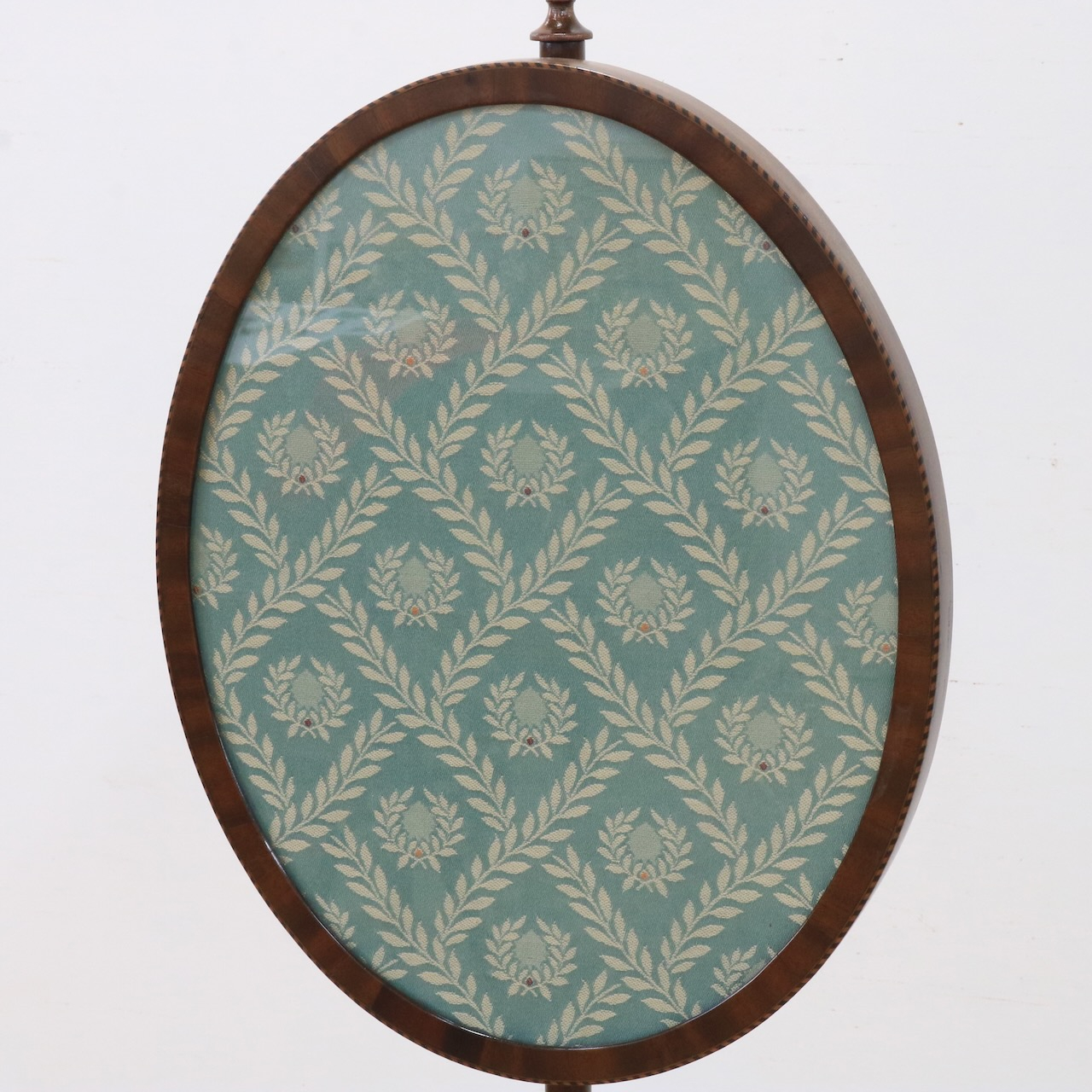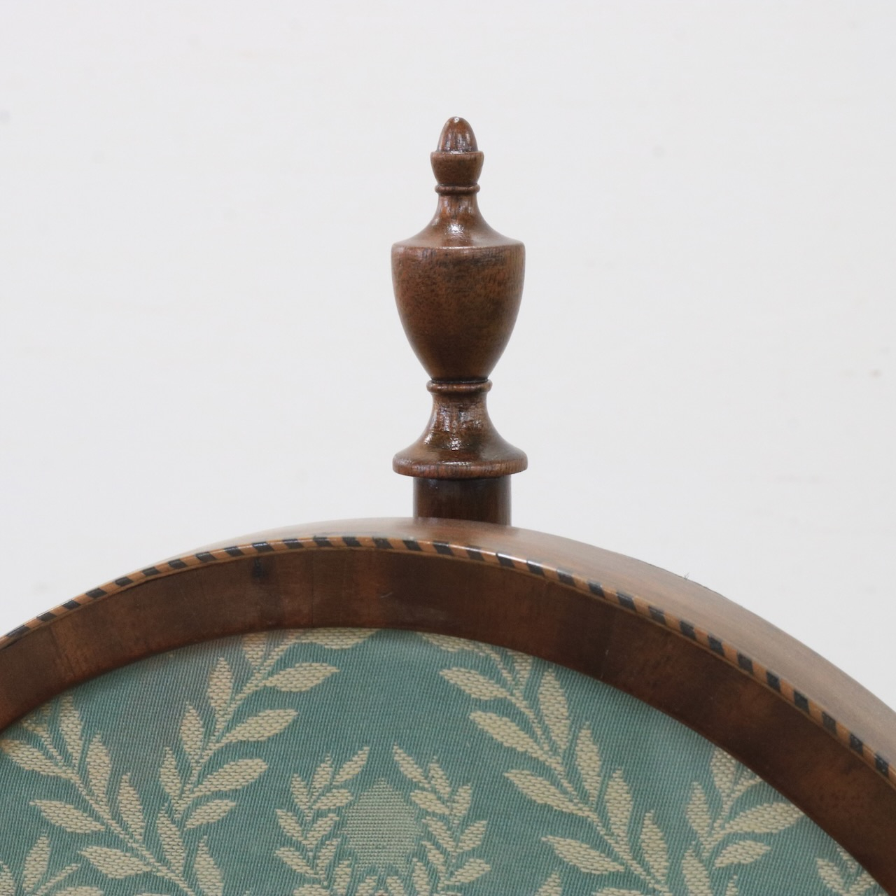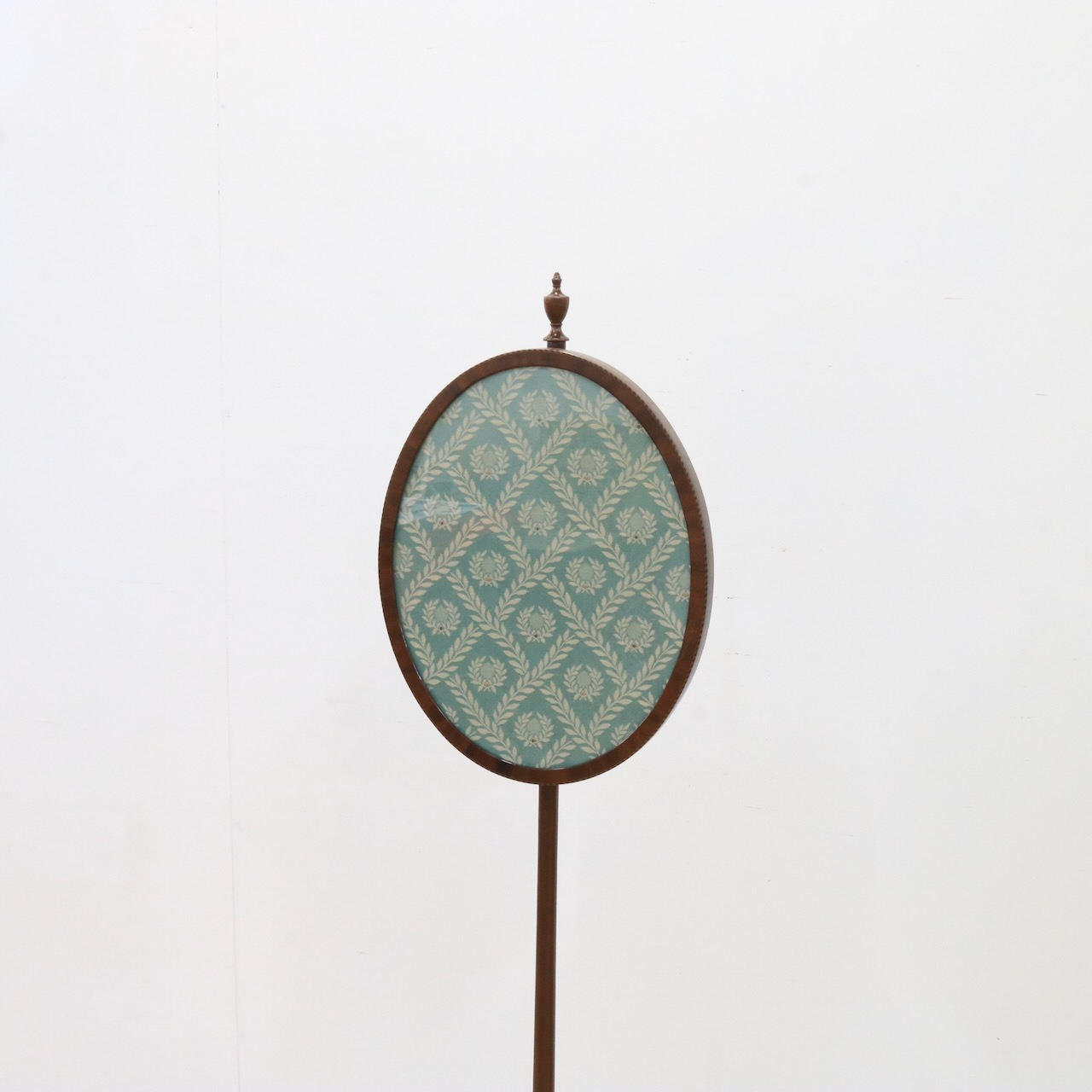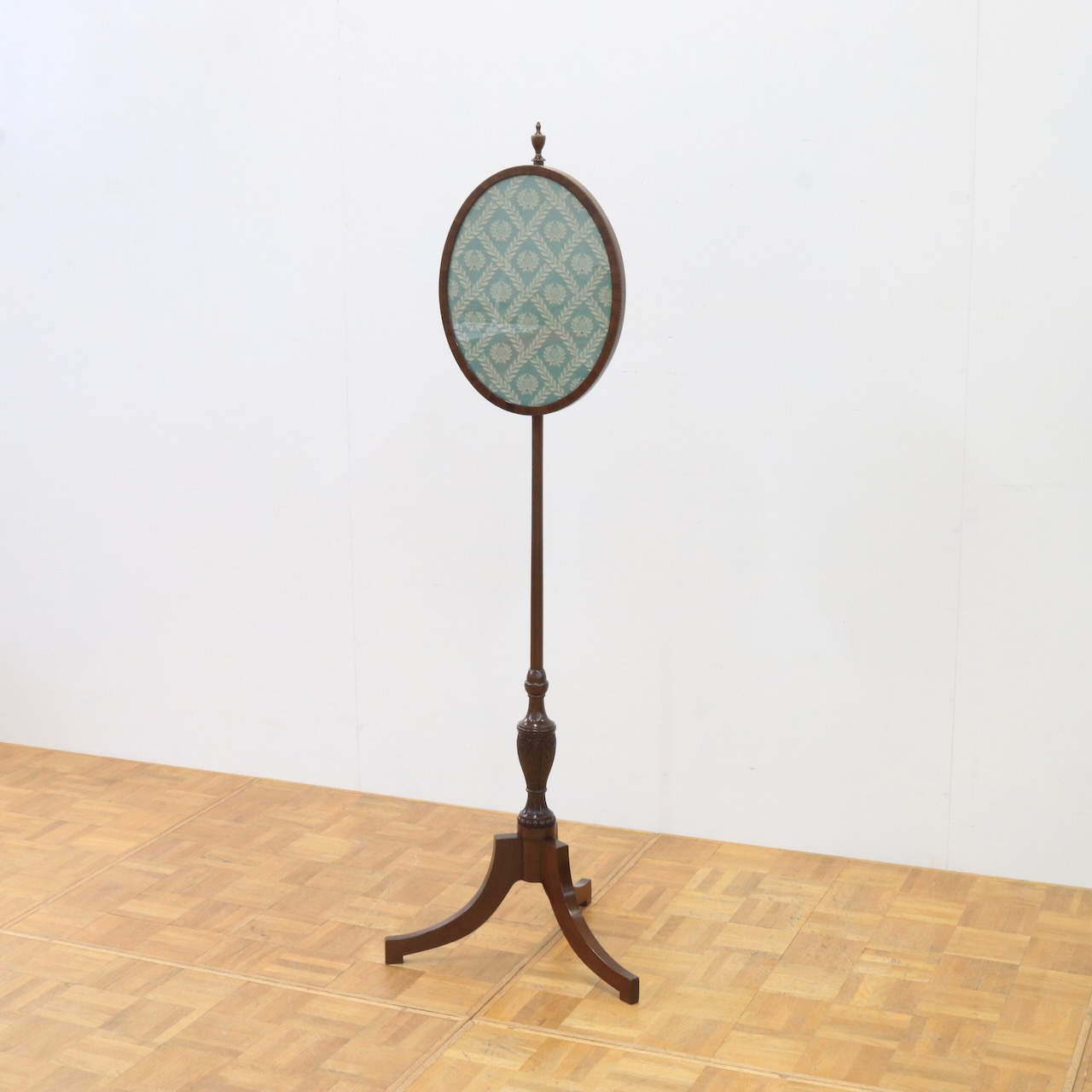 オーバル型のフレーム部は上下に可動します。トップには擬宝珠のアクセント、脚元にはアカンサスレリーフが施され、控えめながらも上品な佇まい。