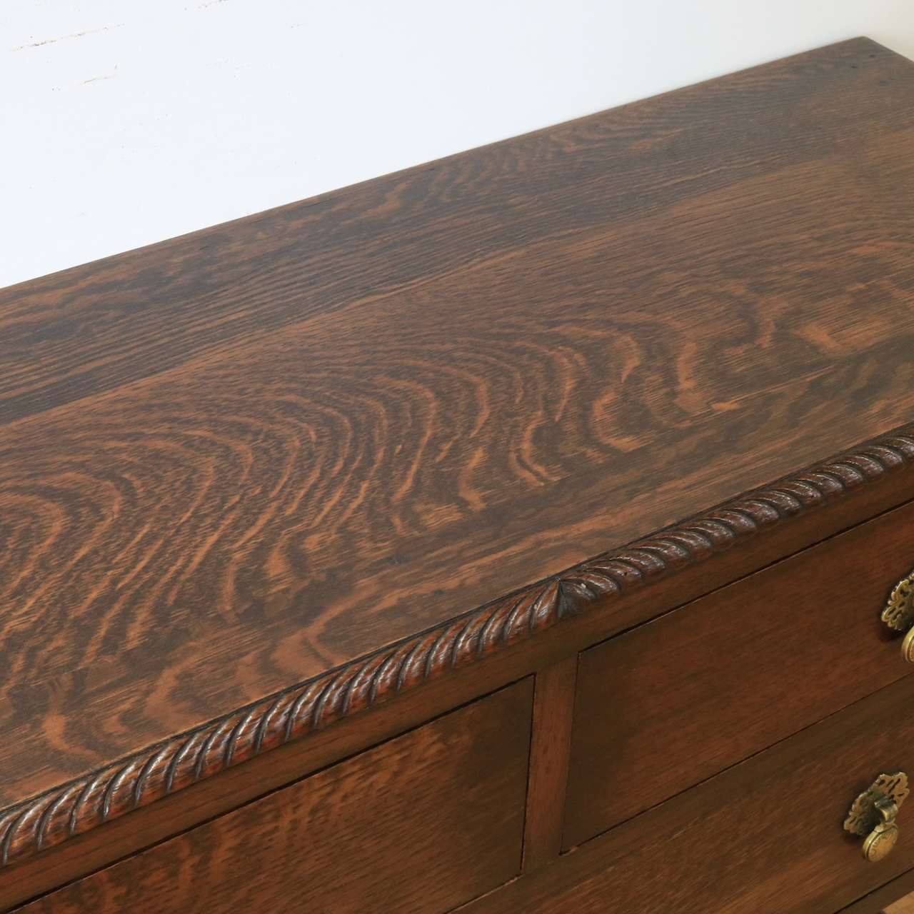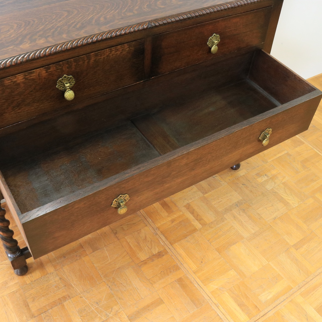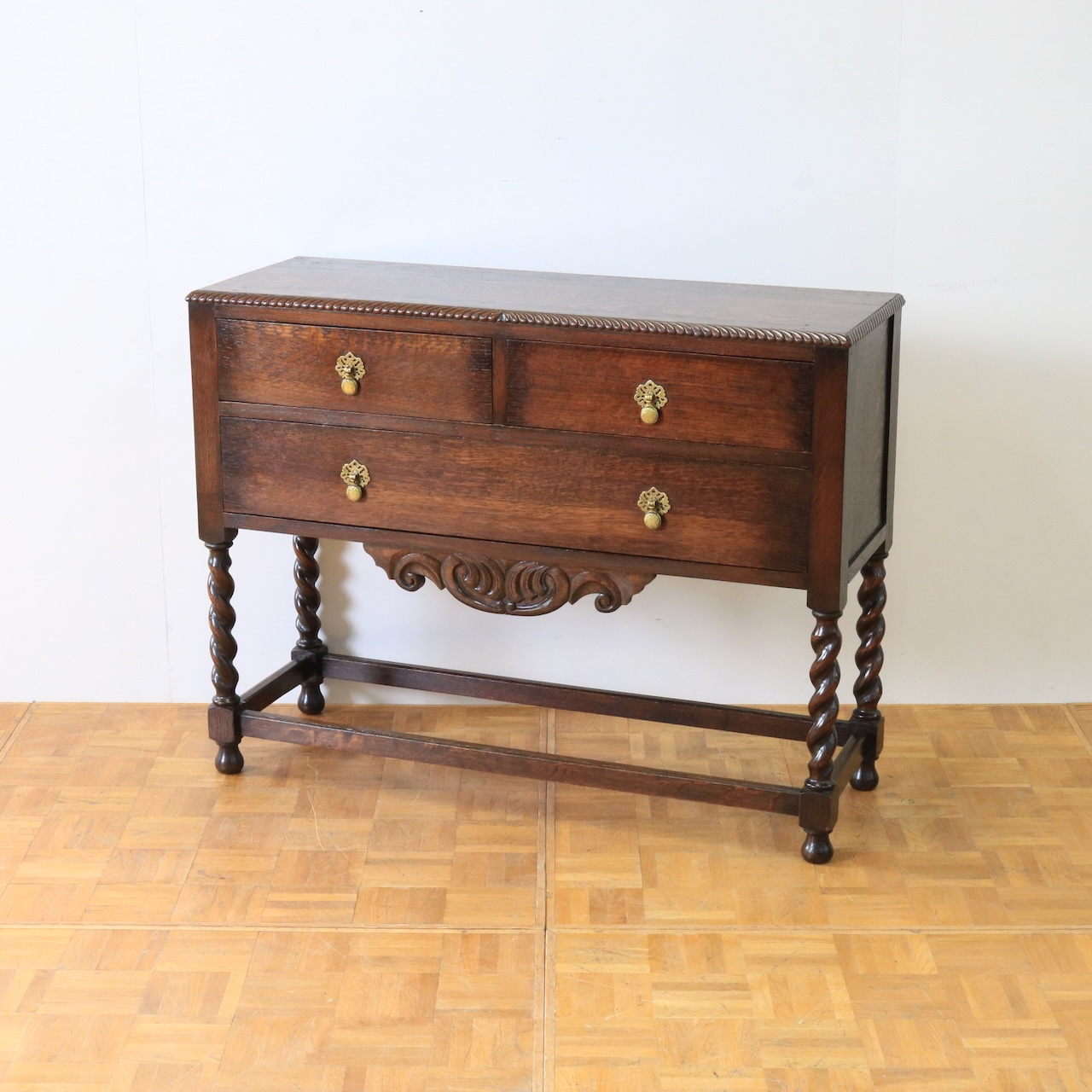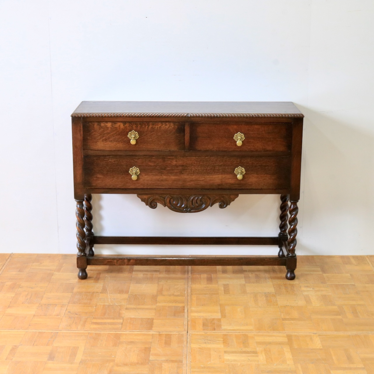 天板縁のガドルーニング、引き出しの引き手金具、引き出しの下には彫刻装飾など、装飾に富んだ美しい家具です。