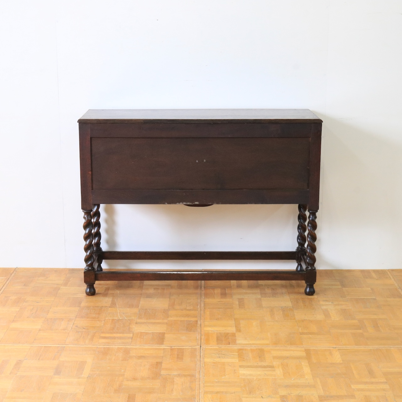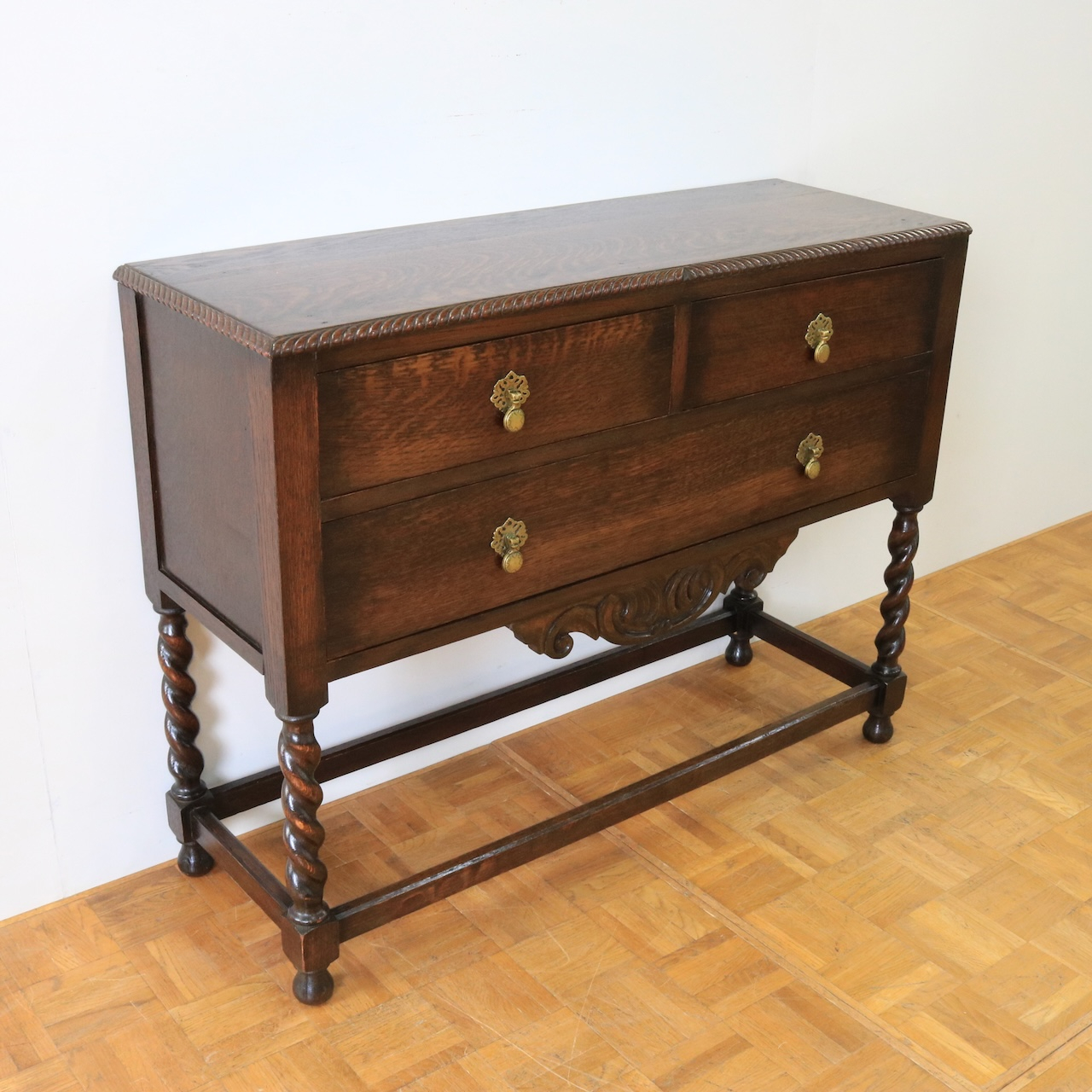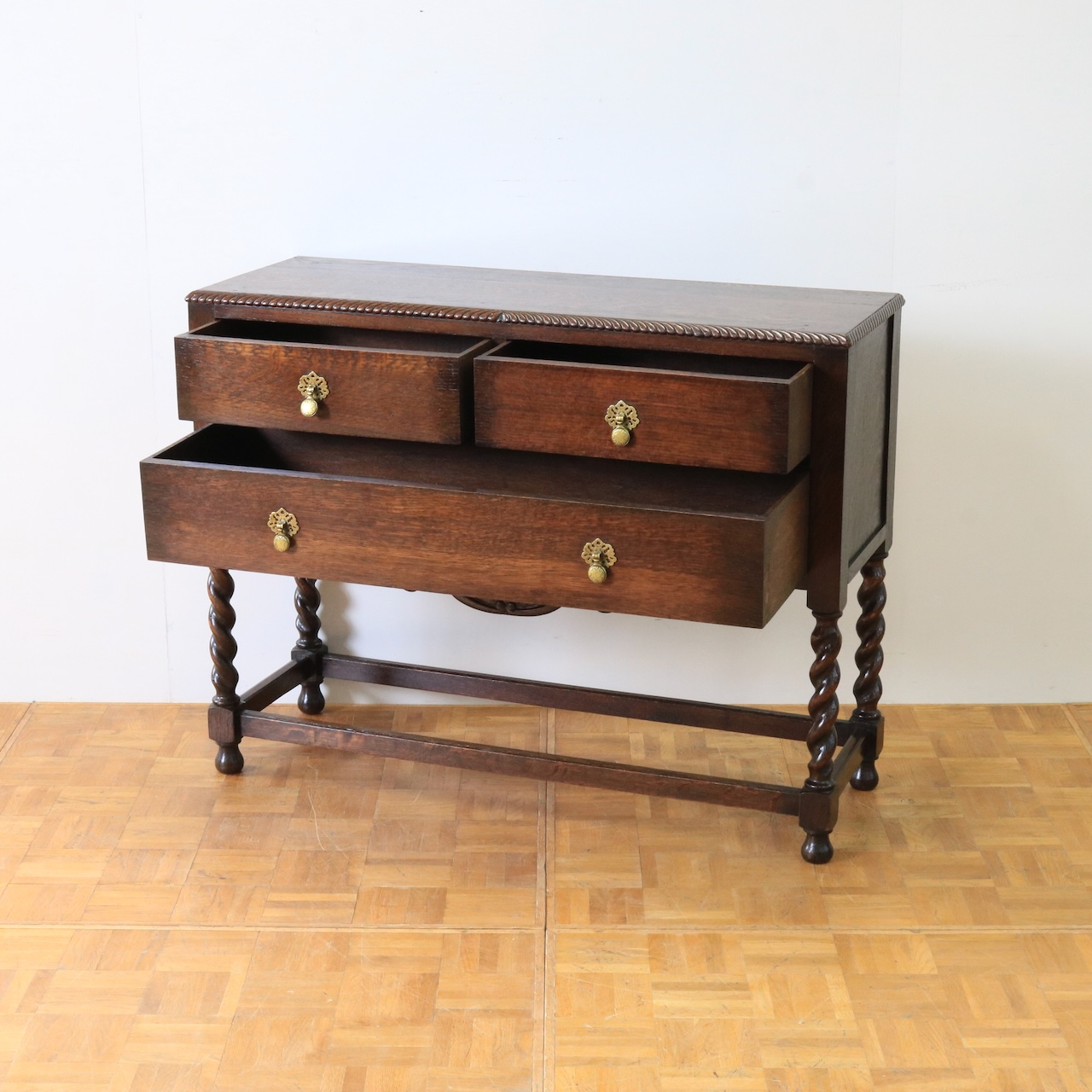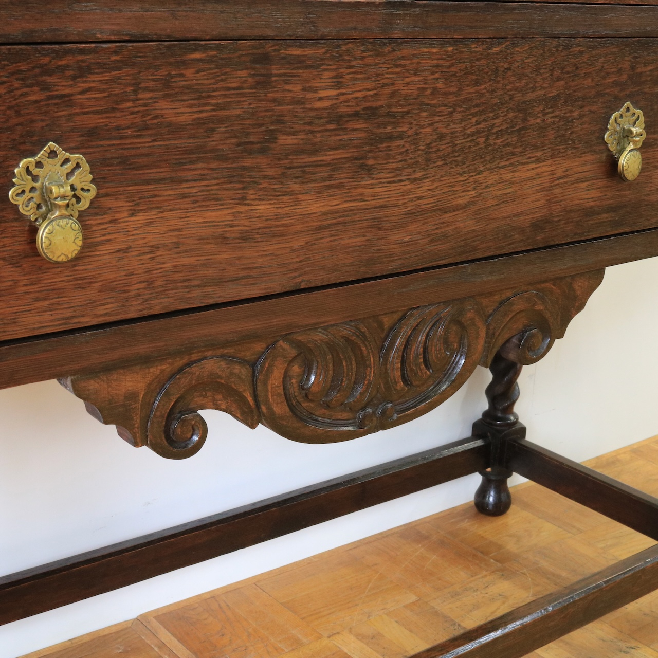 天板縁のガドルーニング、引き出しの引き手金具、引き出しの下には彫刻装飾など、装飾に富んだ美しい家具です。