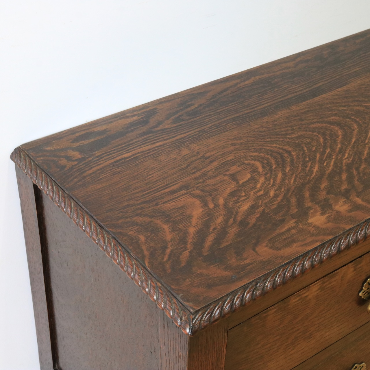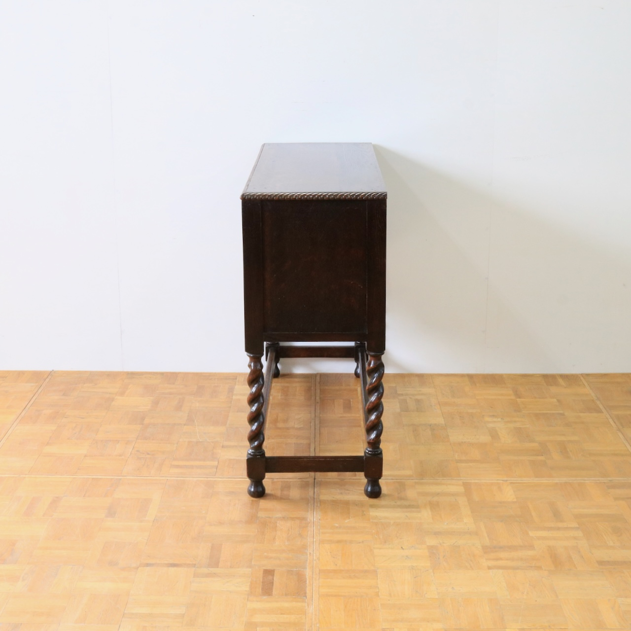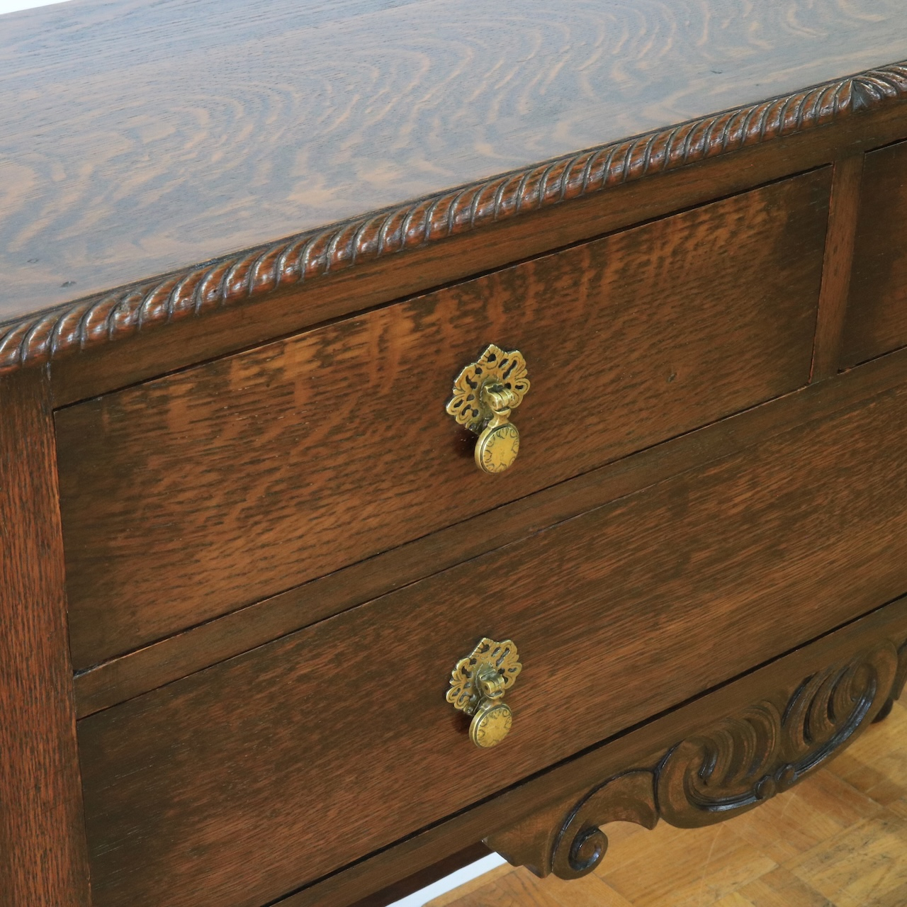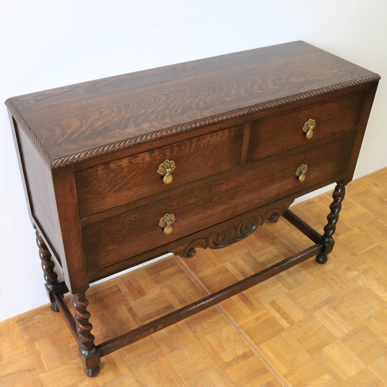 天板縁のガドルーニング、引き出しの引き手金具、引き出しの下には彫刻装飾など、装飾に富んだ美しい家具です。