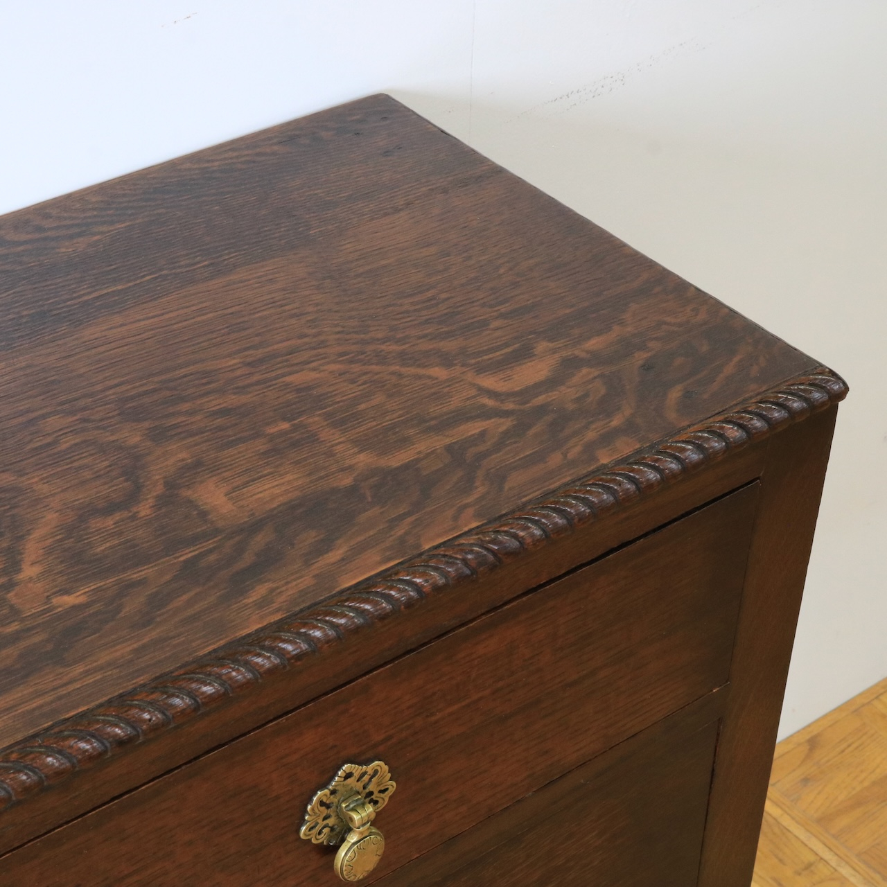 正面中央の繊細なカービング(彫刻)と、真鍮製の引手も、オーク材の深い色合いとのコントラストをより際立たせています。