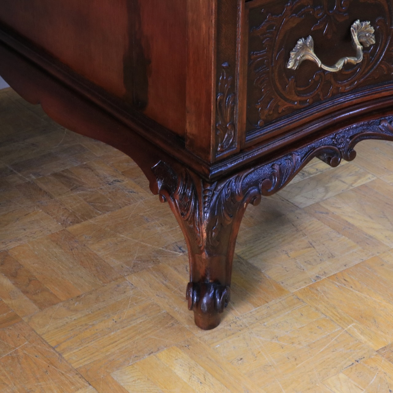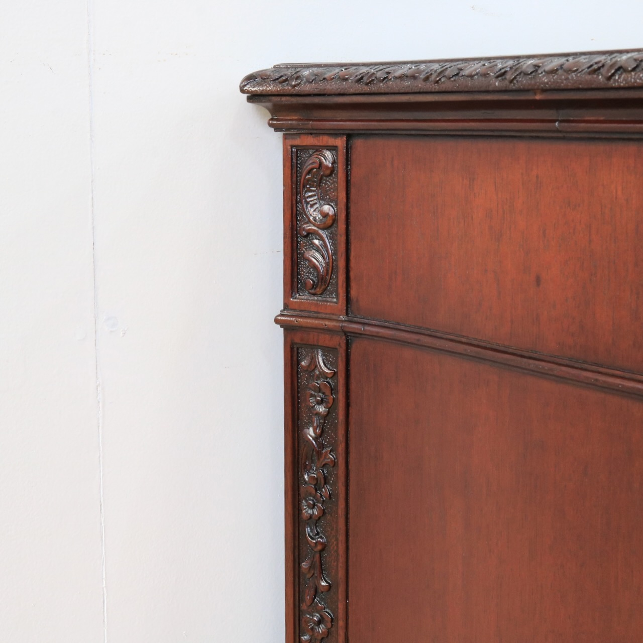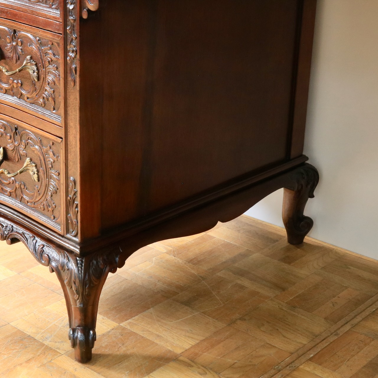 随所に施された彫刻が見事で、職人の技術の高さが伺える意匠です。風格のある佇まいはアンティークらしさを存分に感じられます。是非細部までご覧いただきたい一品です。