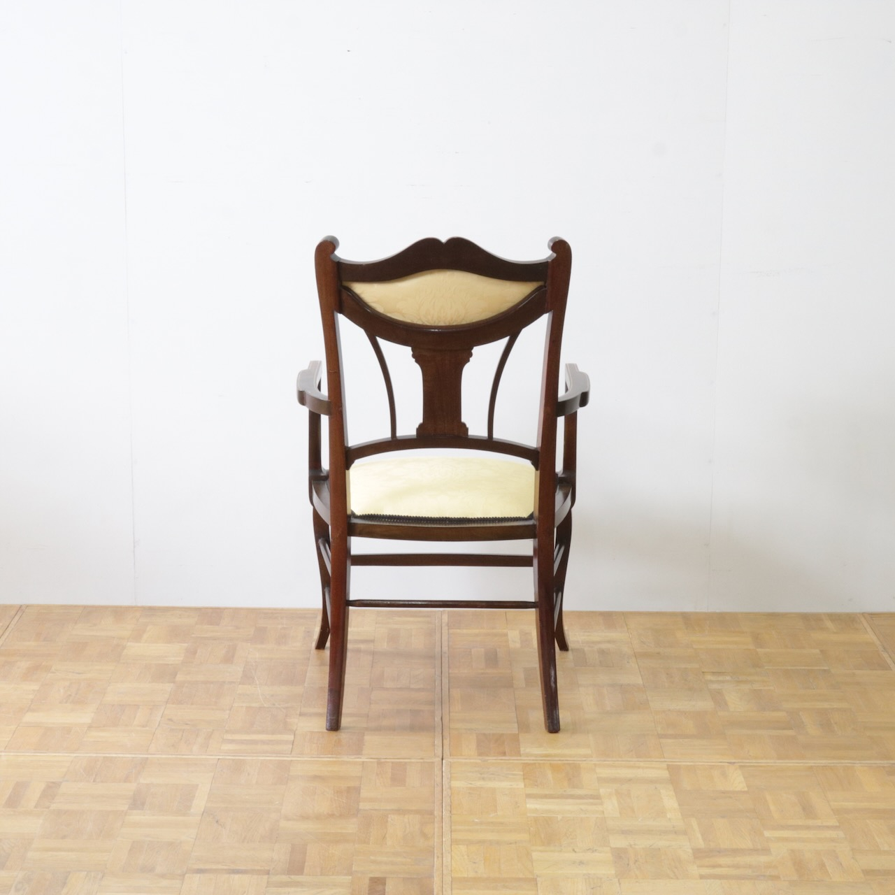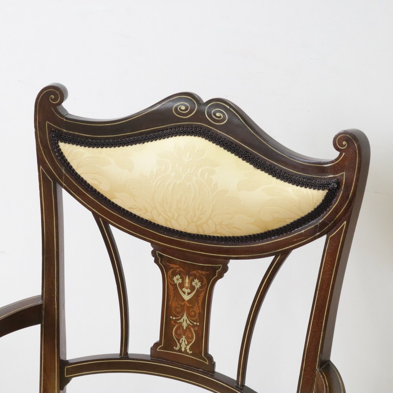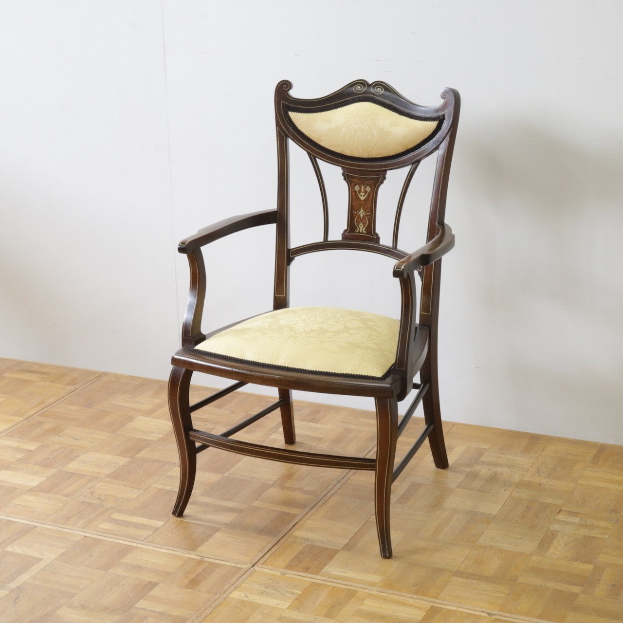 1910年代、マホガニー材のアームチェアー。繊細なフォルムと背に入ったインレイ(象嵌細工)が美しいデザインのアームチェアーです。