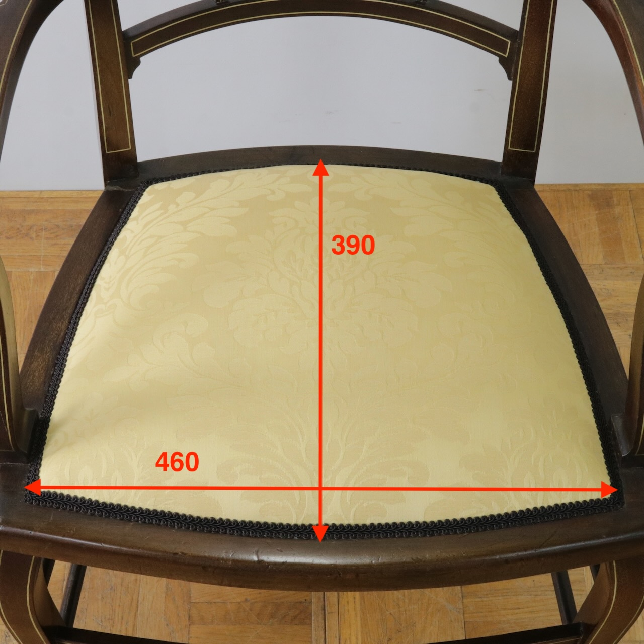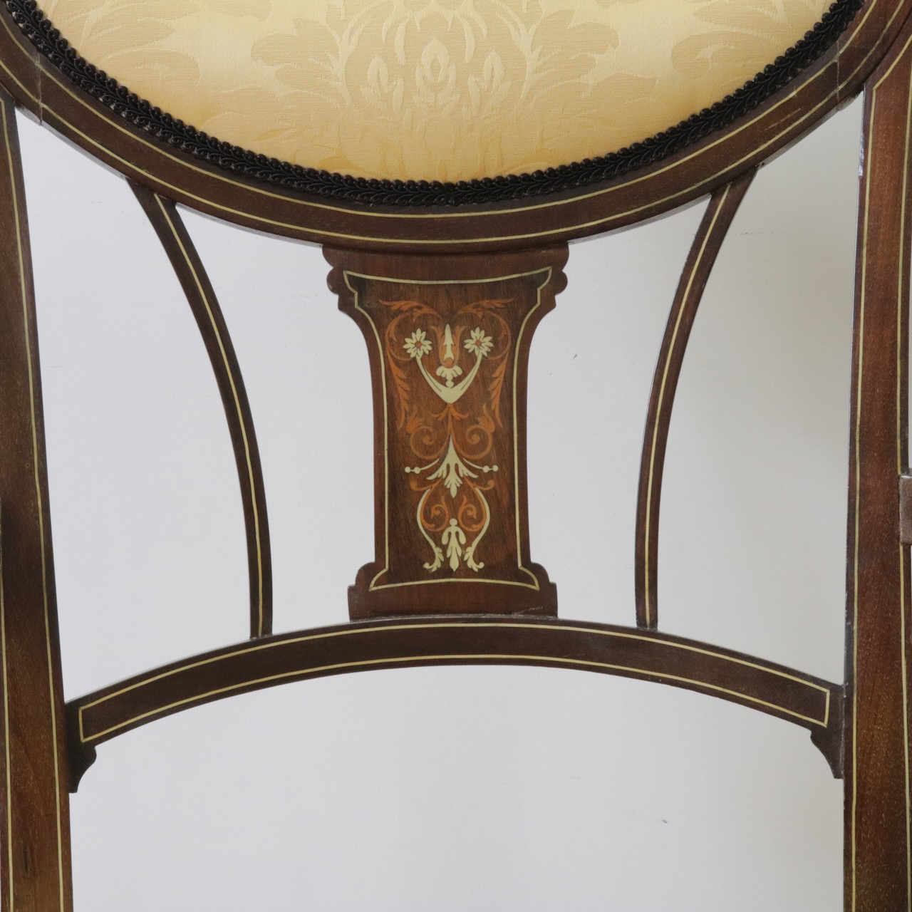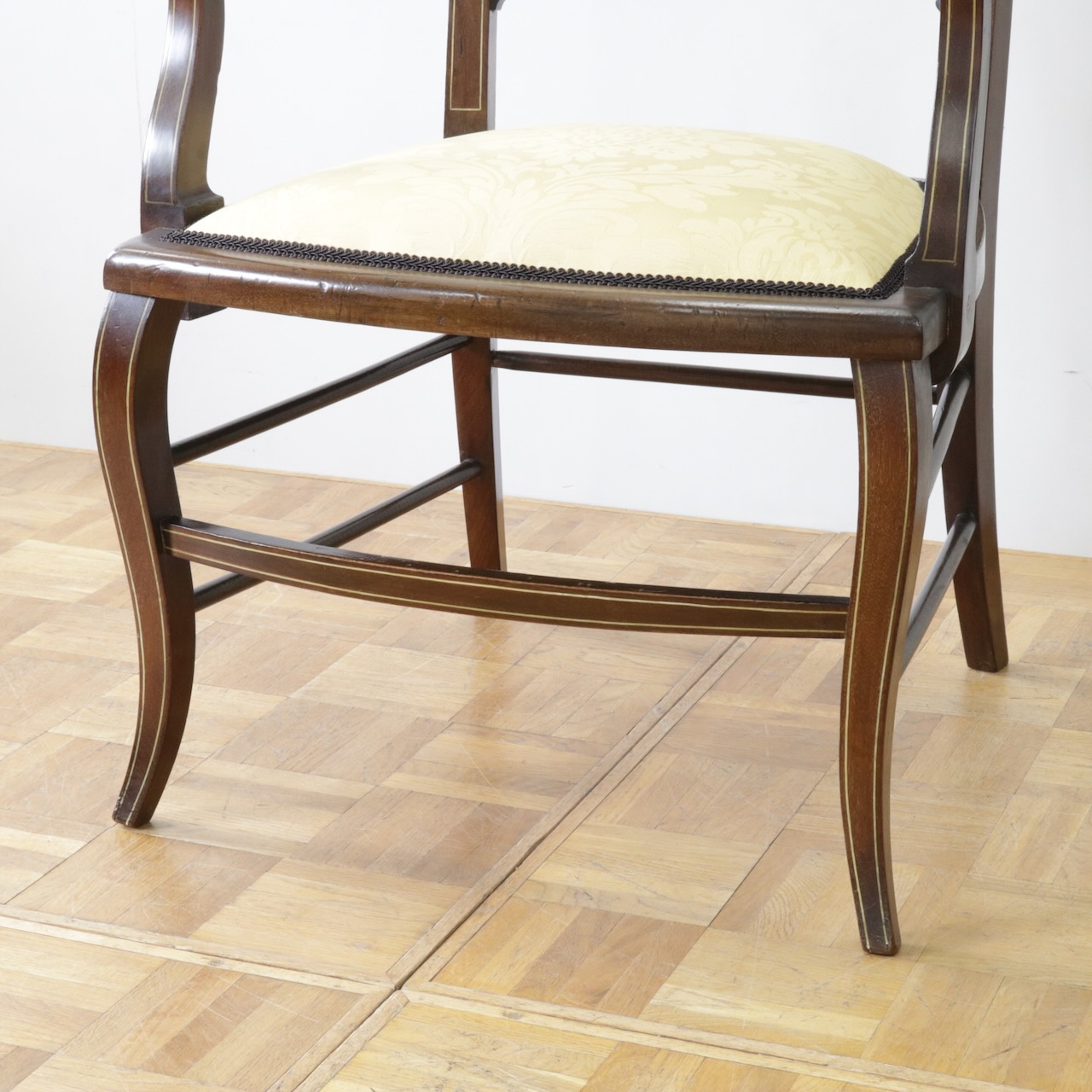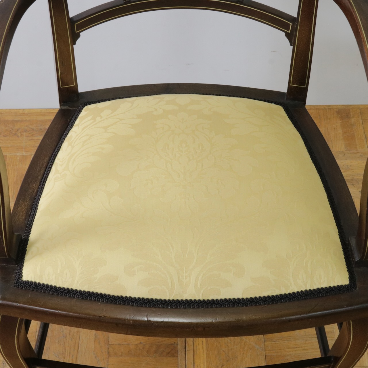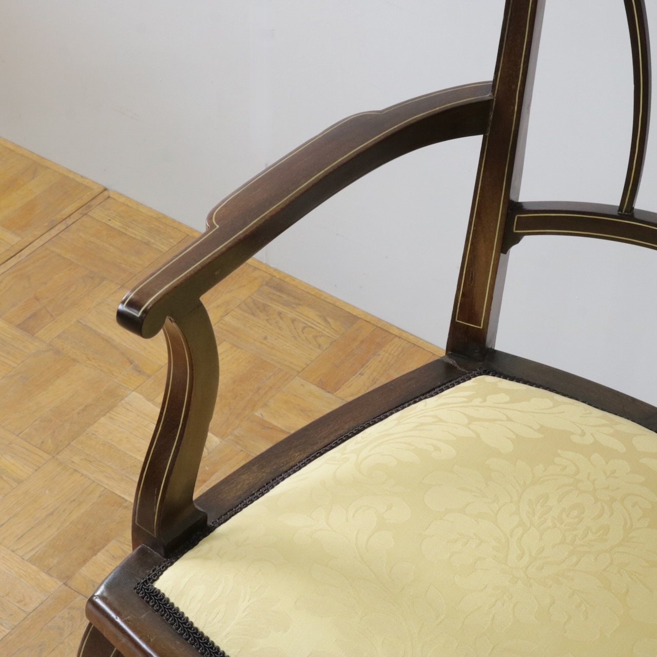見事なインレイ細工が施されたアームチェアー。背板は勿論、アームの先端や脚先に至るまで綺麗に施されています。黄色い生地と相まって、お部屋を華やかに彩ってくれる一脚です。