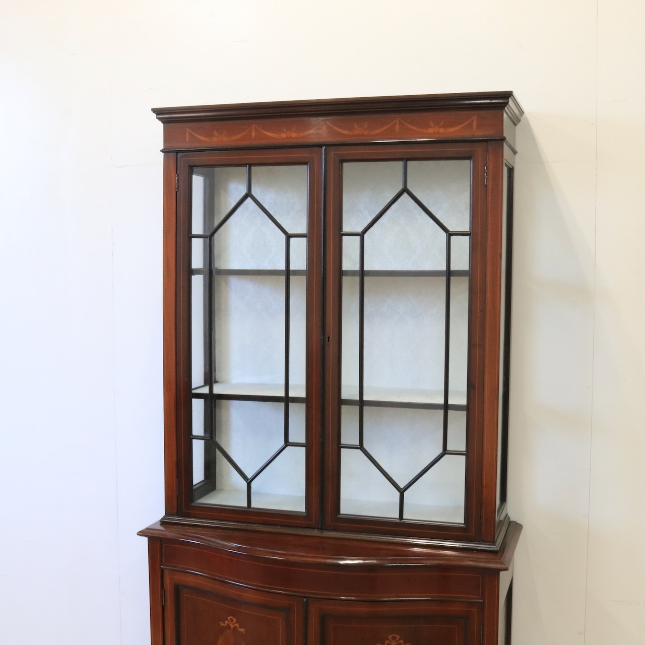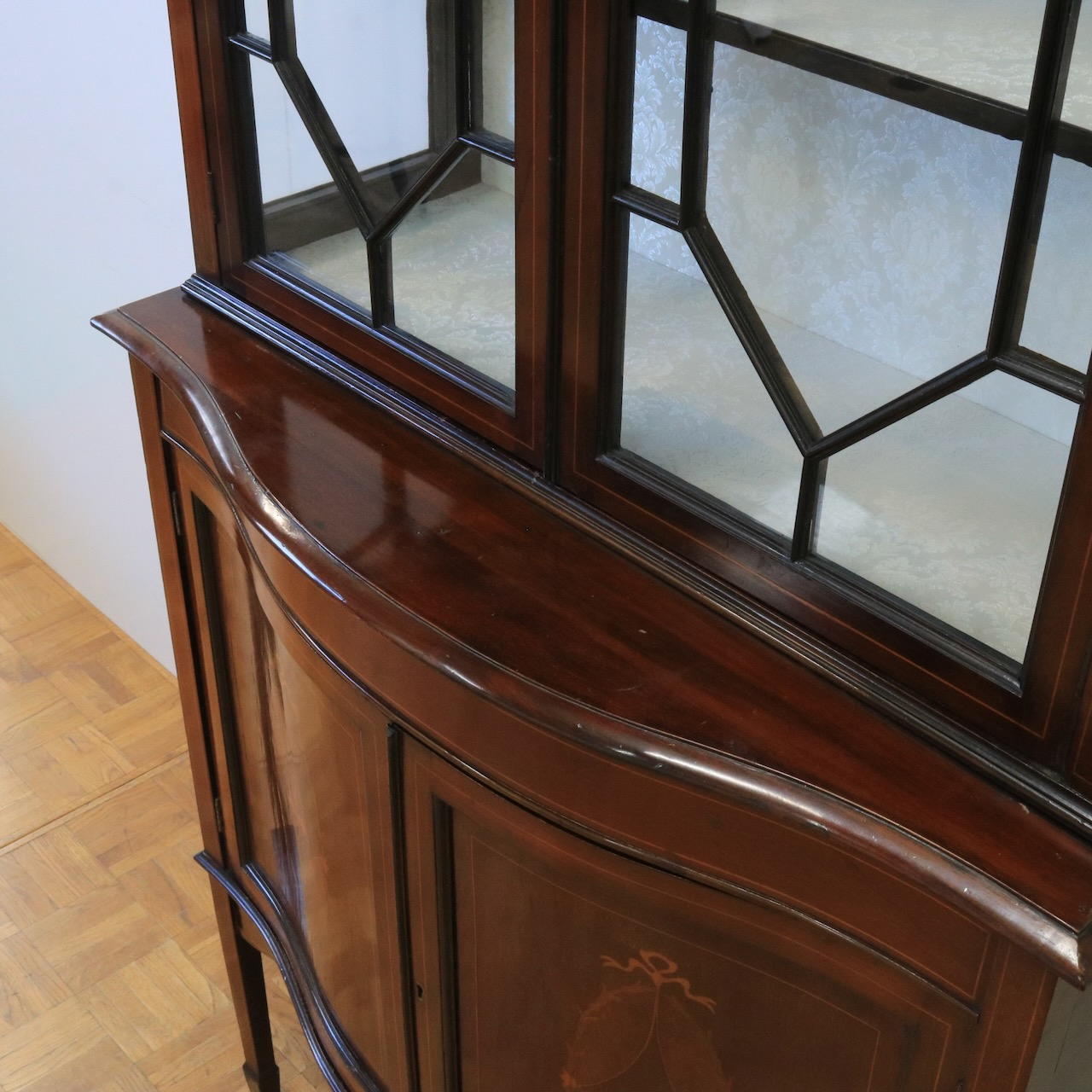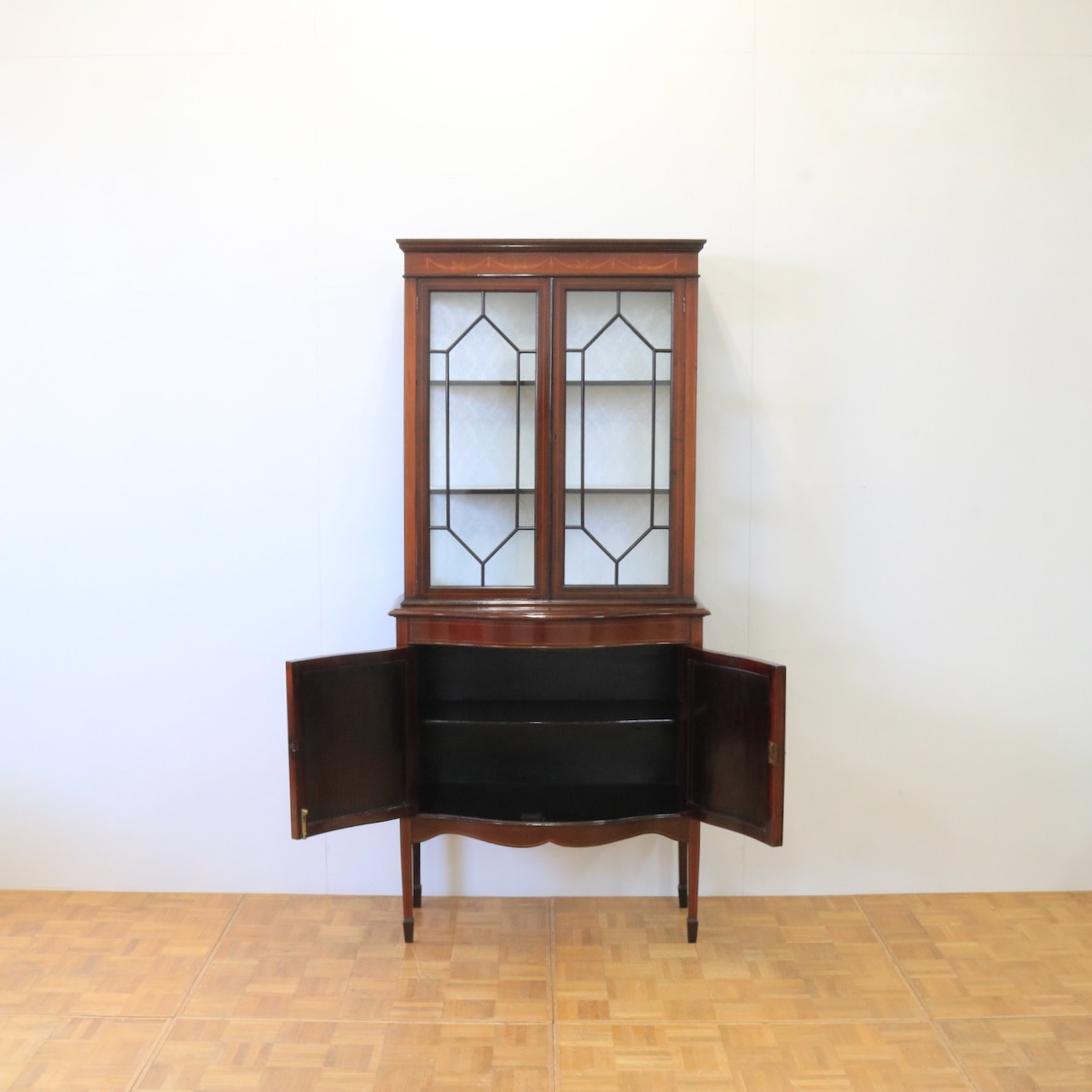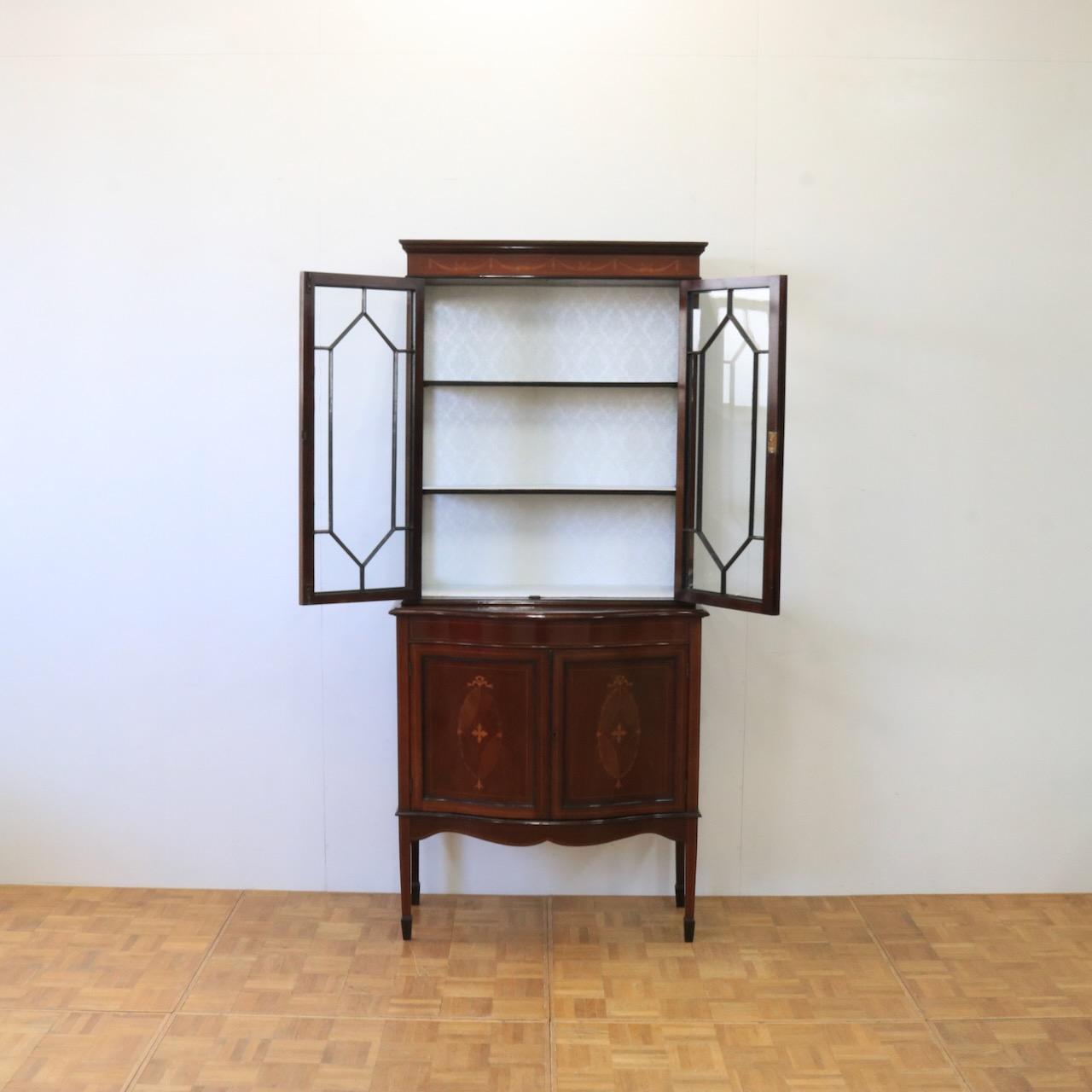 1910年代、マホガニー材のグラスキャビネット。マホガニーらしい赤みがかった上品な木の色合いに、明るい色の材を用いたインレイが美しく映えるデザイン。下段が弓形にカーブしたデザインな点もエレガントな趣を感じさせます。
