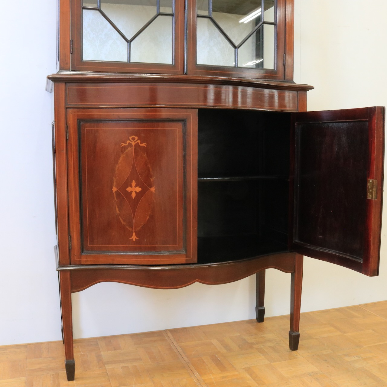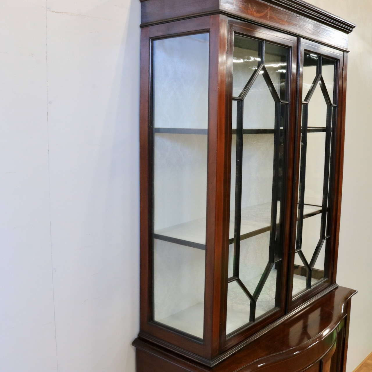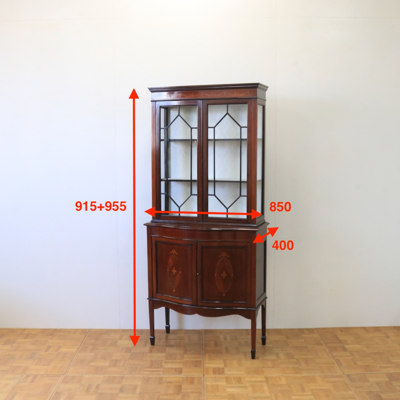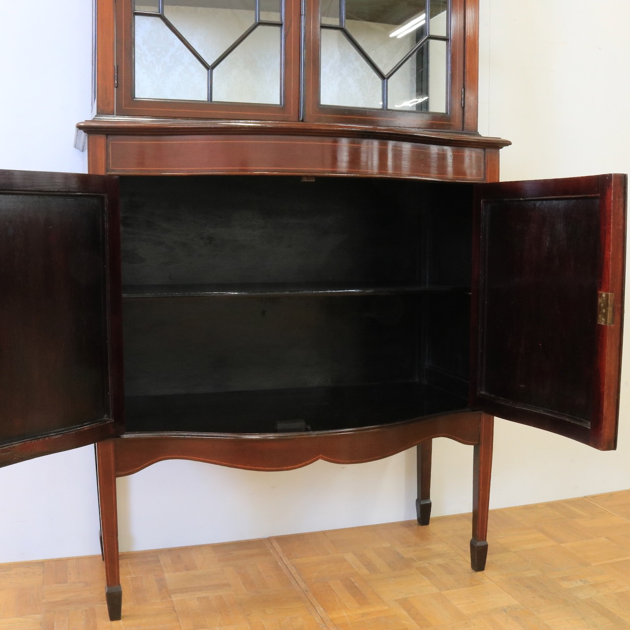 1910年代、マホガニー材のグラスキャビネット。マホガニーらしい赤みがかった上品な木の色合いに、明るい色の材を用いたインレイが美しく映えるデザイン。下段が弓形にカーブしたデザインな点もエレガントな趣を感じさせます。