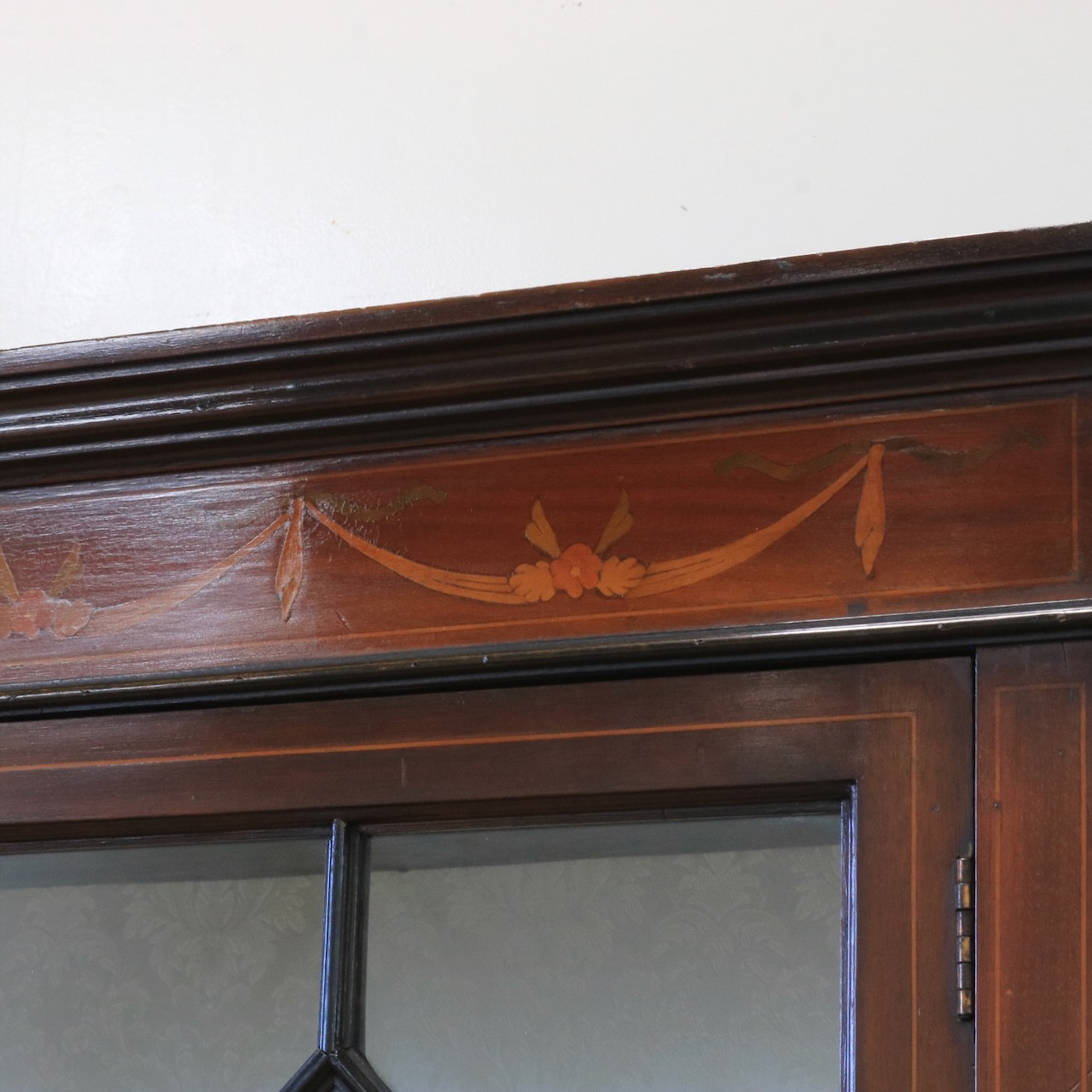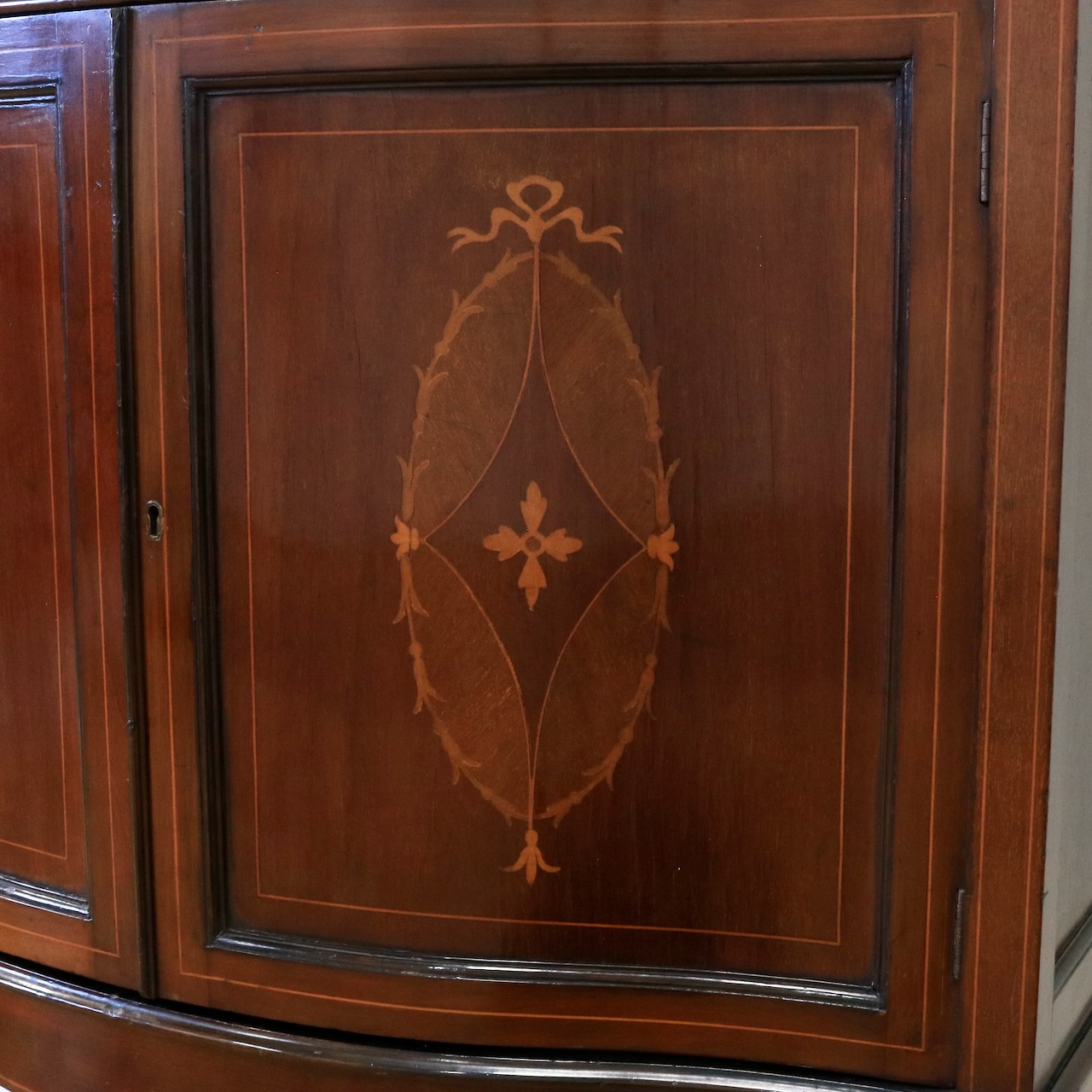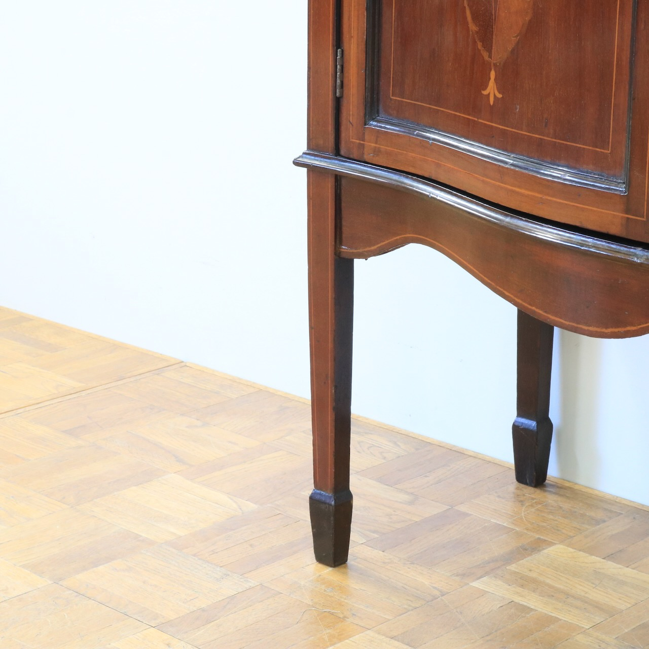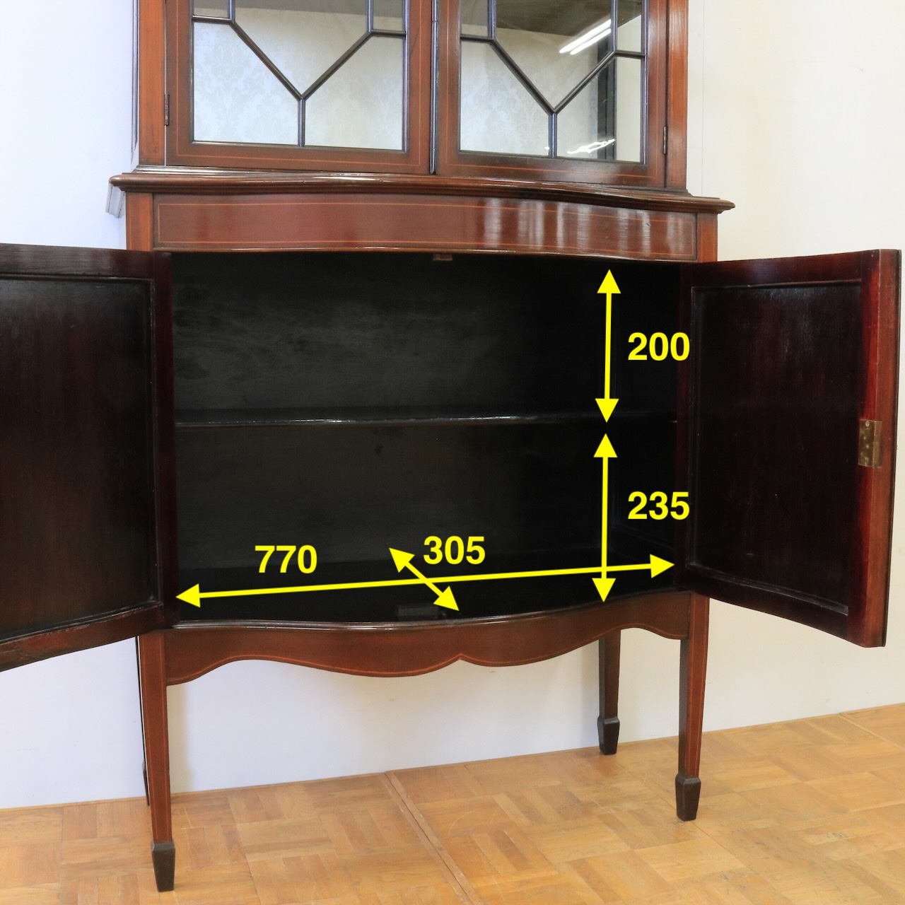 1910年代、マホガニー材のグラスキャビネット。マホガニーらしい赤みがかった上品な木の色合いに、明るい色の材を用いたインレイが美しく映えるデザイン。下段が弓形にカーブしたデザインな点もエレガントな趣を感じさせます。