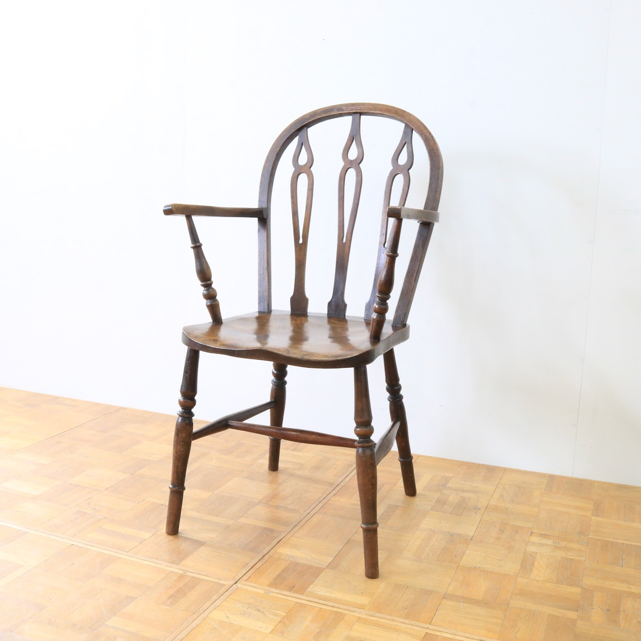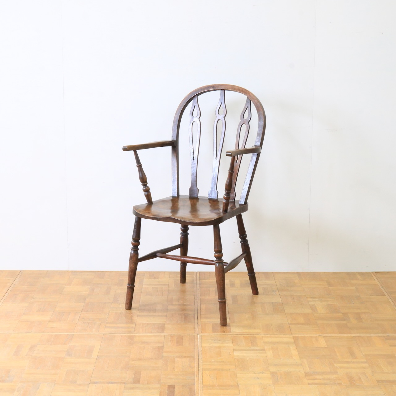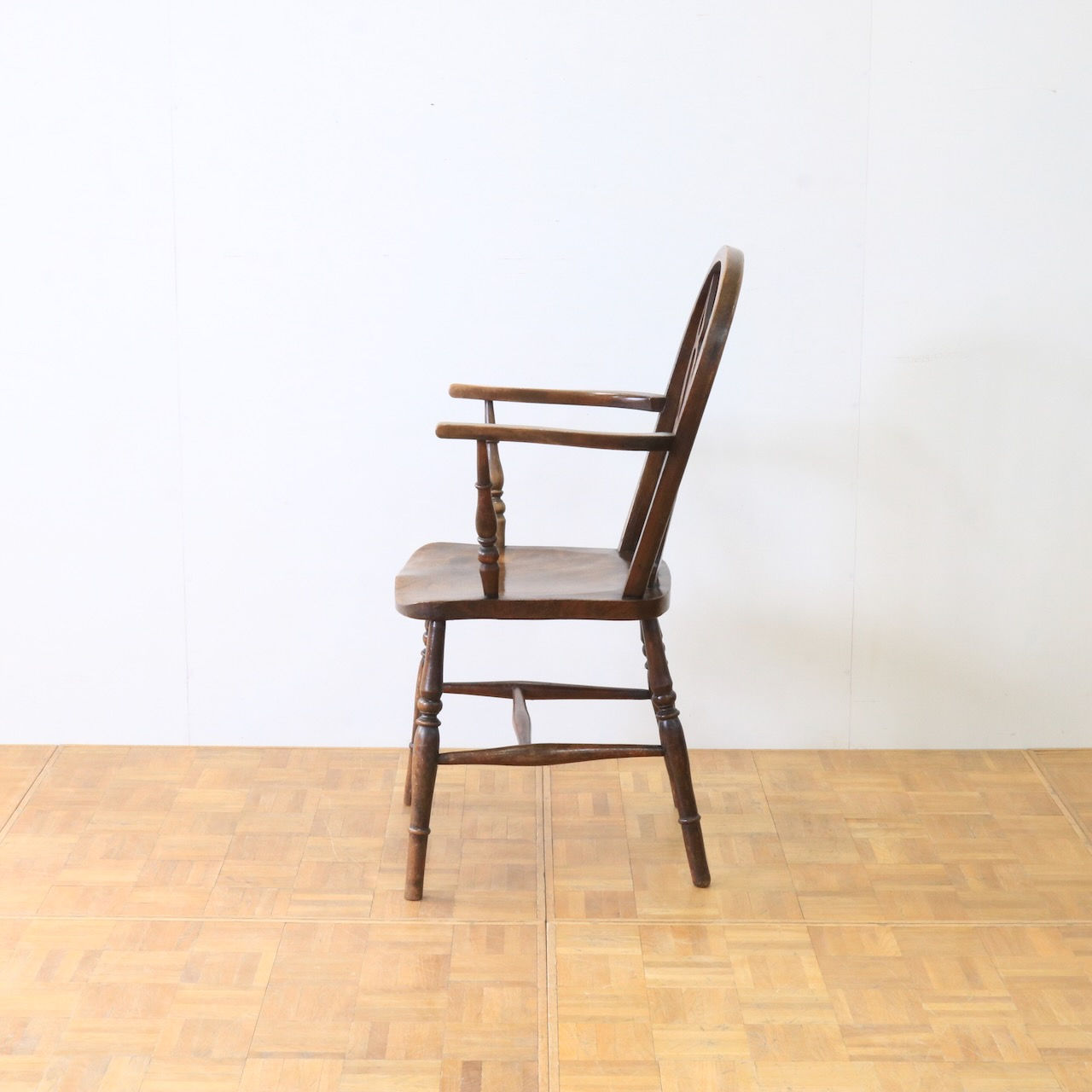 1920年代、エルム材のアームチェアー。エルム材ならではの素朴で温かみのある風合いが、ダイニングやデスク周りに落ち着いた雰囲気を添えてくれます。