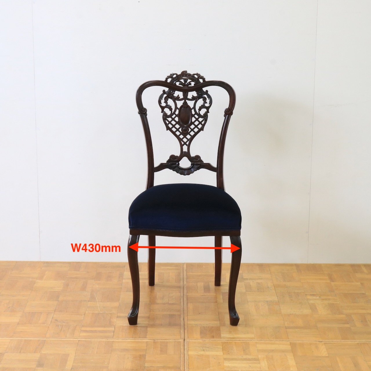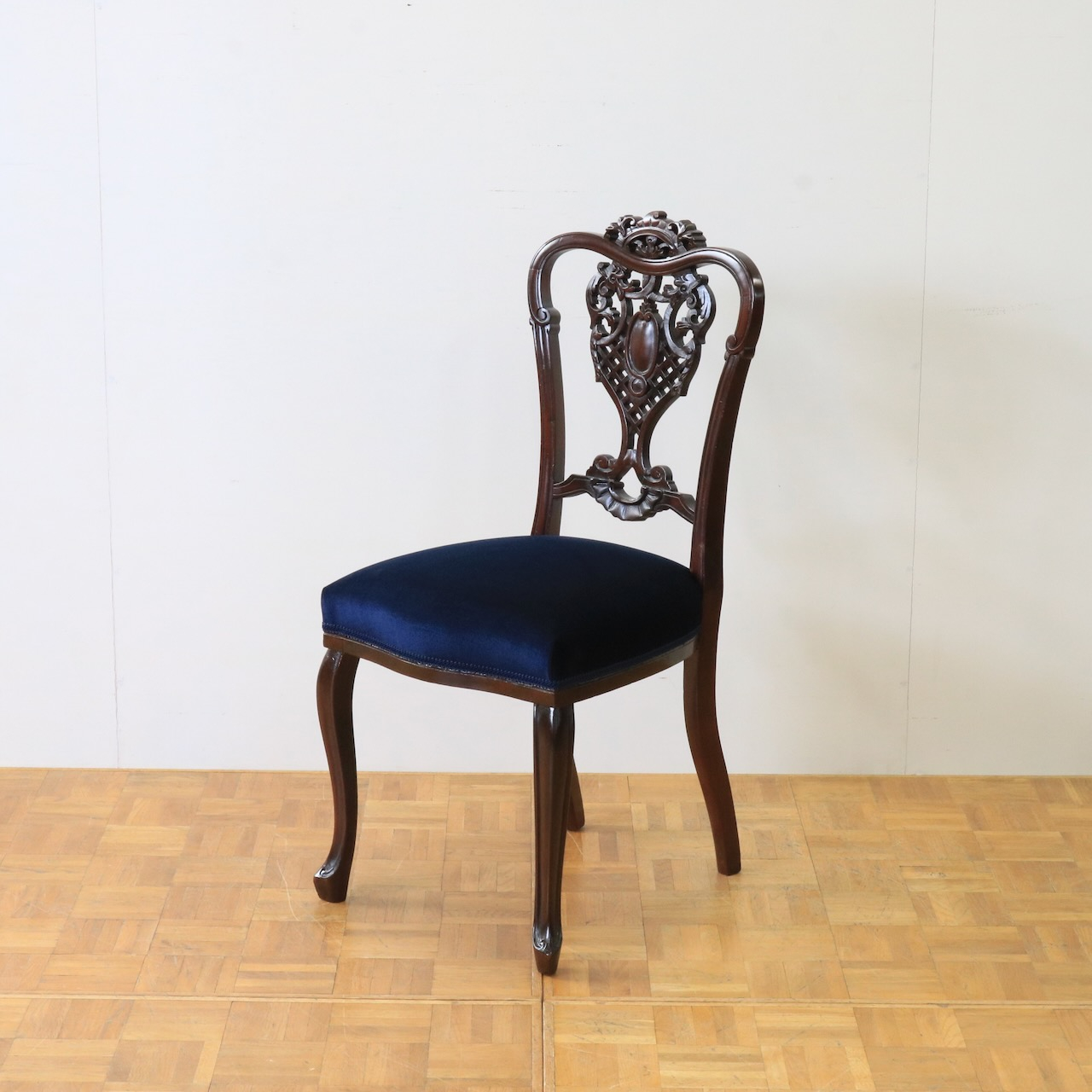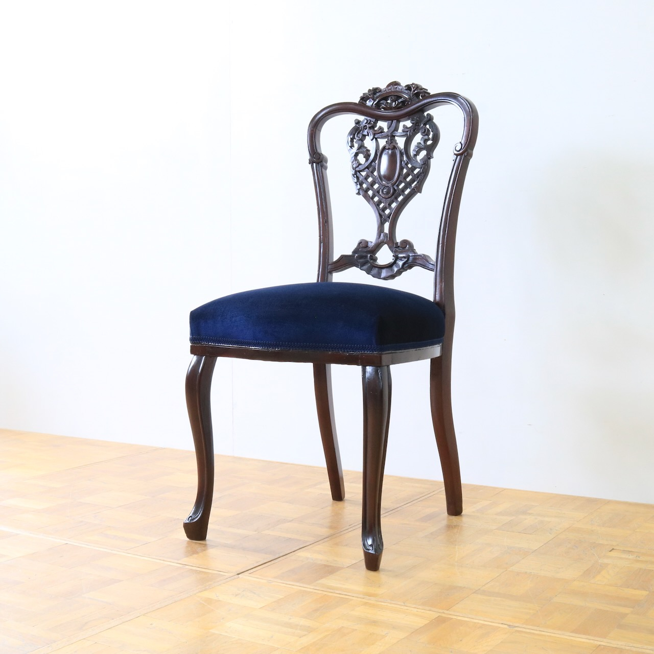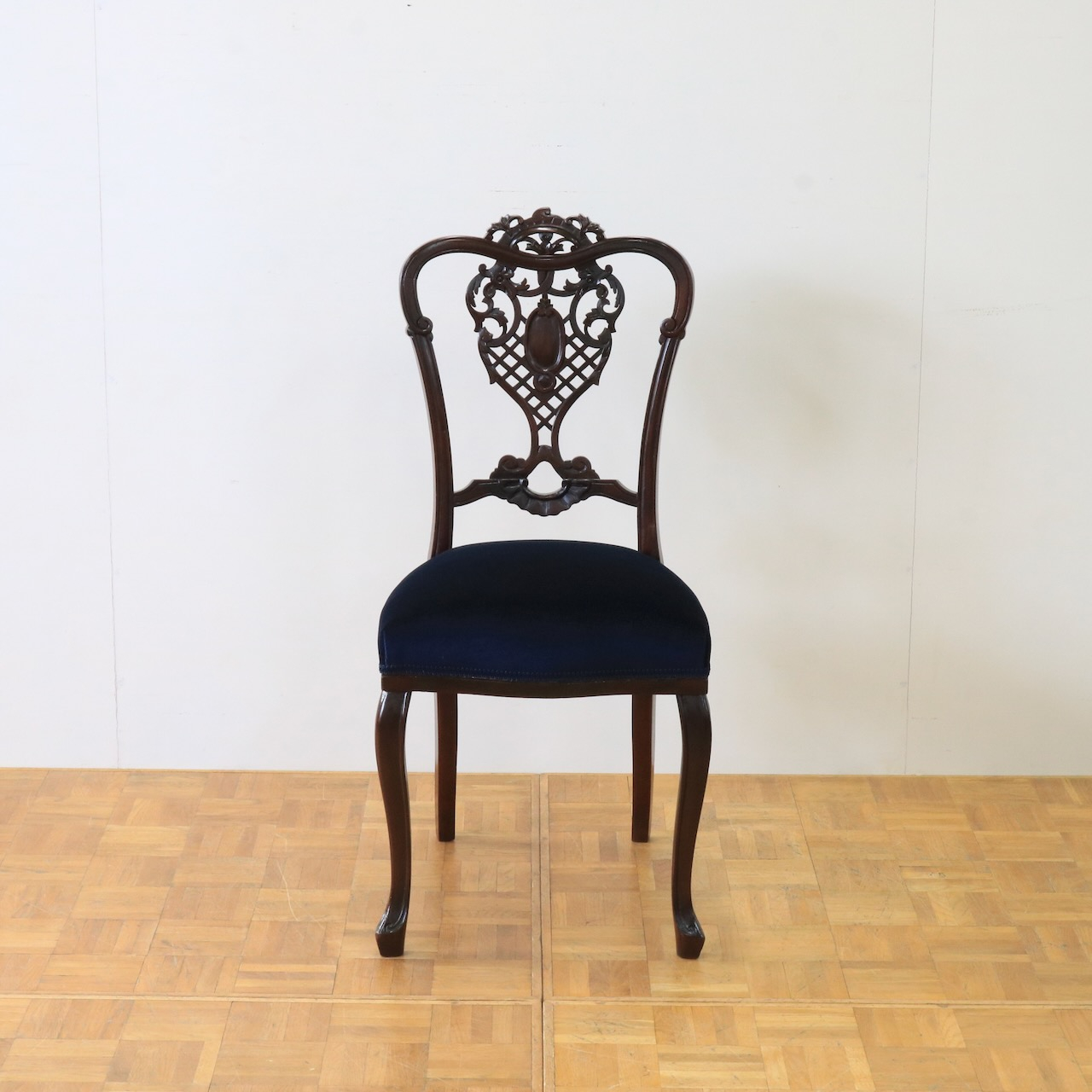 配送料の目安 ▶︎1910年代、マホガニー材のサロンチェアー。精巧な透かし彫りがゴージャスな背もたれが特徴的で、優雅な雰囲気をまとうチェアーです。ティーサロンやくつろぎのリビングルームにいかがでしょうか。