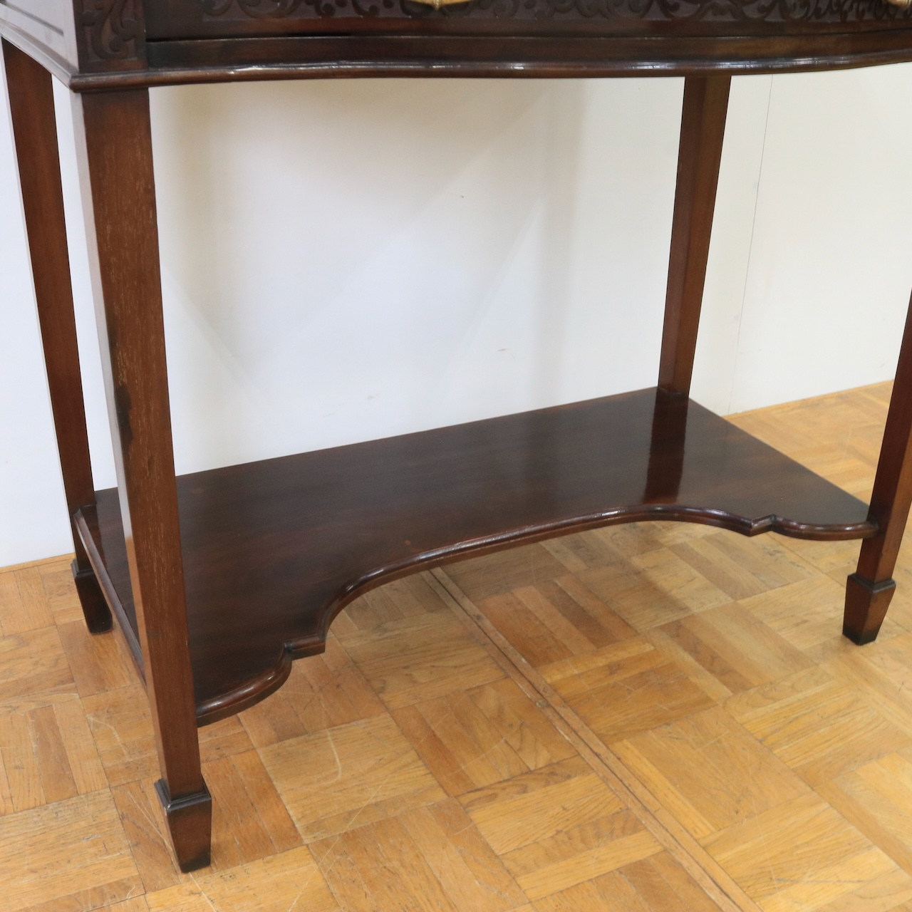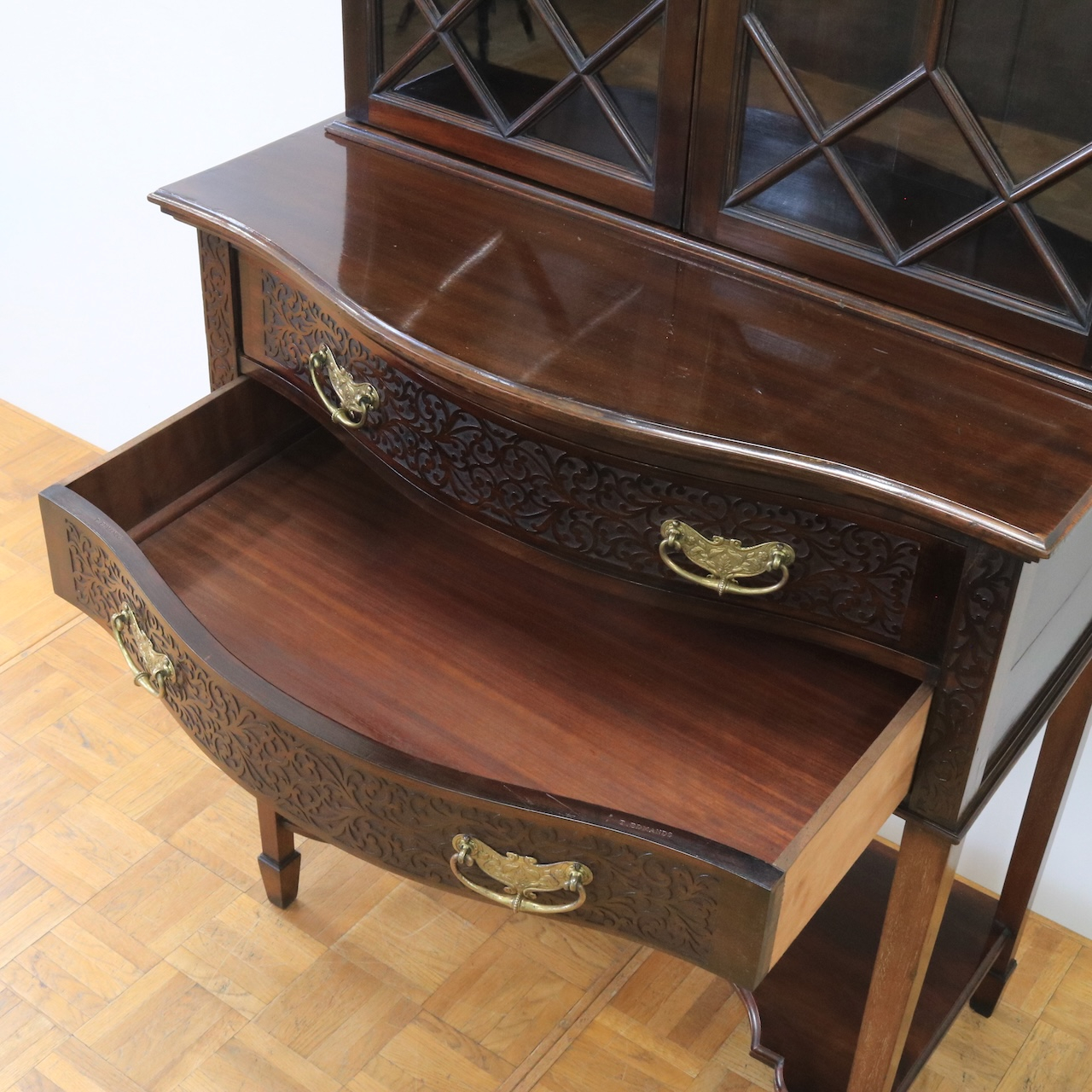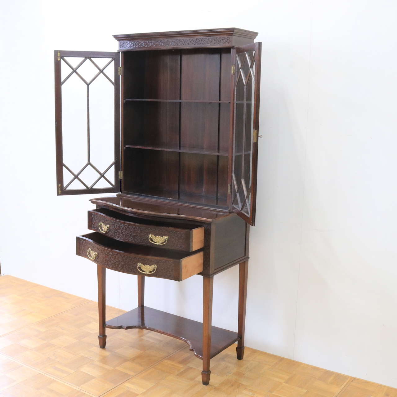 上部や引き出し周りに施されたフレットワークによる装飾が圧巻のクオリティです。美しさは勿論、下段にも収納があり実用面にも優れたアンティークキャビネットです。