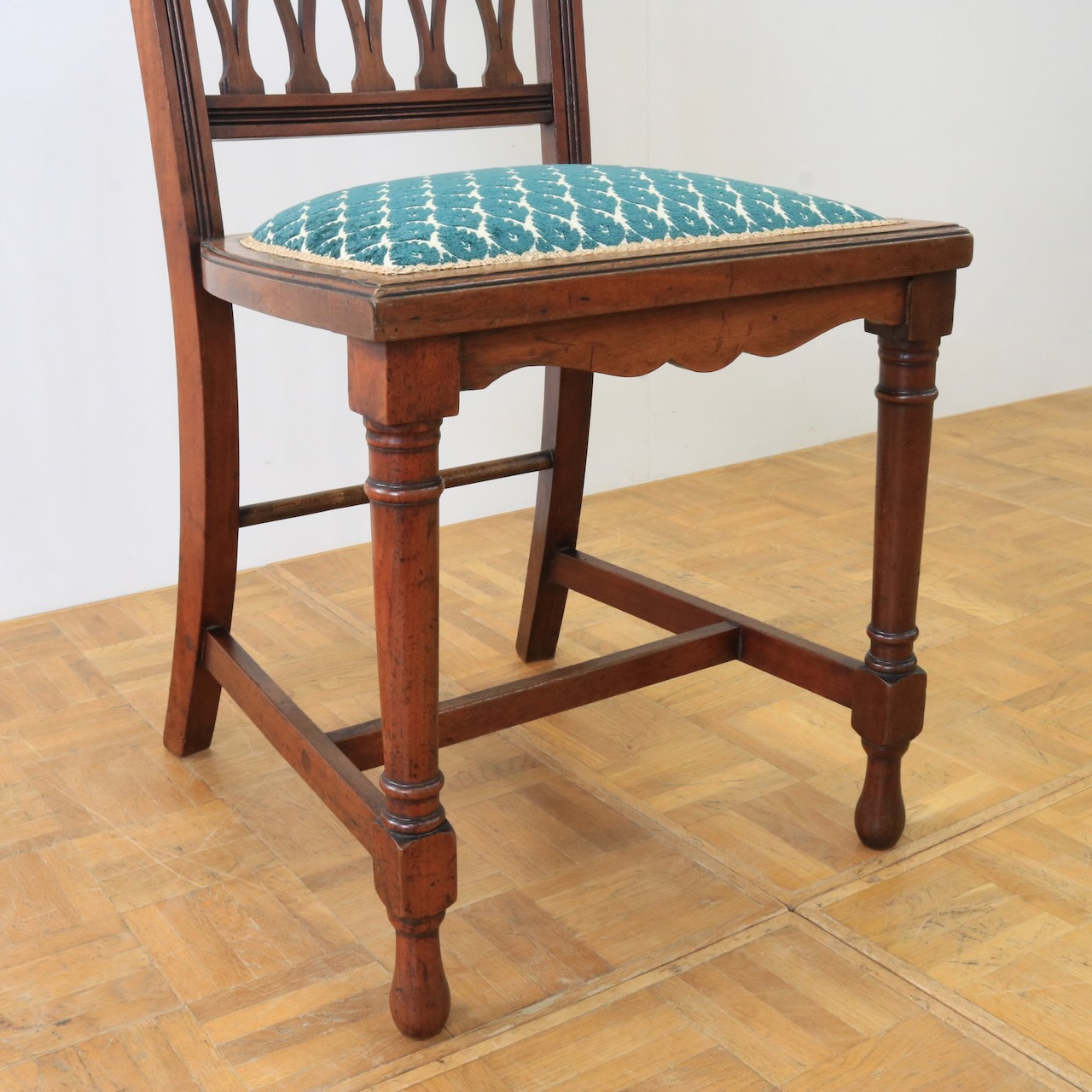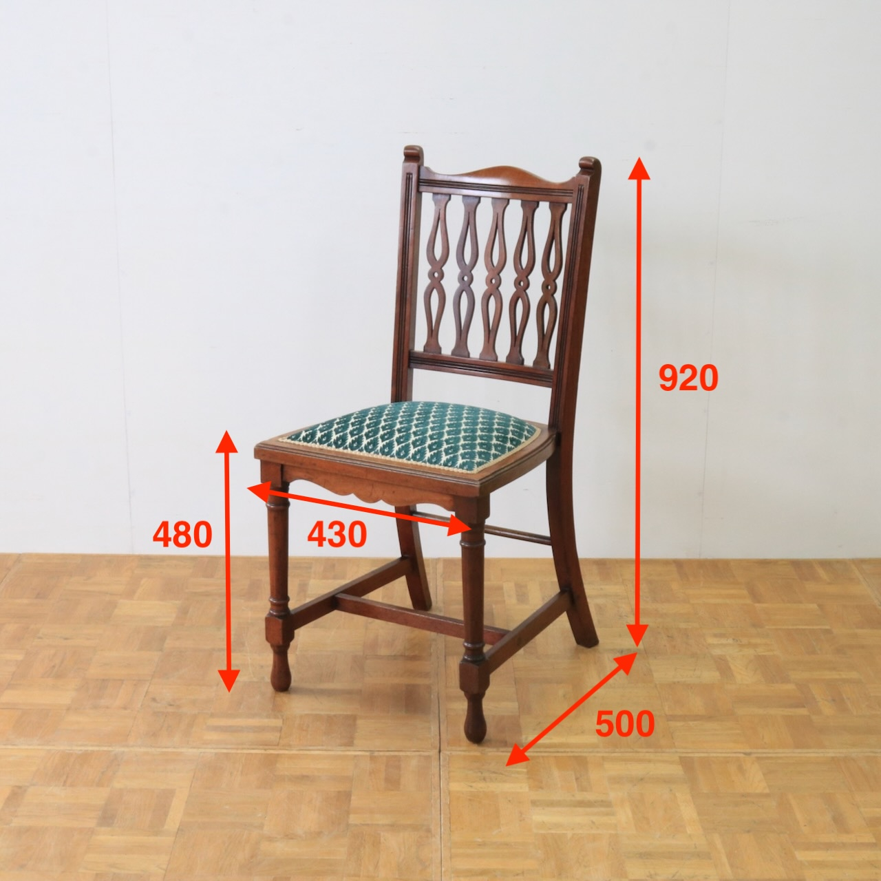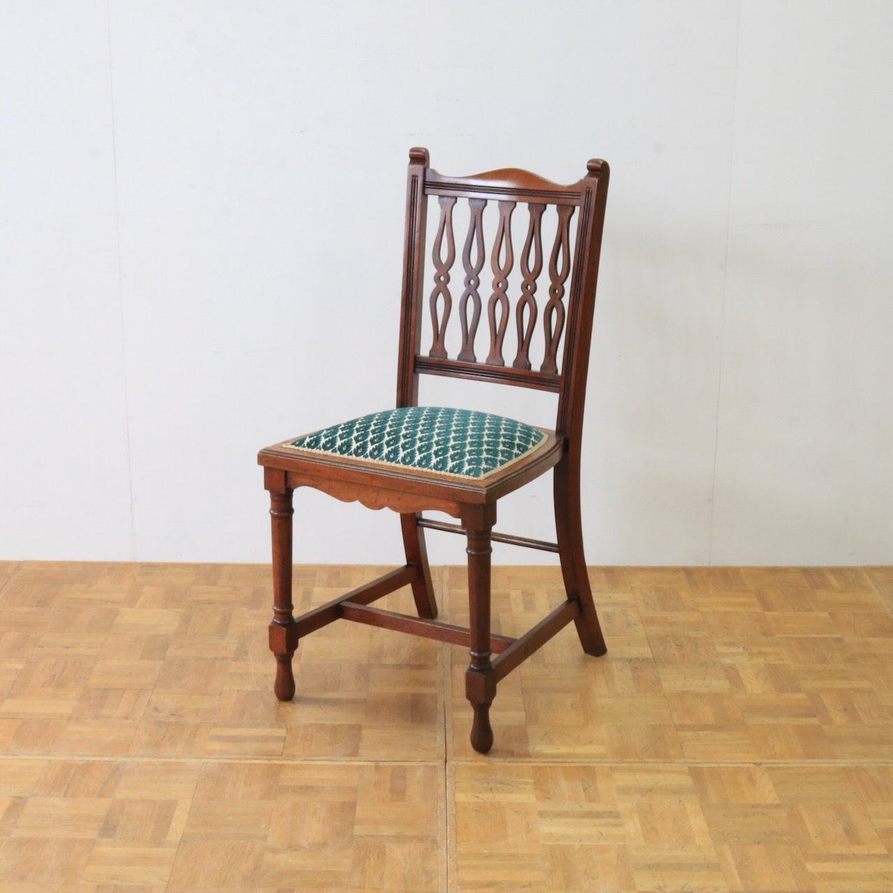 脚元はターニングを用いたデザイン。スラリとしたシルエットと緩やかな弧を描く装飾のコントラストが美しいアンティークチェアーです。