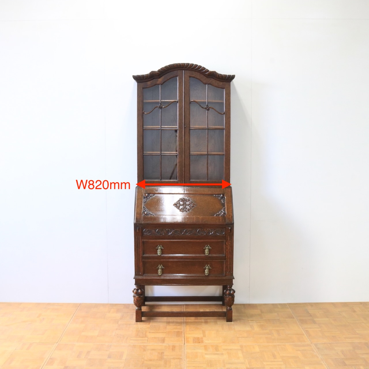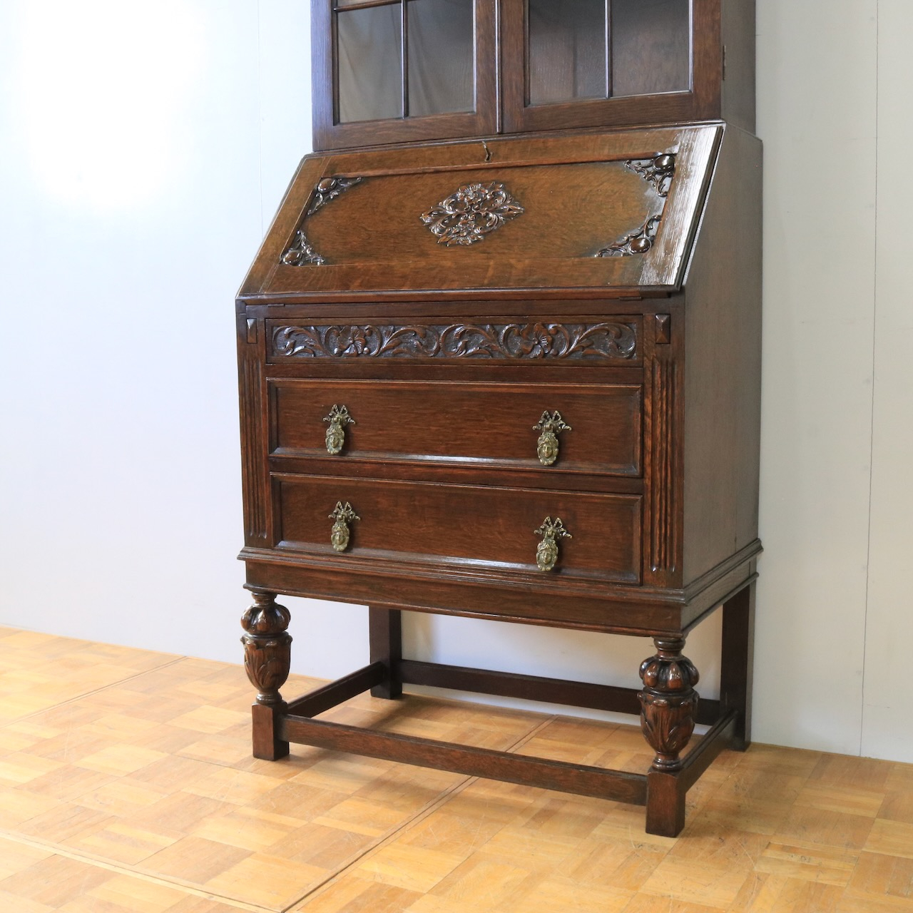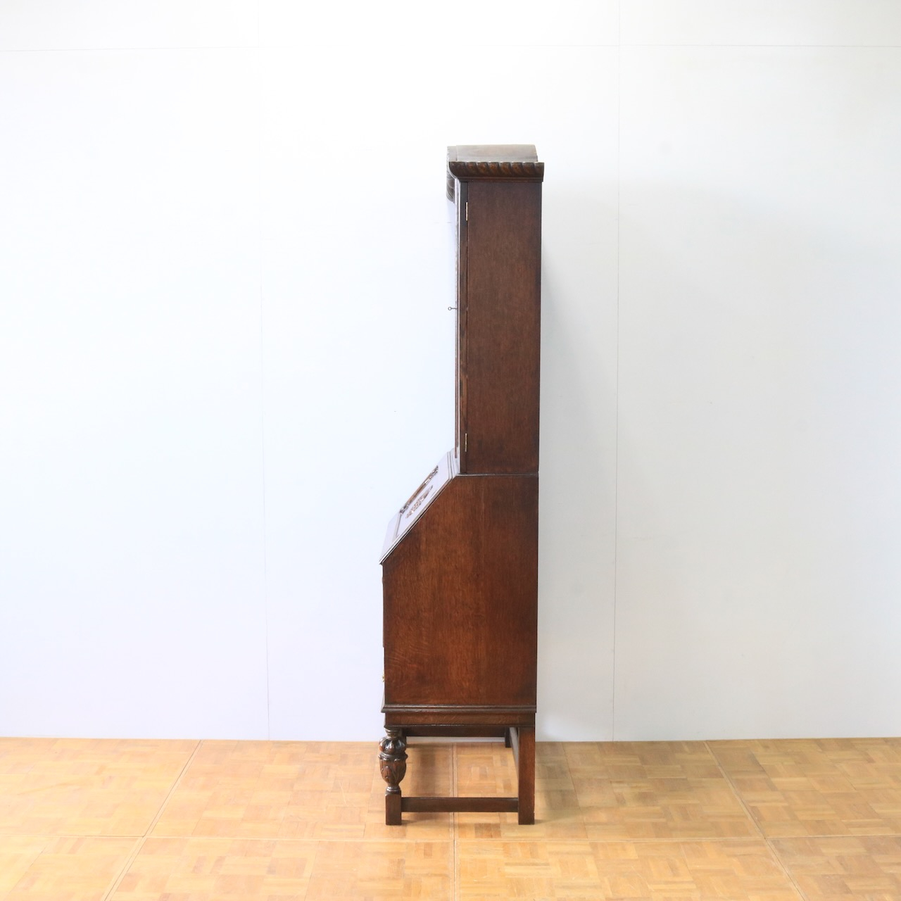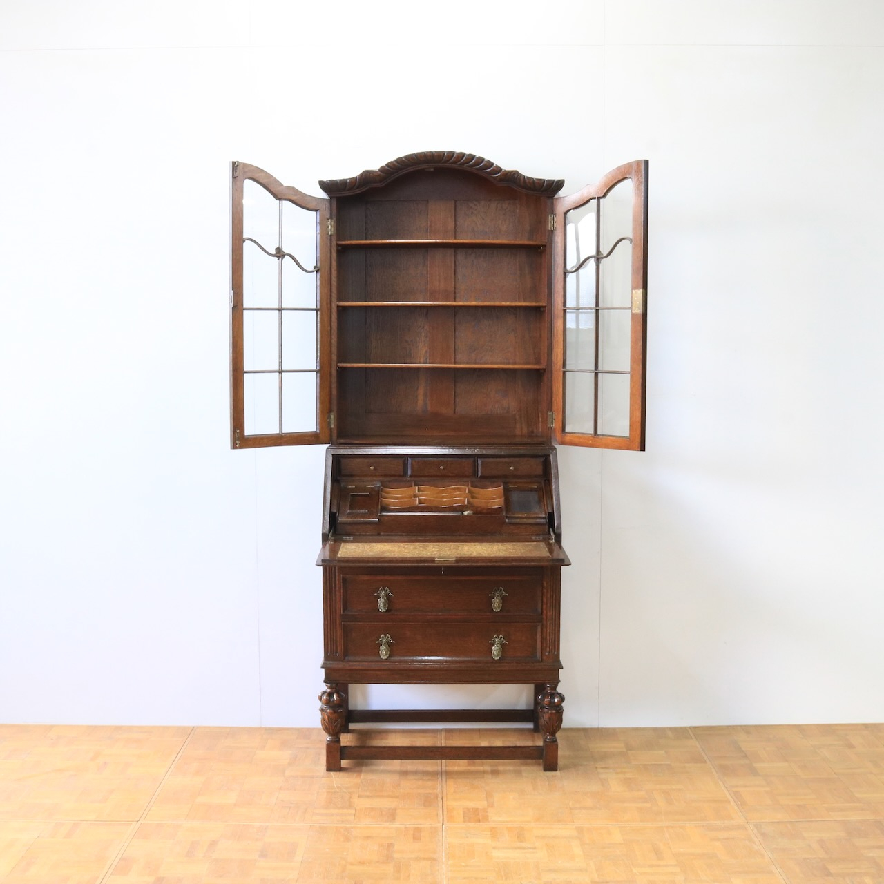 優雅な曲線と彫刻が目を引くアンティークビューローブックケース。深みのあるオーク材の木肌が、書斎やリビングに落ち着いた趣をもたらします。収納とライティングスペースを兼ね備えた、実用的な逸品。