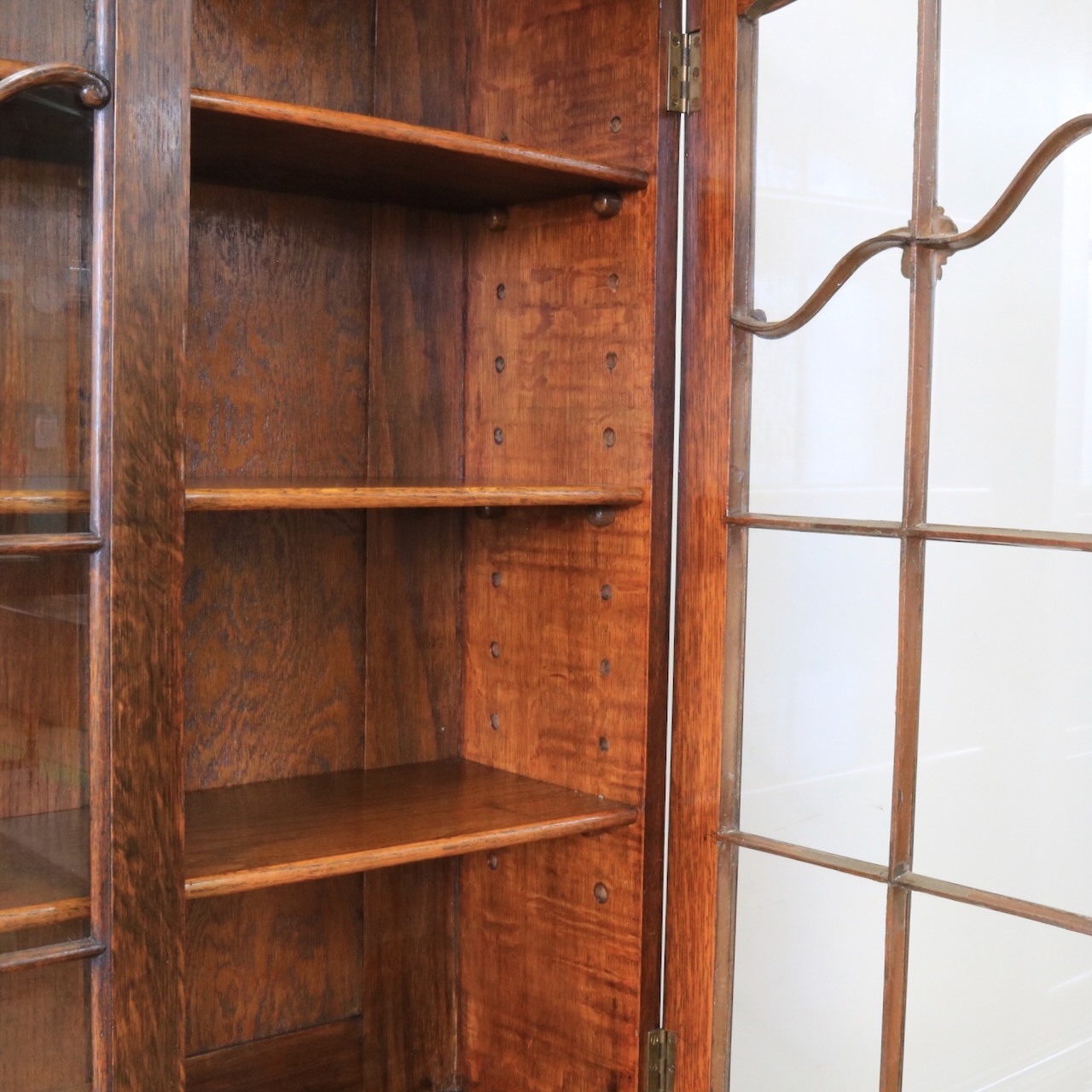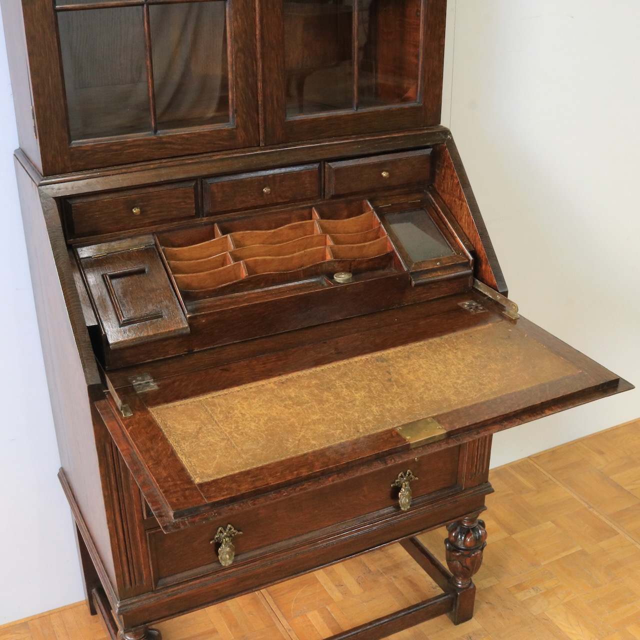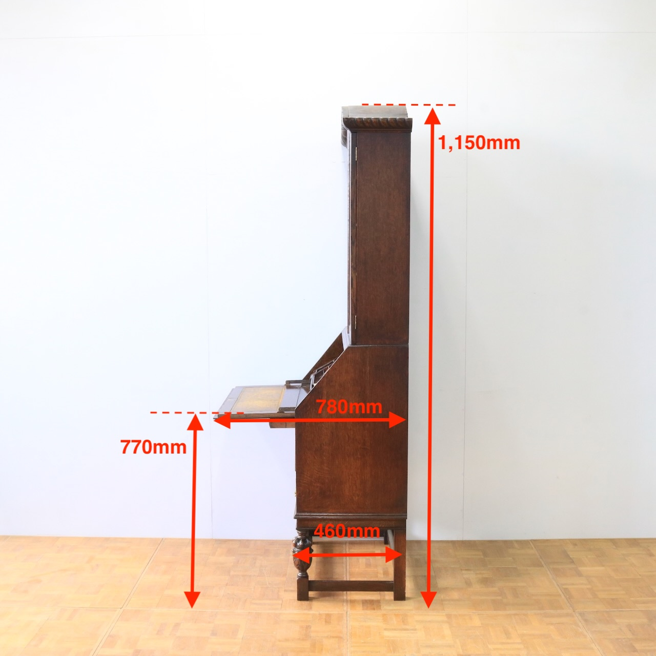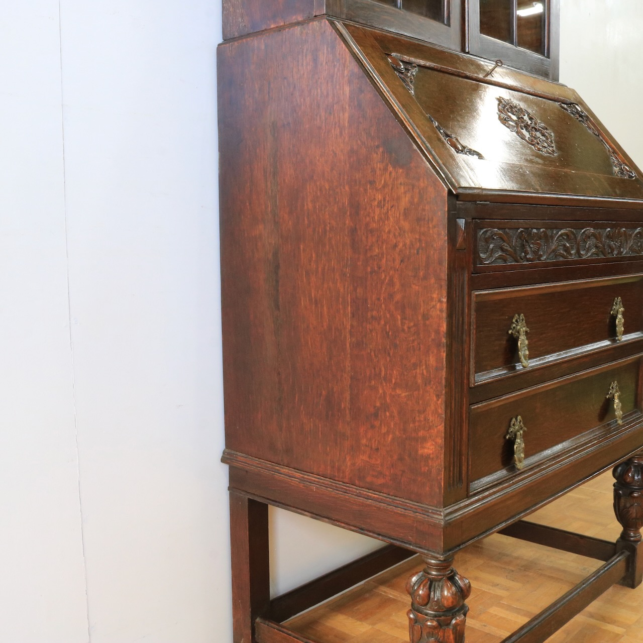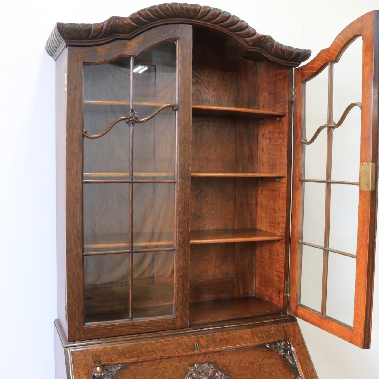 優雅な曲線と彫刻が目を引くアンティークビューローブックケース。深みのあるオーク材の木肌が、書斎やリビングに落ち着いた趣をもたらします。収納とライティングスペースを兼ね備えた、実用的な逸品。