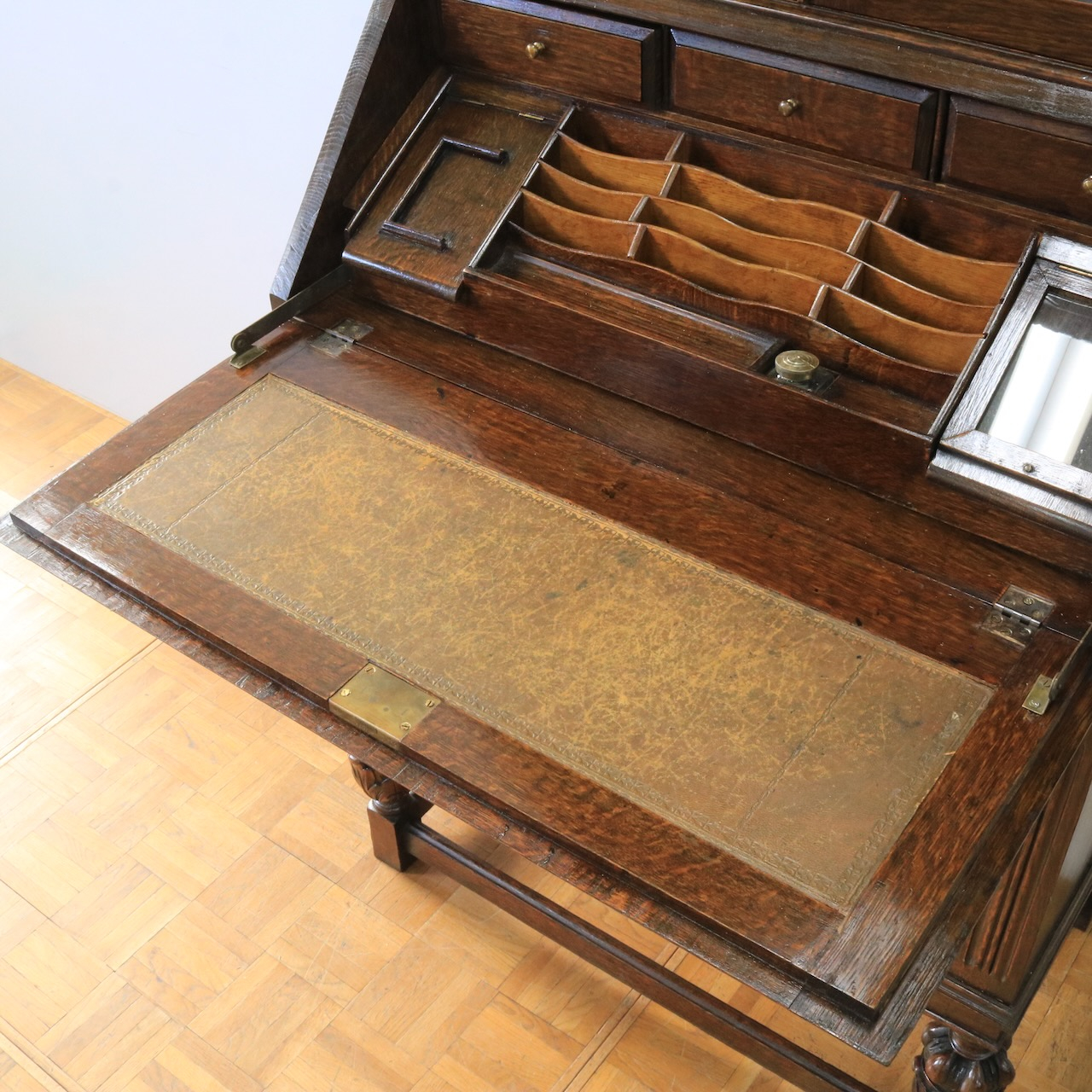脚元はオーク材の家具によく見られるブルボースレッグ。アカンサスの葉が深く彫り出されています。