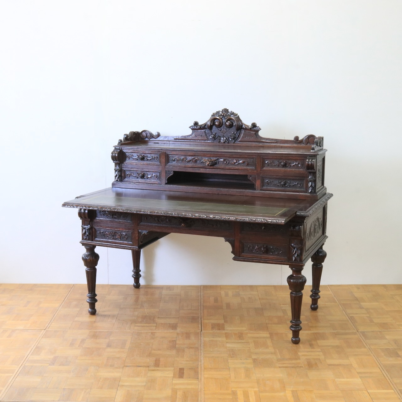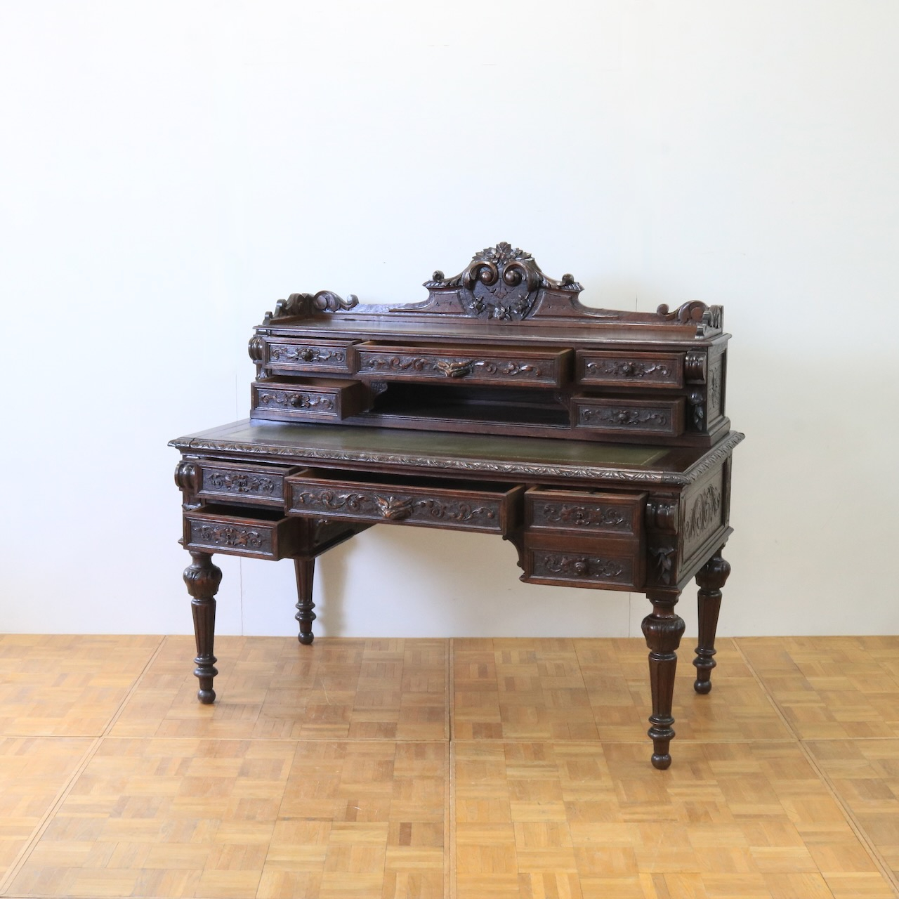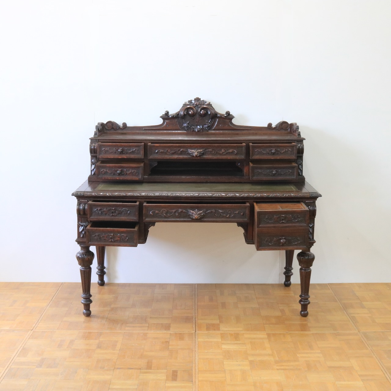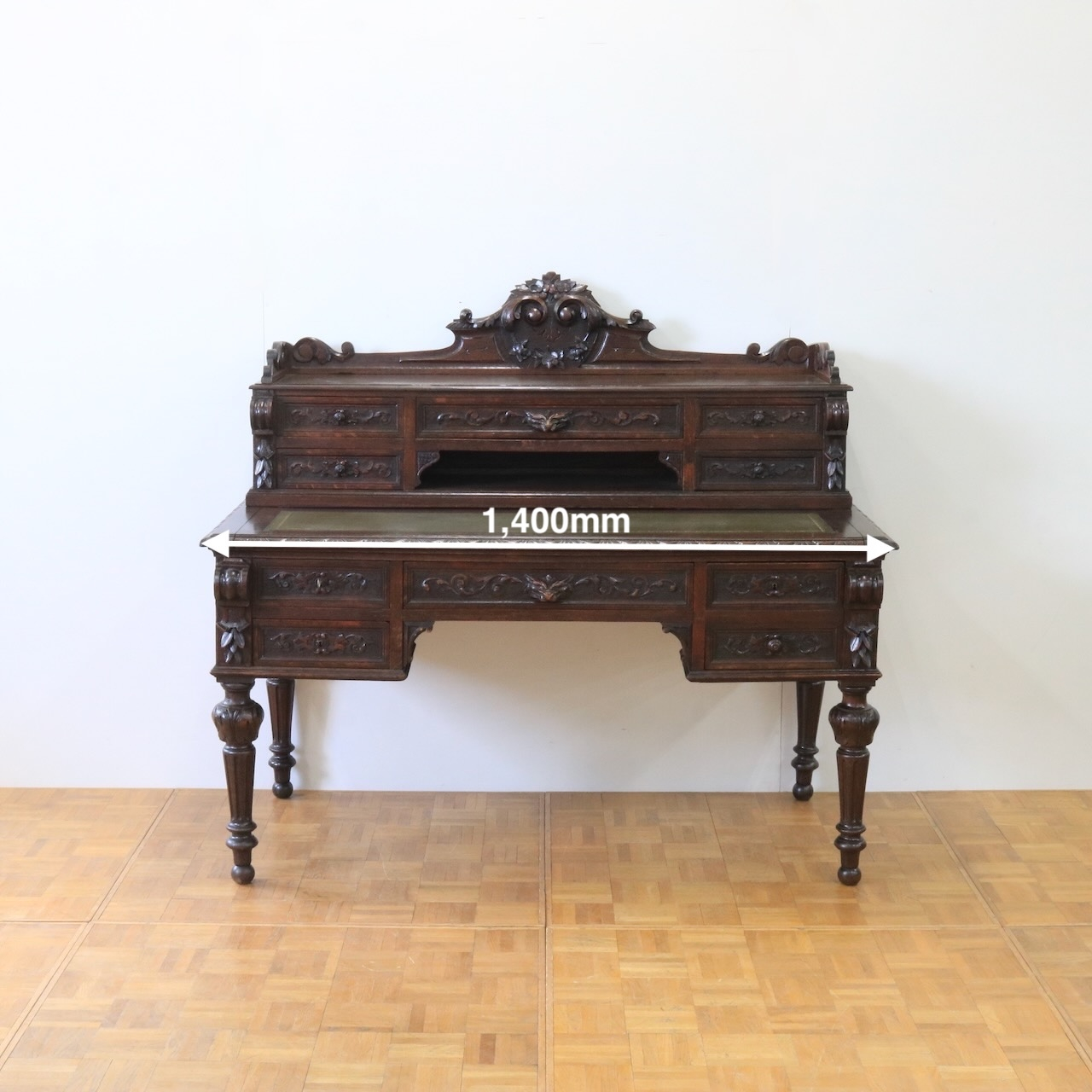 トップから脚先に至るまでレリーフが施された英国アンティークならではの重厚な佇まいのひと品。中央引き出しの引き手がライオンのモチーフになっています。重厚なレリーフは天板縁やサイドにも施され、横から見た時の姿も美しくデザインされており、クオリティの高いライティングデスクです。