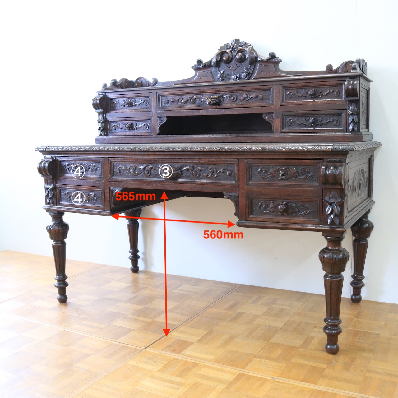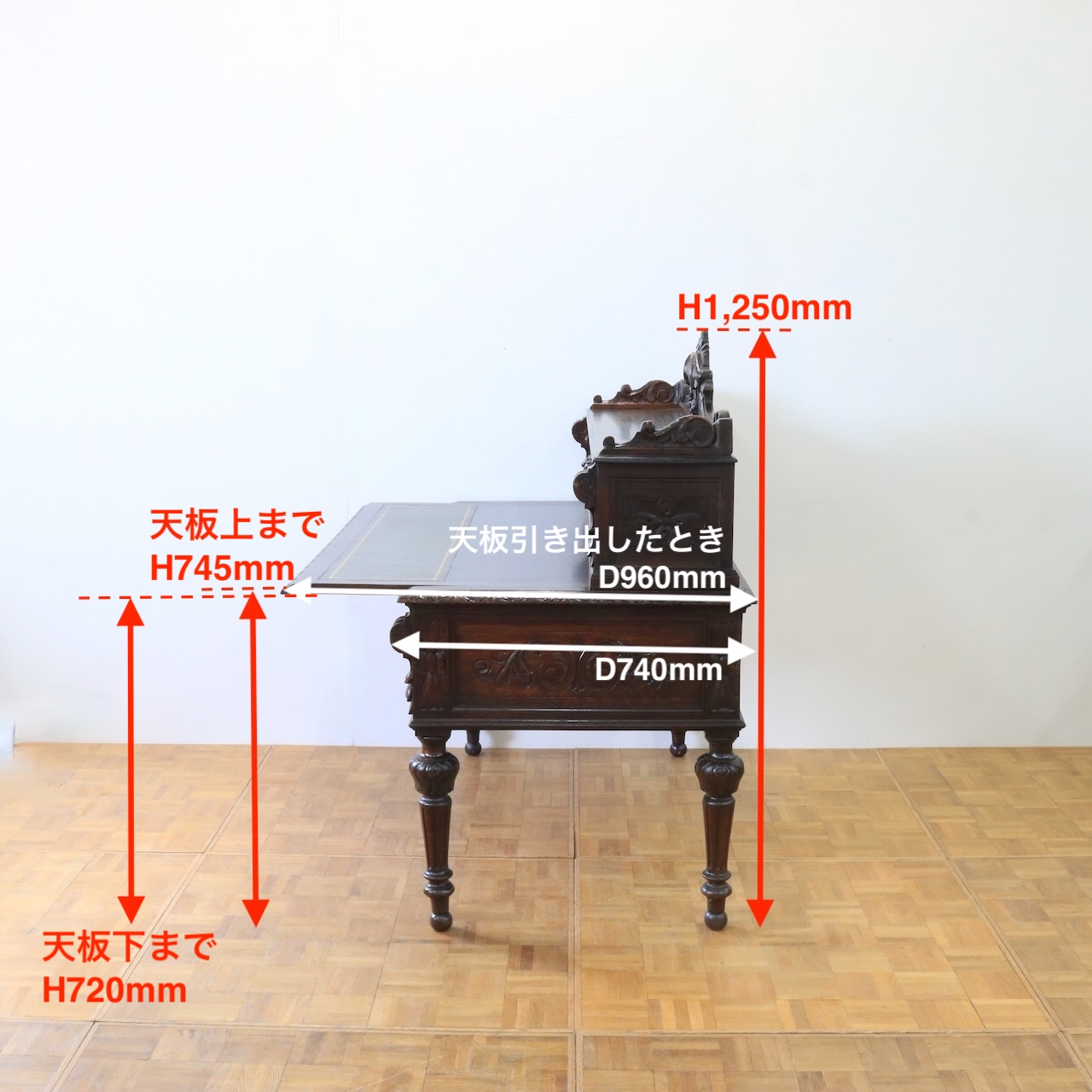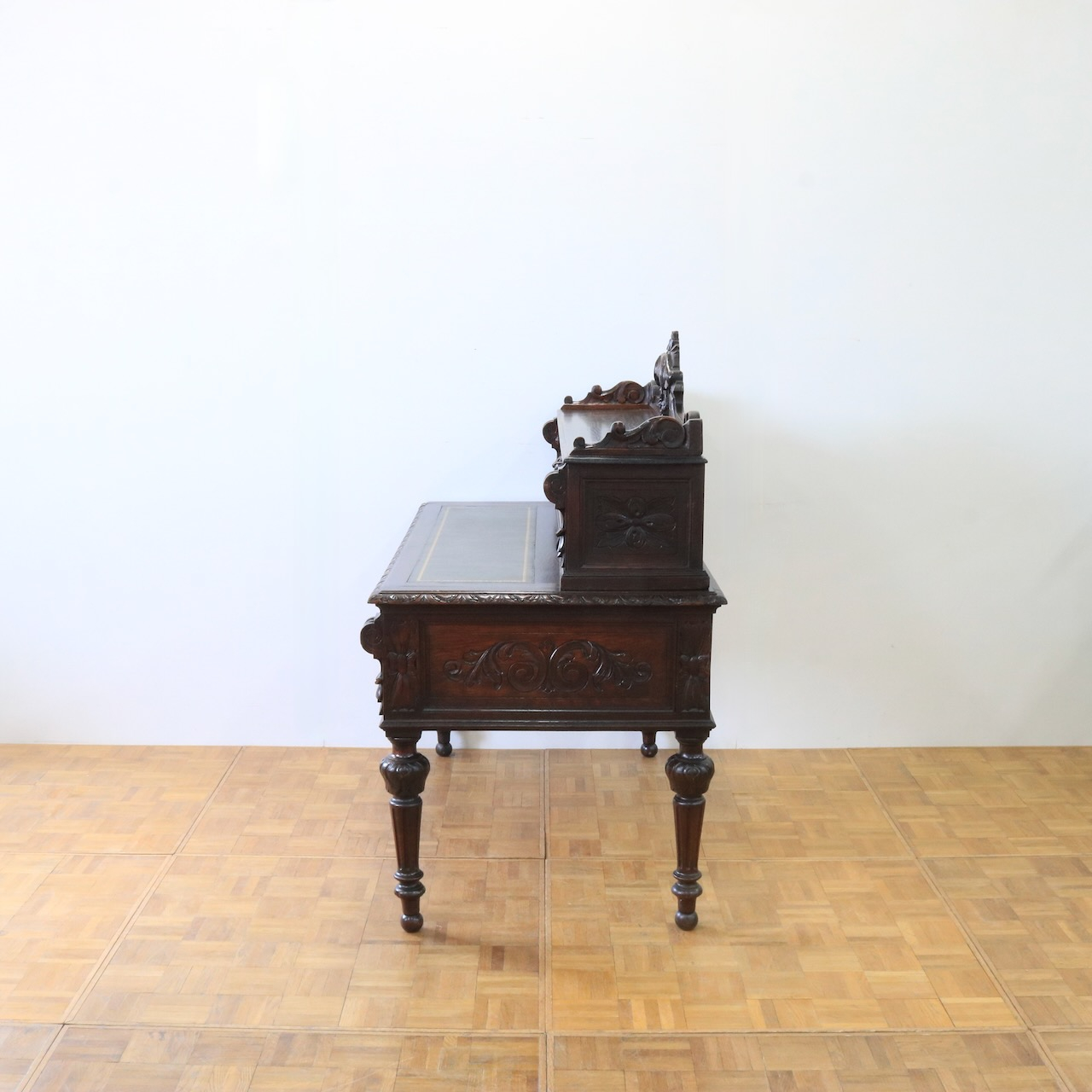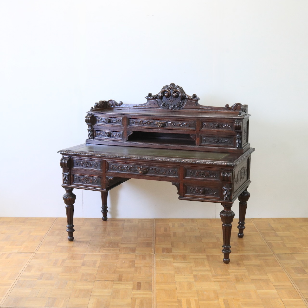 トップから脚先に至るまでレリーフが施された英国アンティークならではの重厚な佇まいのひと品。中央引き出しの引き手がライオンのモチーフになっています。重厚なレリーフは天板縁やサイドにも施され、横から見た時の姿も美しくデザインされており、クオリティの高いライティングデスクです。