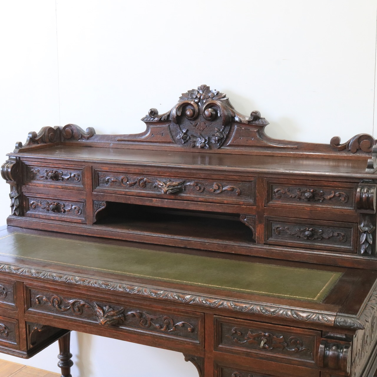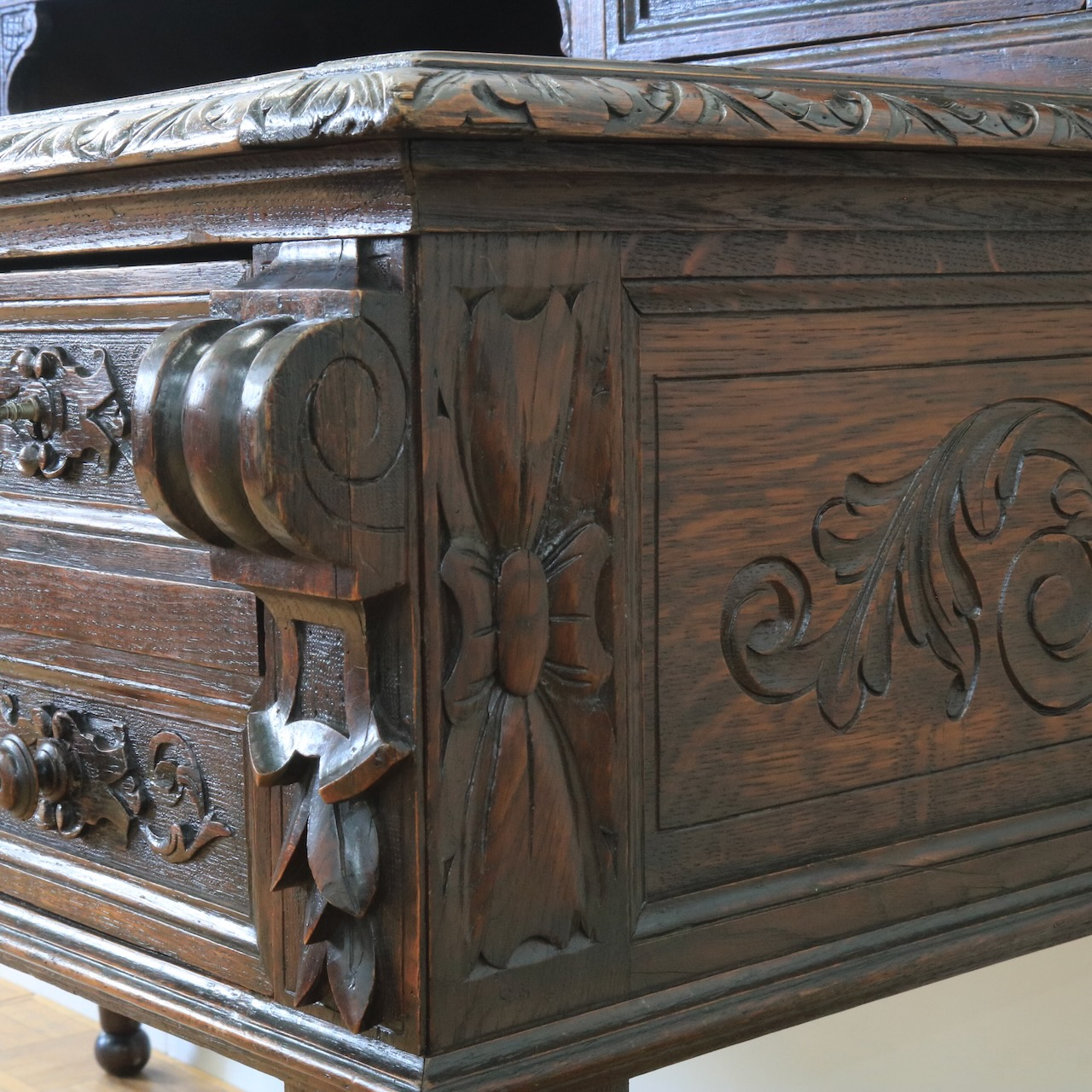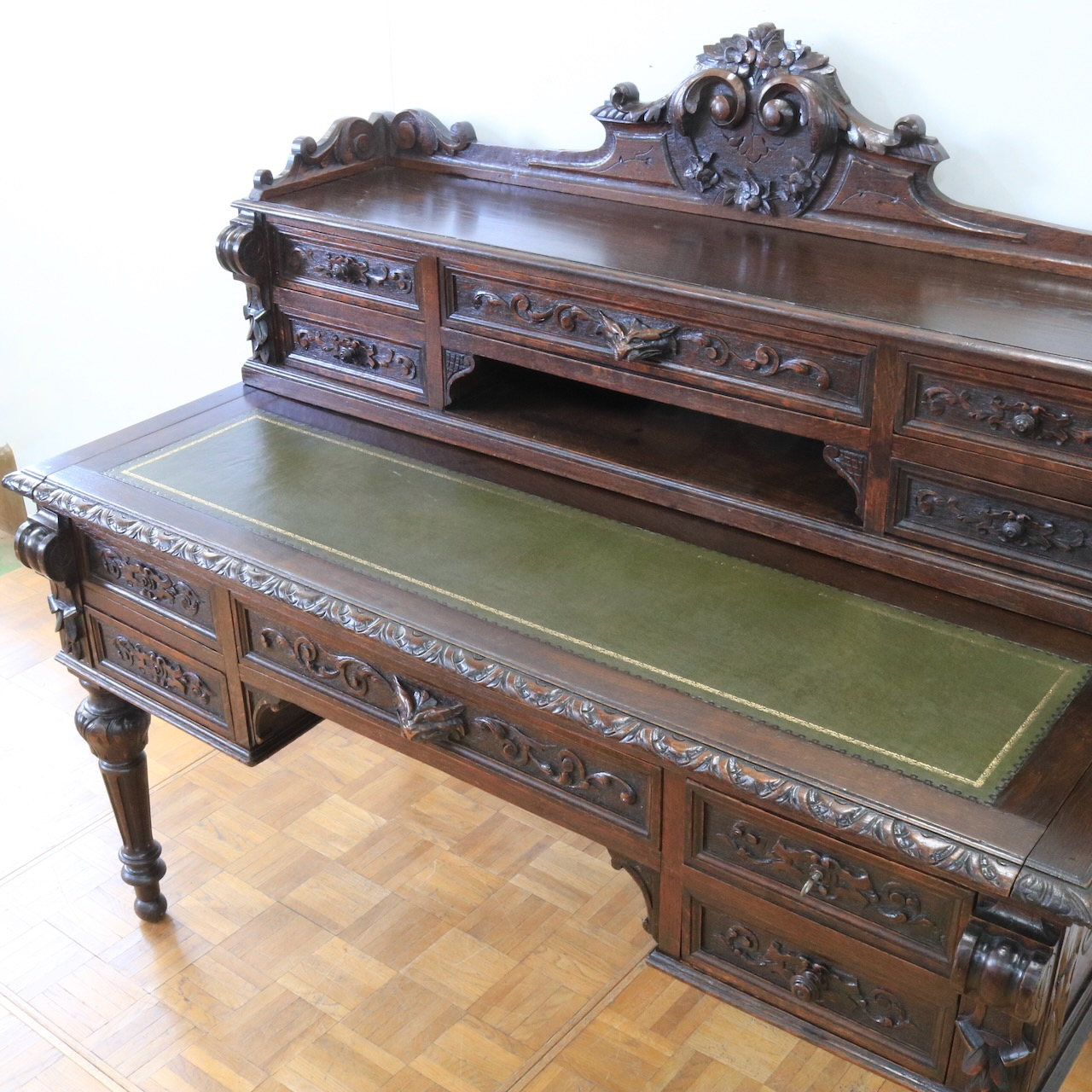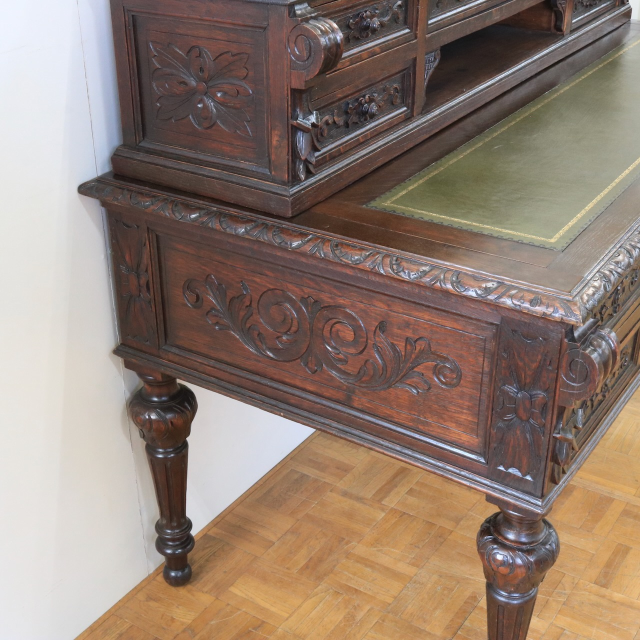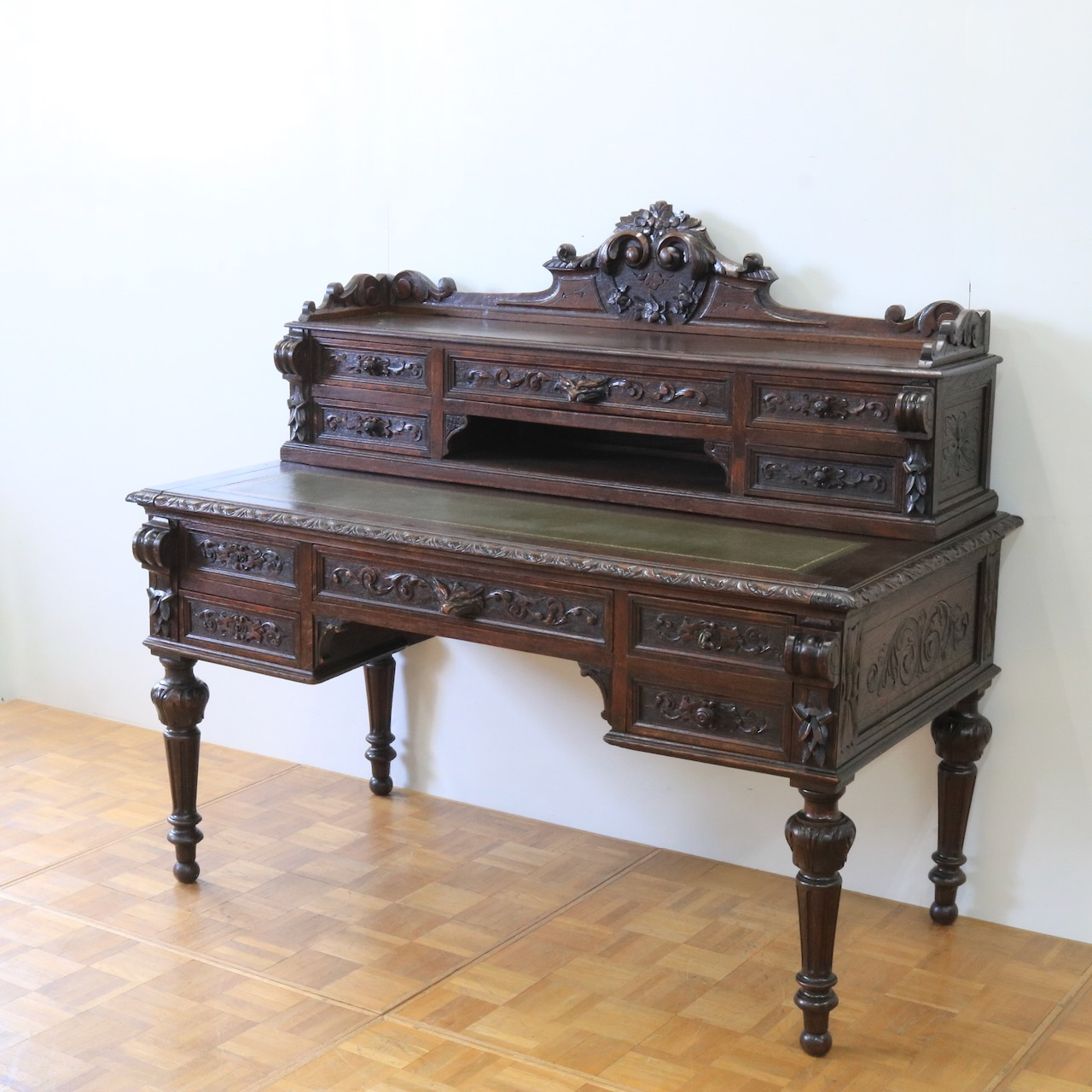 トップから脚先に至るまでレリーフが施された英国アンティークならではの重厚な佇まいのひと品。中央引き出しの引き手がライオンのモチーフになっています。重厚なレリーフは天板縁やサイドにも施され、横から見た時の姿も美しくデザインされており、クオリティの高いライティングデスクです。