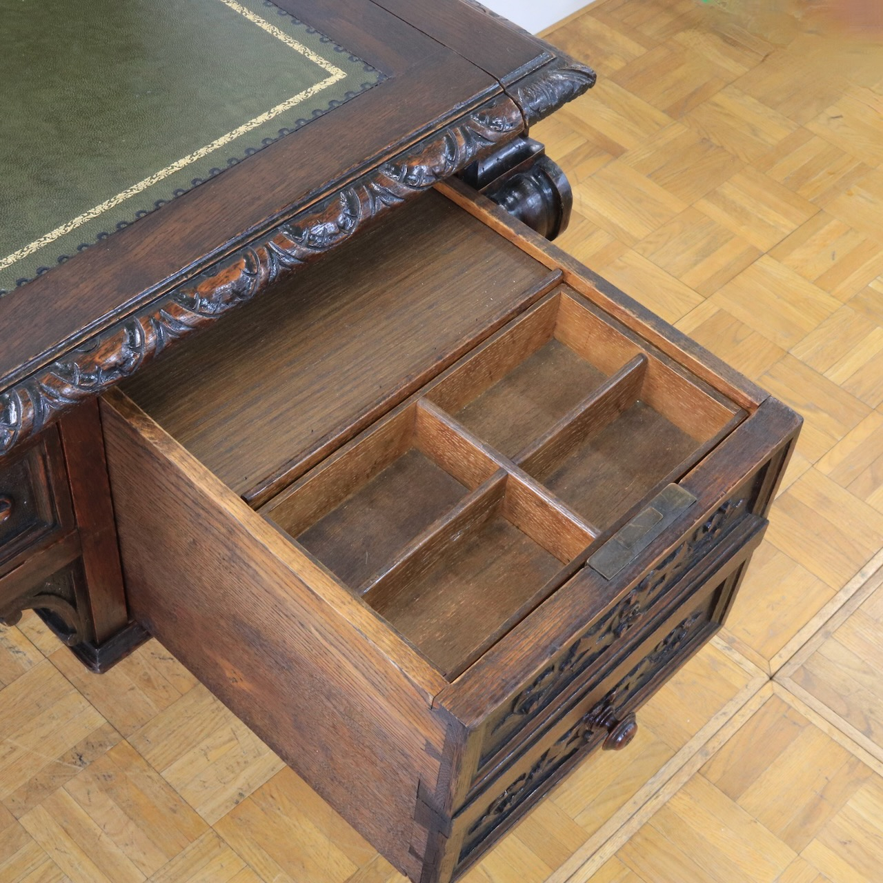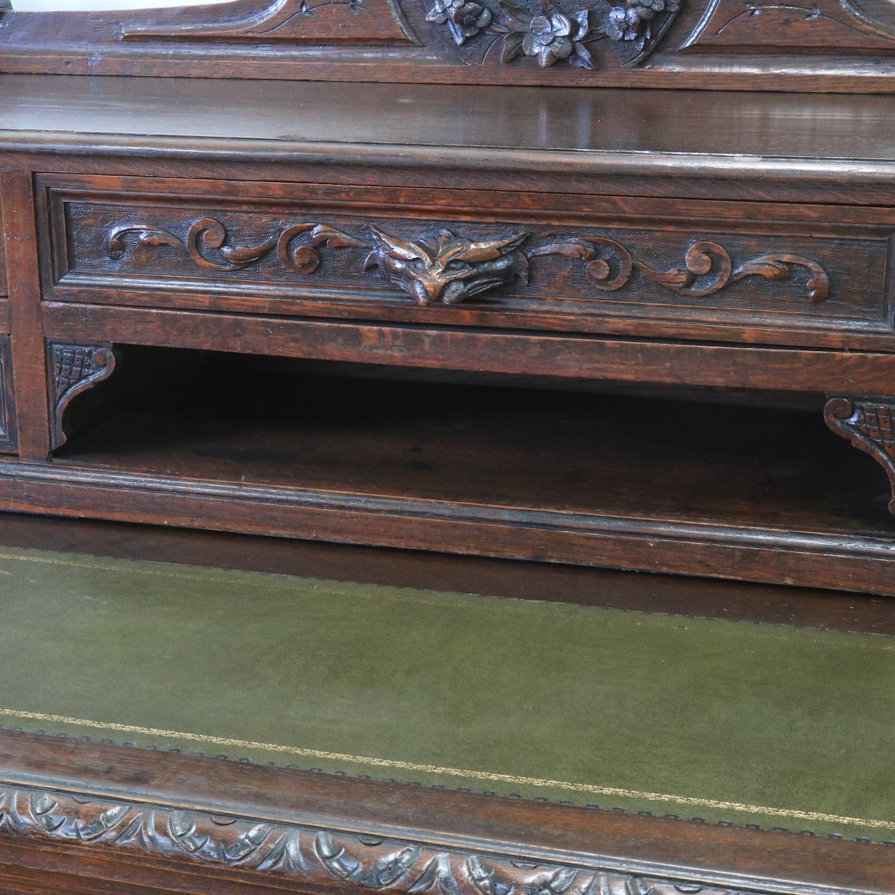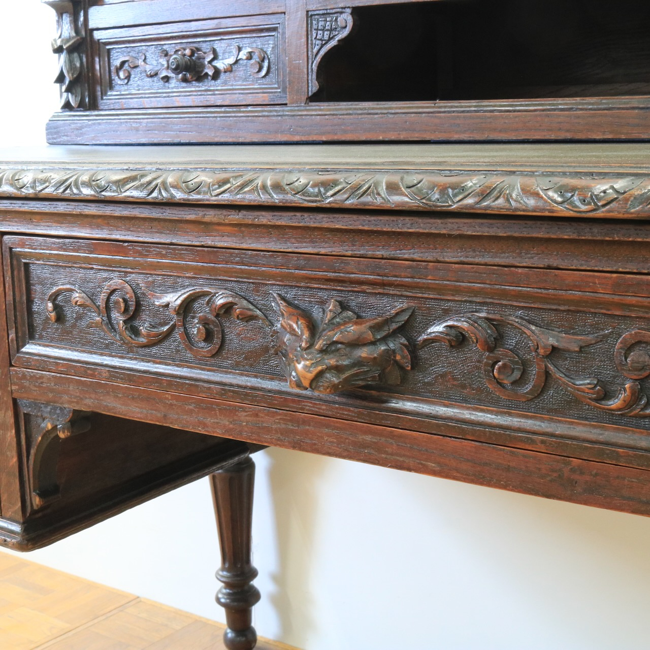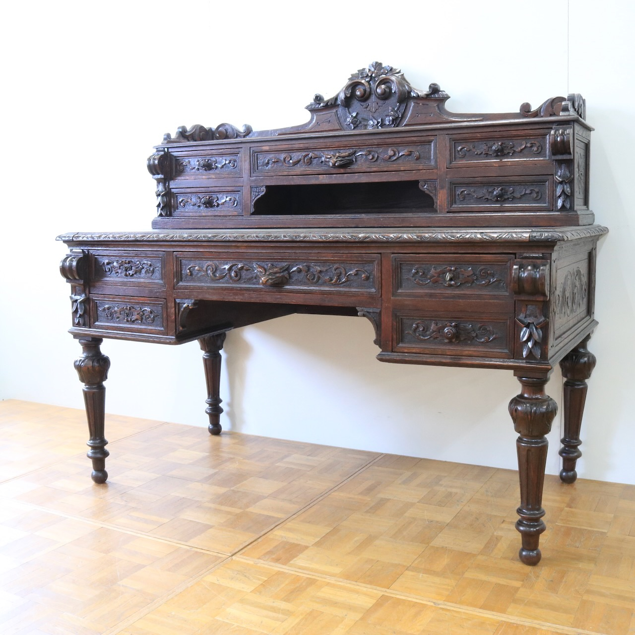 トップから脚先に至るまでレリーフが施された英国アンティークならではの重厚な佇まいのひと品。中央引き出しの引き手がライオンのモチーフになっています。重厚なレリーフは天板縁やサイドにも施され、横から見た時の姿も美しくデザインされており、クオリティの高いライティングデスクです。