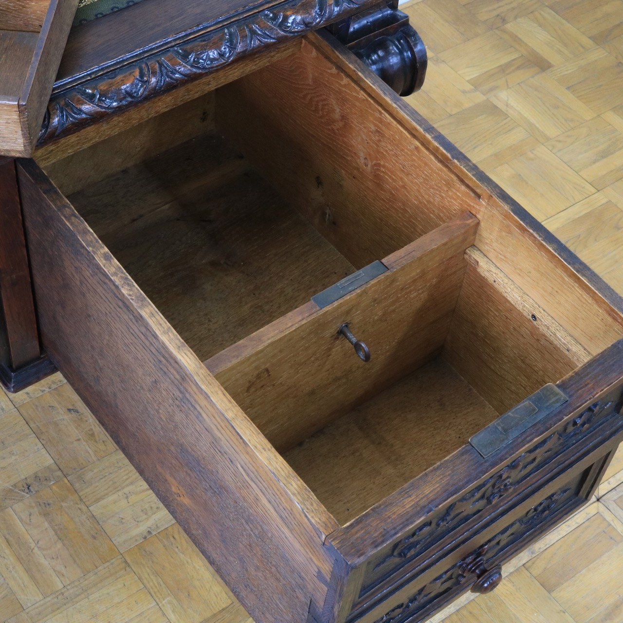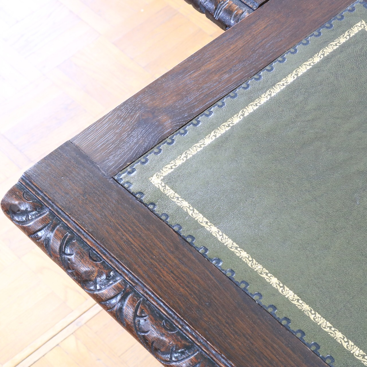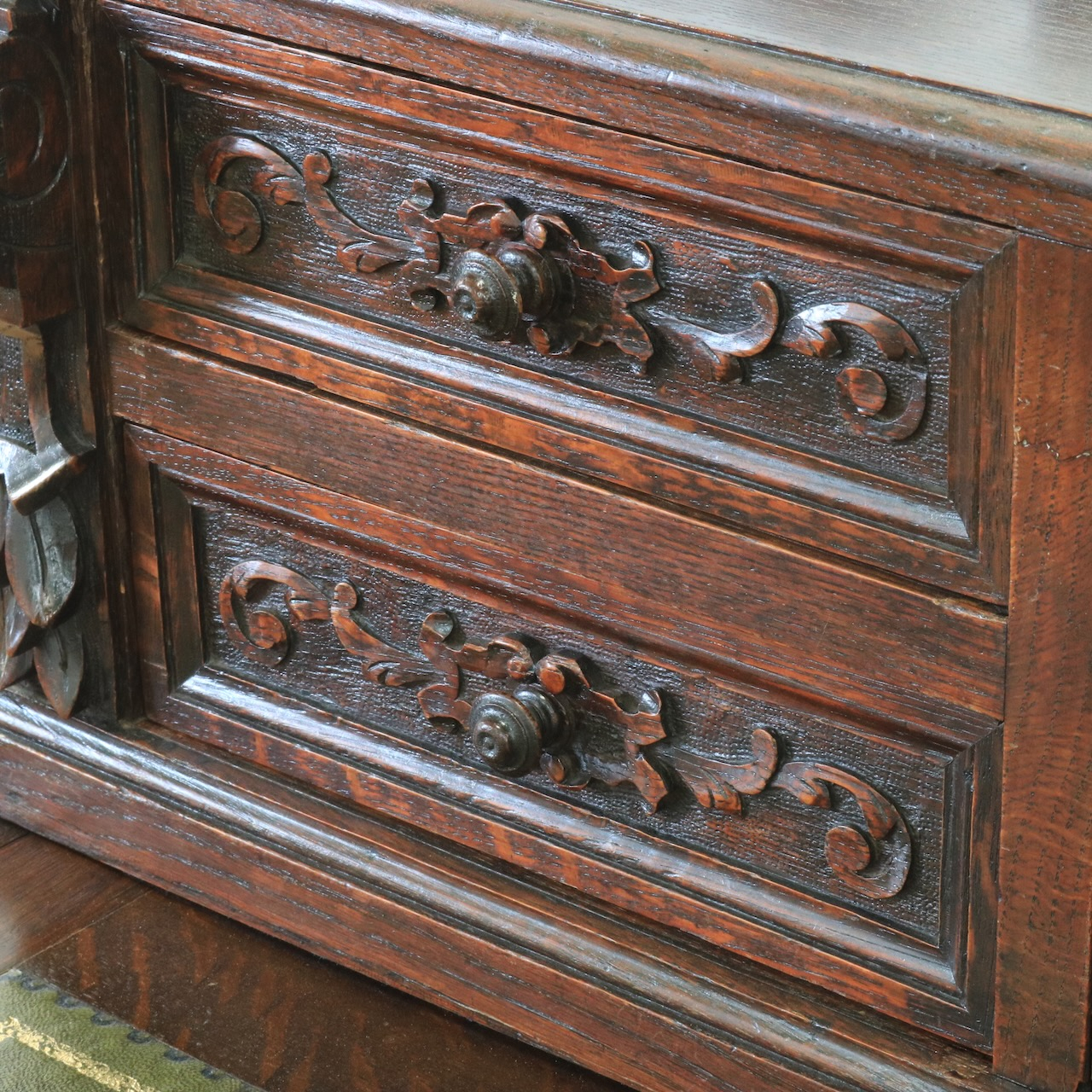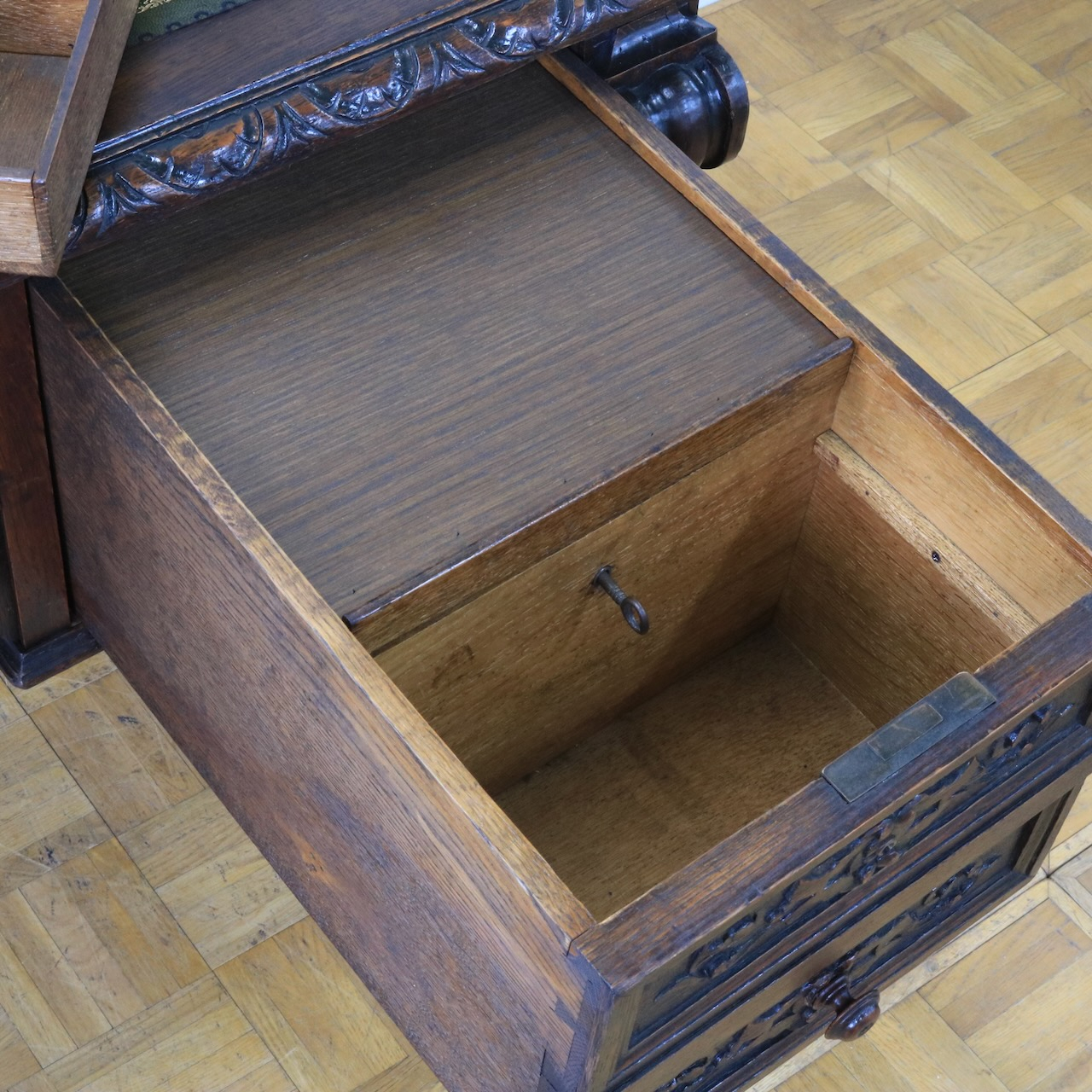 トップから脚先に至るまでレリーフが施された英国アンティークならではの重厚な佇まいのひと品。中央引き出しの引き手がライオンのモチーフになっています。重厚なレリーフは天板縁やサイドにも施され、横から見た時の姿も美しくデザインされており、クオリティの高いライティングデスクです。