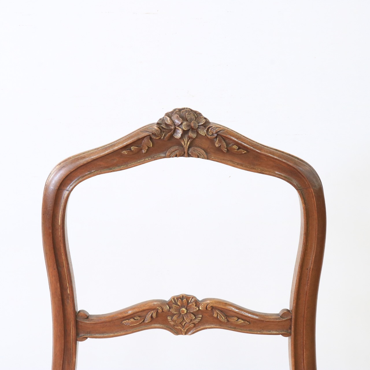 脚元にもお花の彫刻が。スラリとしたガブリオールレッグとの相性も良く、脚先まで技巧が凝らされたアンティークチェアーです。