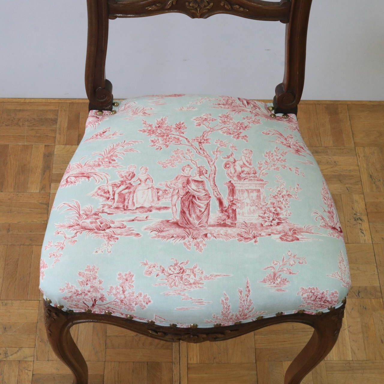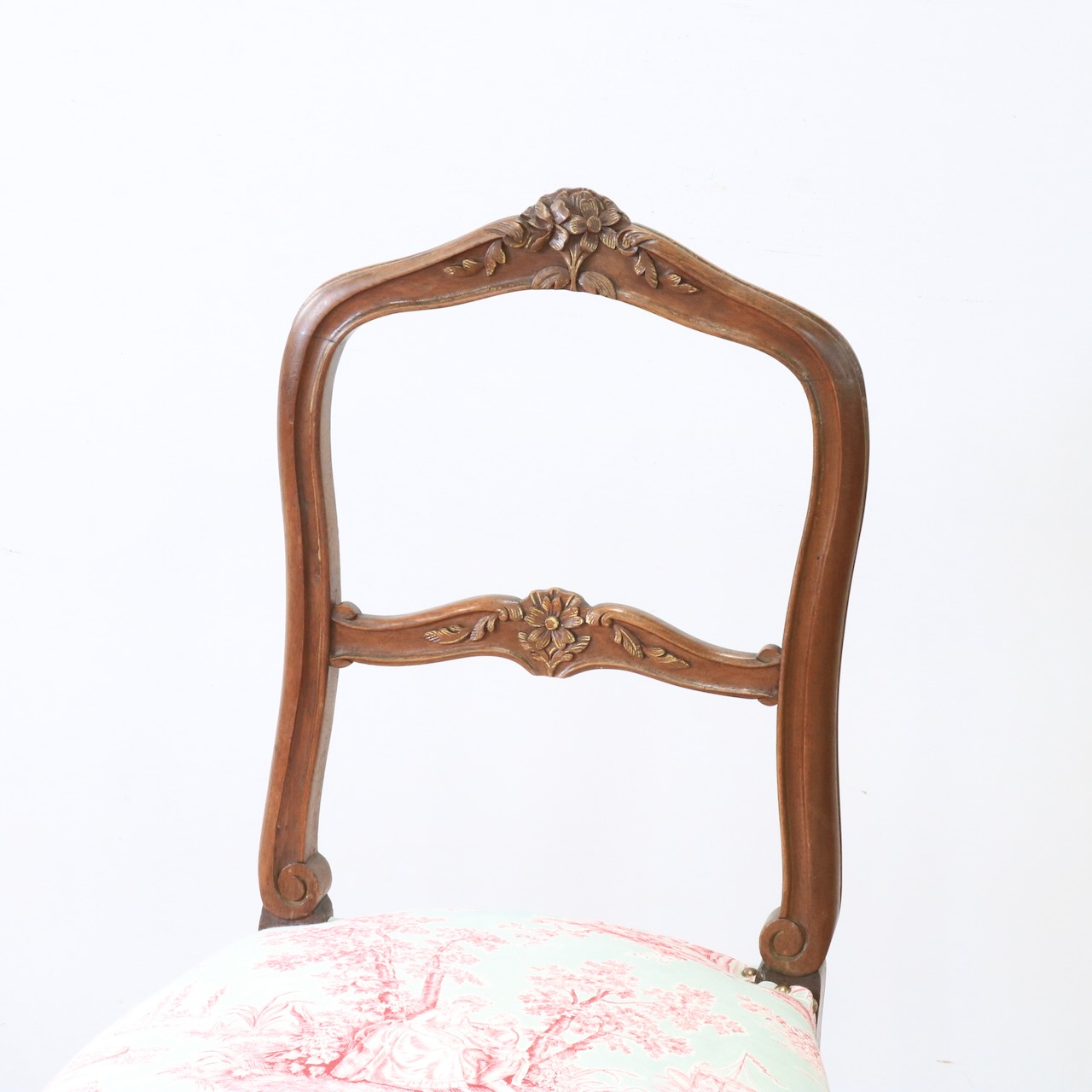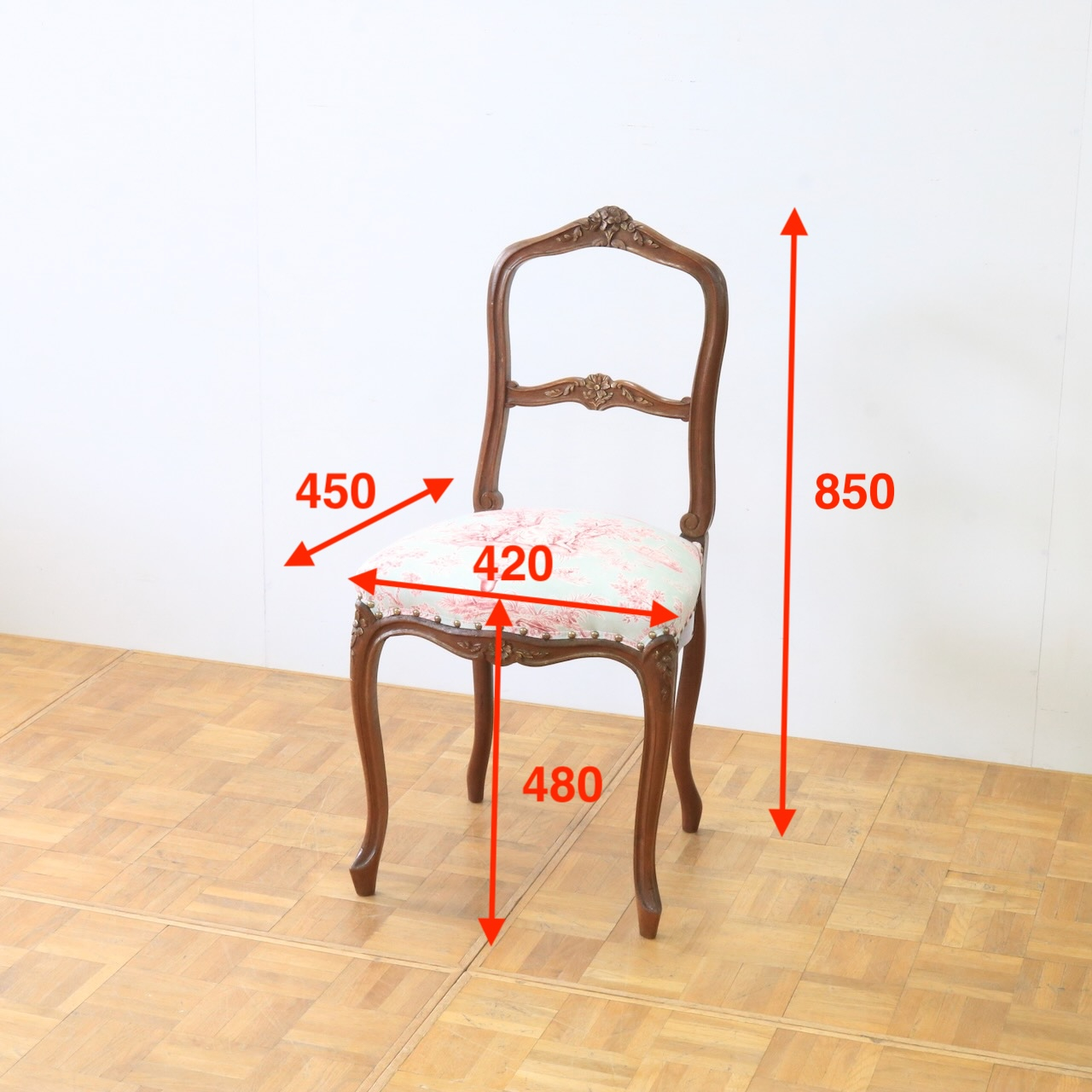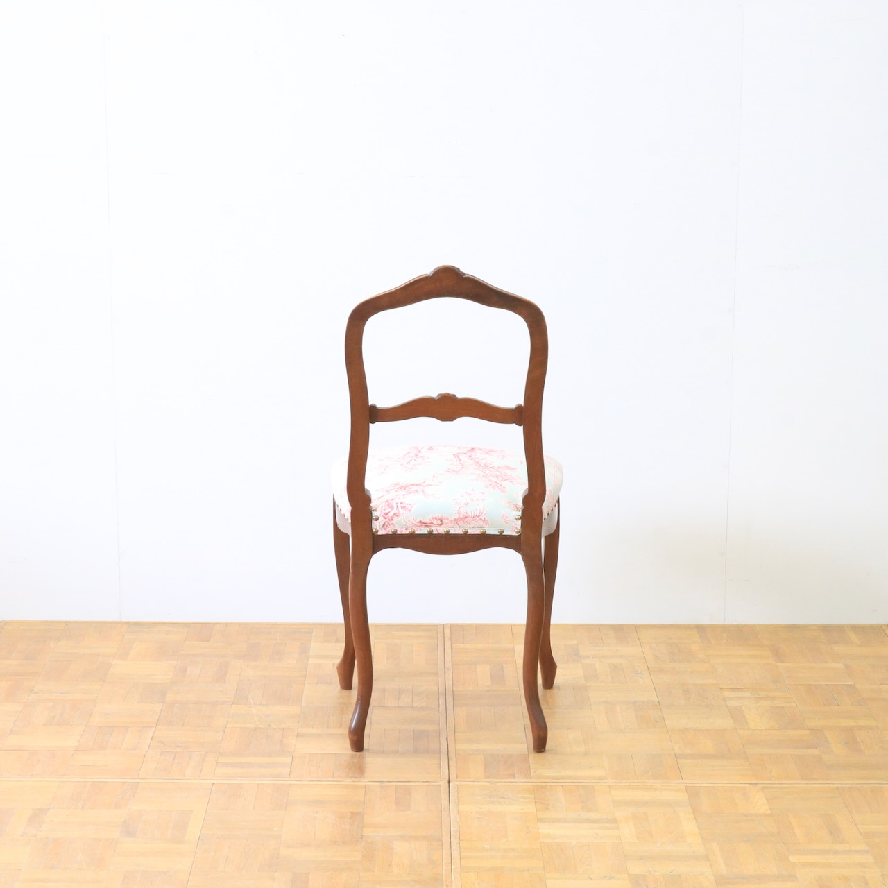 配送料の目安 ▶︎1930年代、オーク材のフレンチチェアー。エレガントなフラワーモチーフがアクセント。座面はトワルドジュイの生地で張り替え、可憐な雰囲気に仕上げました。