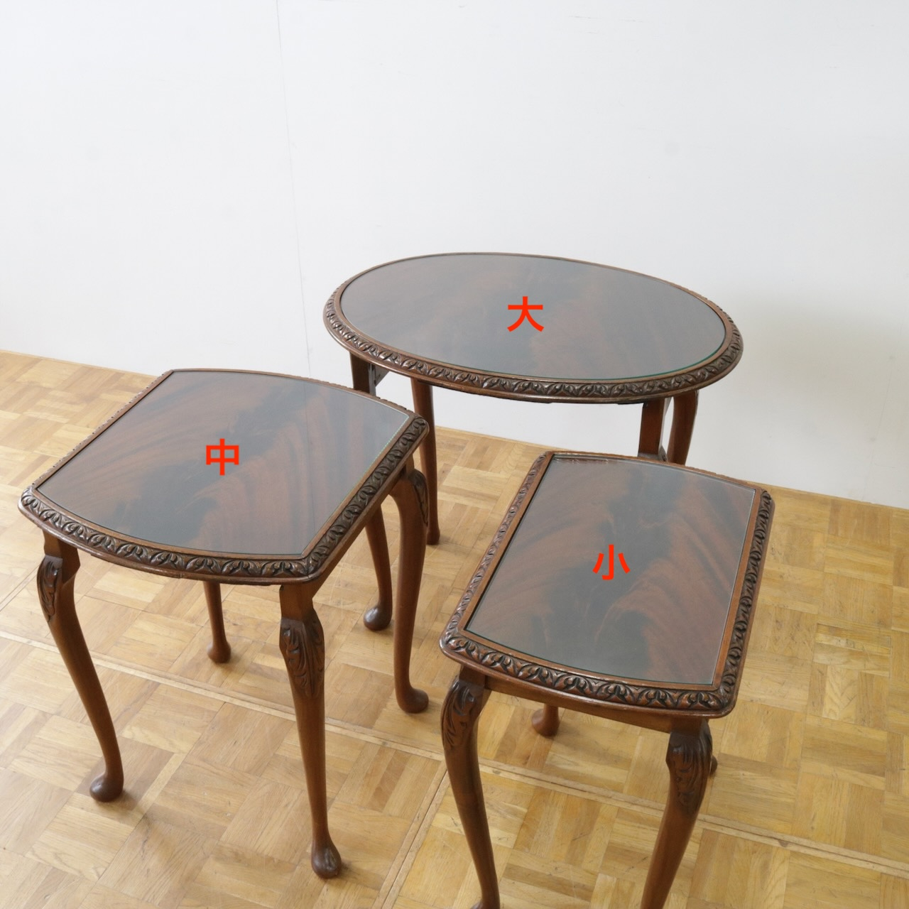 イギリス製マホガニーの入れ子式テーブル。ネストテーブルの名前の通り3台が一つにセットされた機能的なスモールテーブルです。セットインのままでも予めバラしてお部屋でお使い頂くも自由自在。天板はガラストップで水濡れをあまり気にせずお使いいただけます。